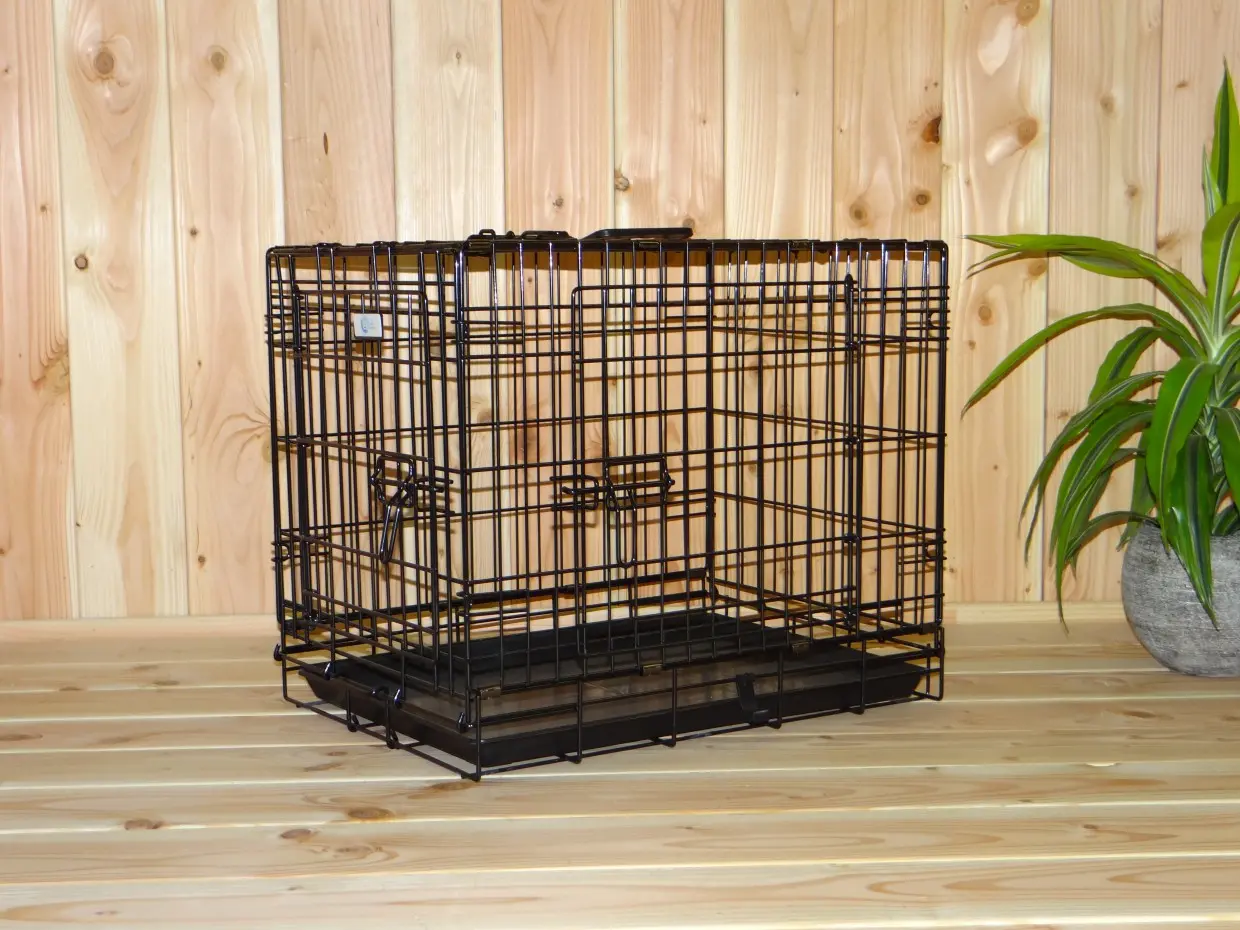 Cage pour chien robuste et noire avec 3 portes. Les dimensions de cette cage pour chien sont de 63x45x52cm. Cette cage en fil métallique avec des barres épaisses et robustes, revêtues de poudre noire, dispose de 3 portes solides avec des verrous coulissants spéciaux. Une cage pour chien pliable pratique équipée de pieds en caoutchouc antidérapants et d'un bac en plastique amovible. Convient comme cage pour les chiens de petite taille tels que Boomer, Cavalier King Charles Spaniel, Spitz nain, Maltais, Pékinois, Teckel, West Highland White Terrier et Yorkshire Terrier. Notre cage pour chien noire et solide est disponible en 7 tailles différentes : 48cm / [63cm] / 78cm / 93cm / 109cm / 124cm / 136cm.