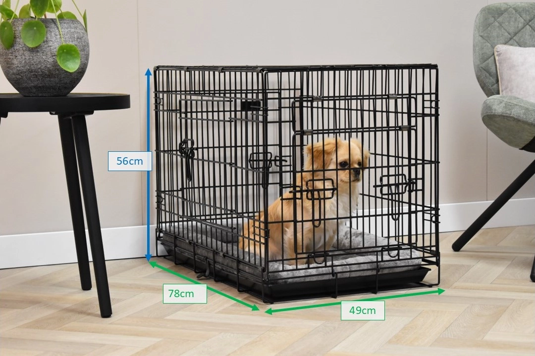 Banc pour chien robuste de 78x49cm. Notre chenil pour chiens à barreaux robustes et épais, revêtus de poudre noire, est doté de 3 portes robustes à fermeture coulissante/pliable. Cette niche pour chien pratique et pliable est également équipée de pieds antidérapants en caoutchouc. La niche pour chien dispose également d'un plateau en plastique amovible. Cette cage est destinée aux races de chiens un peu plus petites : Beagle, Schnauzer nain, Bouledogue français, Pomsky, Springer espagnol gallois et Whippet.