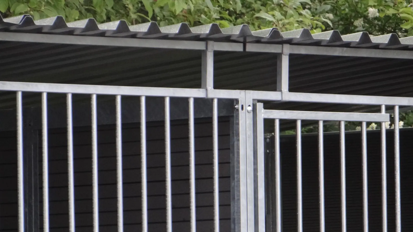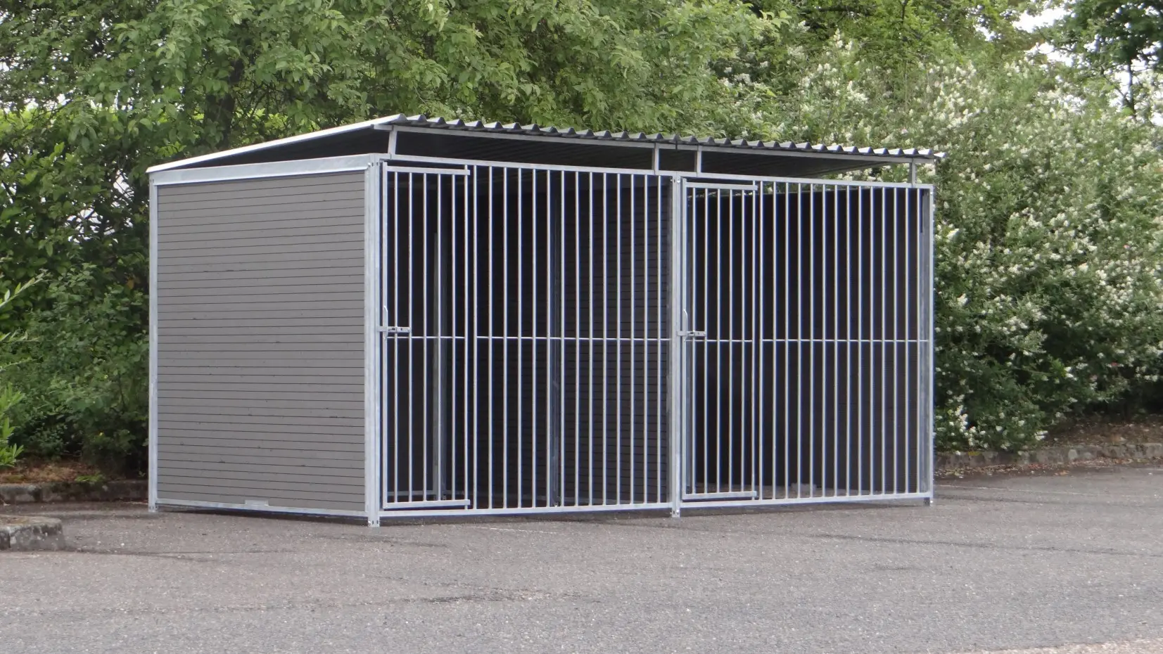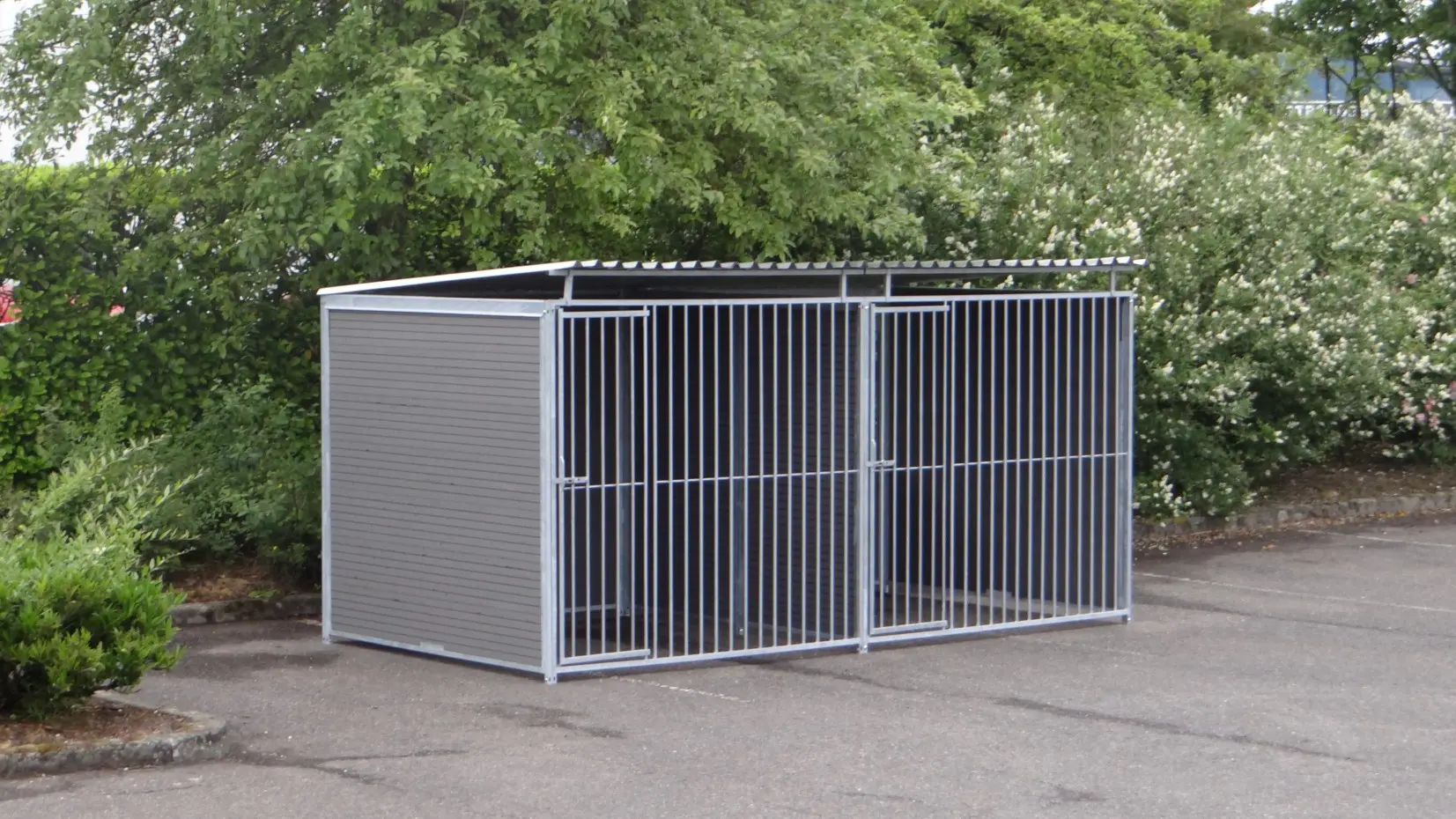 Le chenil double de 4x2m. est équipé avec une toit, des murs de WPC et des portes pour une accessibilité optimale. Normallement, le chenil est disponible par notre grande propre stock.