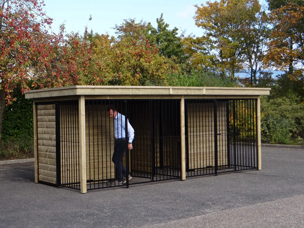 Le chenil COMPART est idéal pour héberger deux chiens tout en les maintenant séparés. Le chenil est équipé de deux niches de nuit et de deux enclos pour chiens. Afin de séparer les chiens, le chenil est doté d’une cloison de séparation. Le magnifique bois d’épicéa imprégné offre une longue durée de vie et ne nécessite aucun entretien supplémentaire.