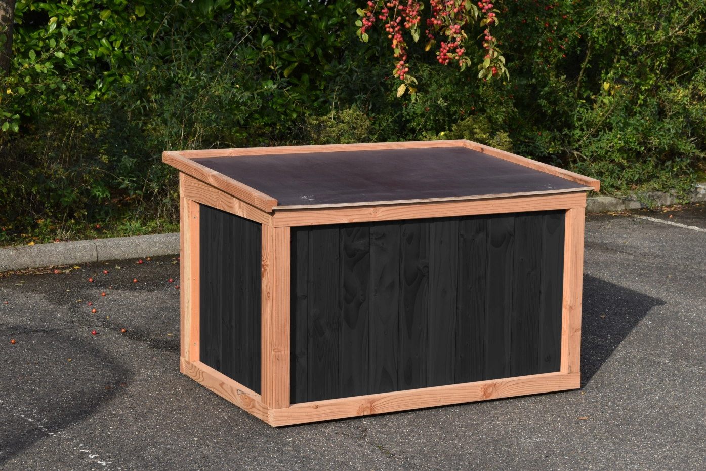- En bois de Douglas, avec des cadres de 68x44mm, des planches avec un épaisseur de 18mm. Même sans traitement du bois, le bois est durable pour 15 ans, mais le bois se devient gris vite si vous n'utilisez pas des huile pour le Douglas.