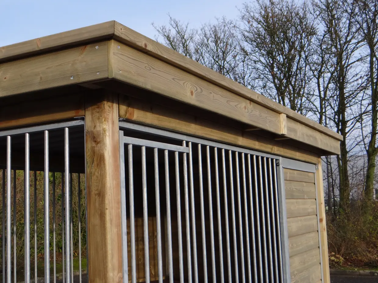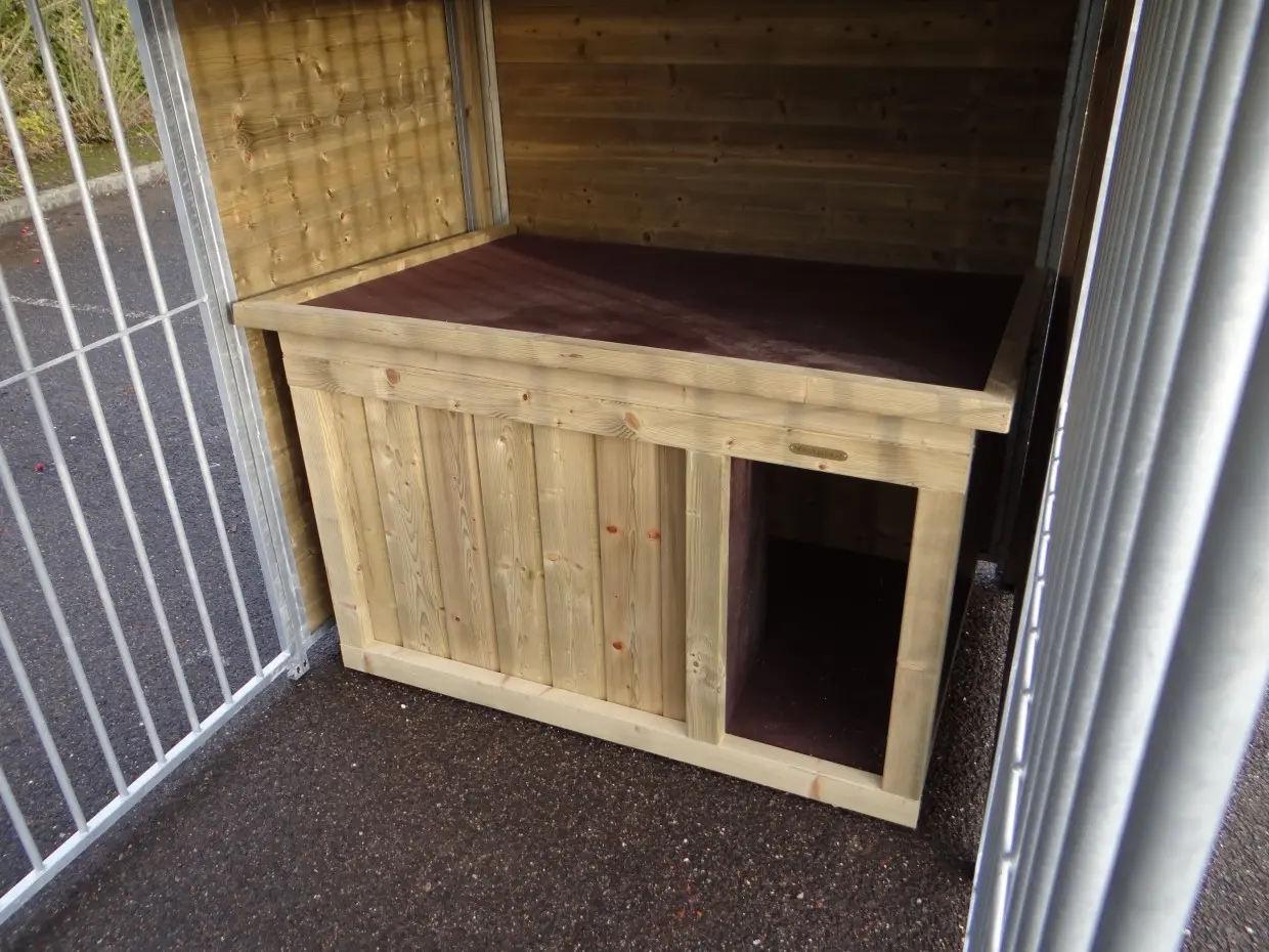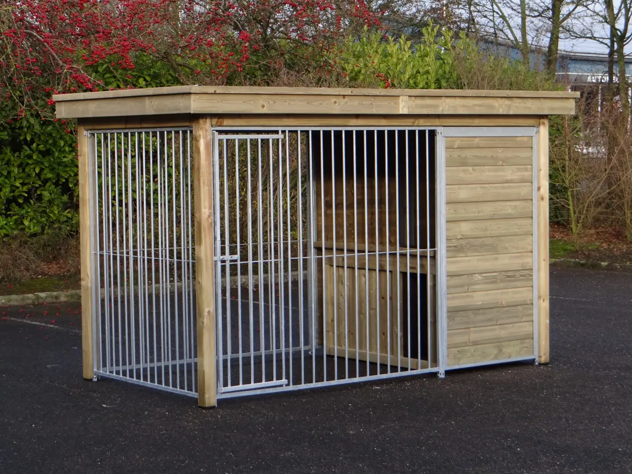 Le cadre en bois d’épicéa imprégné et la toiture haut de gamme confèrent au chenil une apparence élégante.