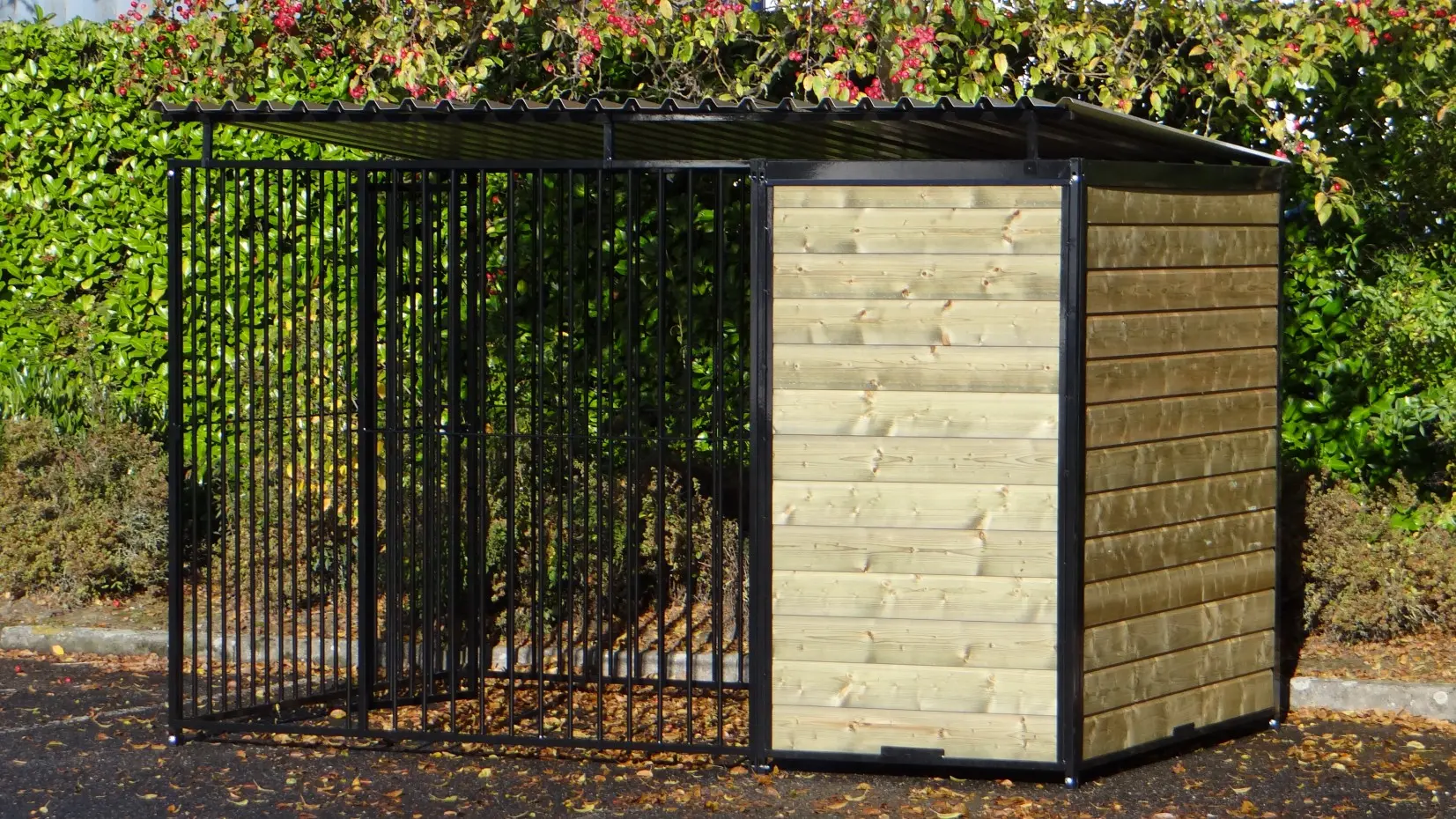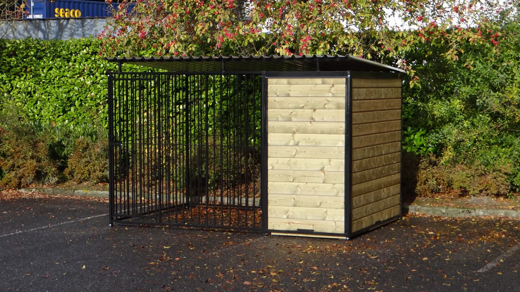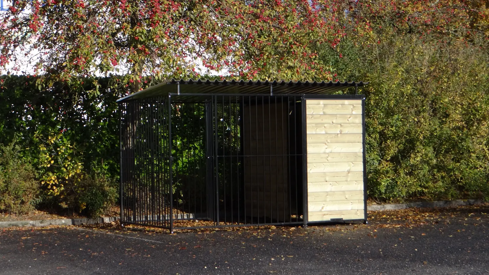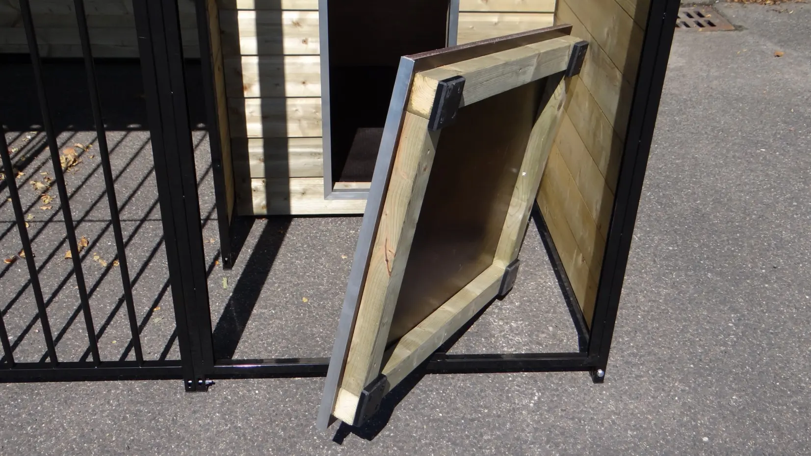 Ce chenil fort et noir enduit est une cage parfaite pour votre chien. Le chenil est équipé d'un toit, d'une plate-forme et de 3 murs en bois. Le chenil est 3 x 2 mètre et il est équipé d'une pare-brise pour un bon abri pour votre chien.