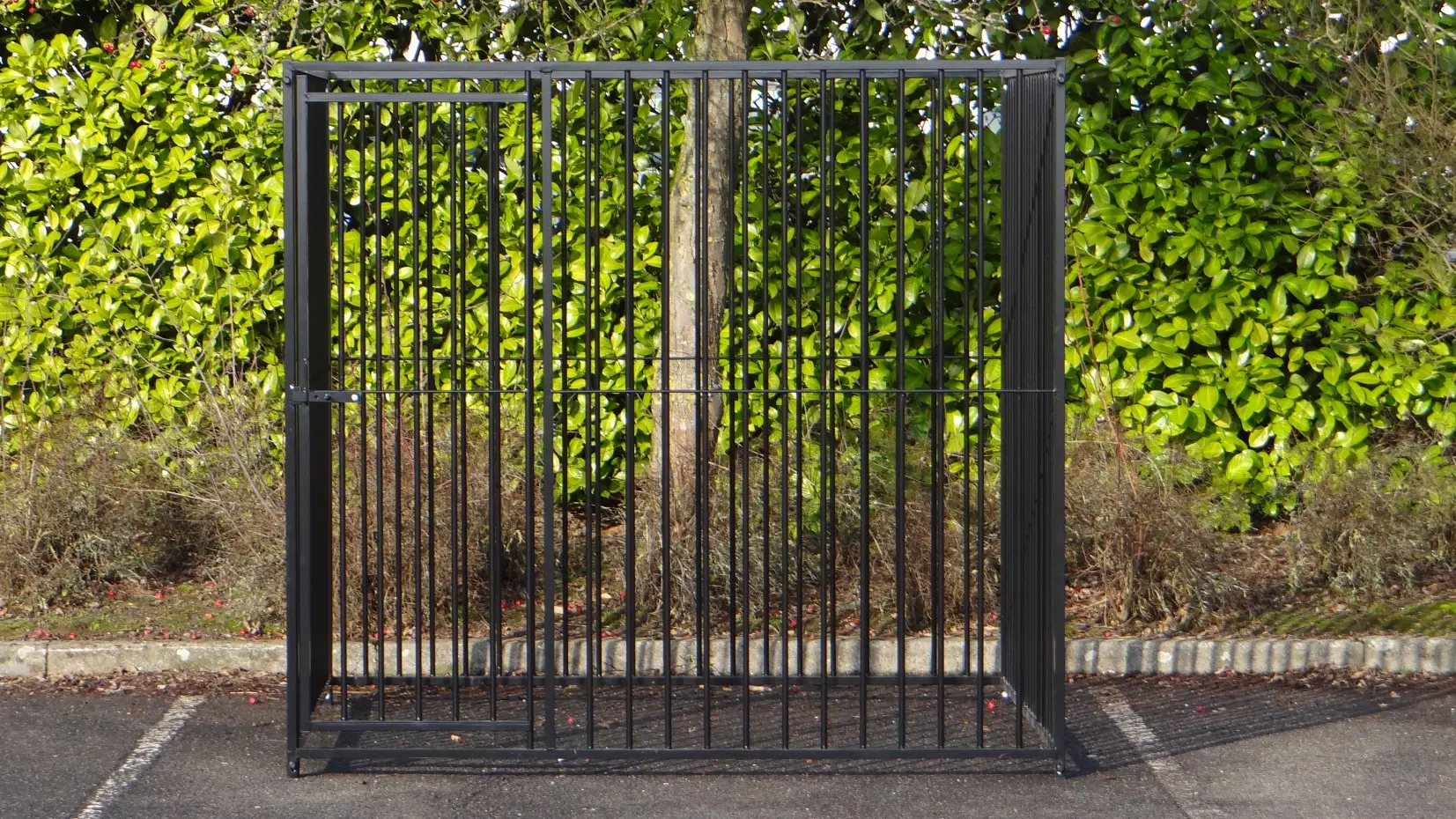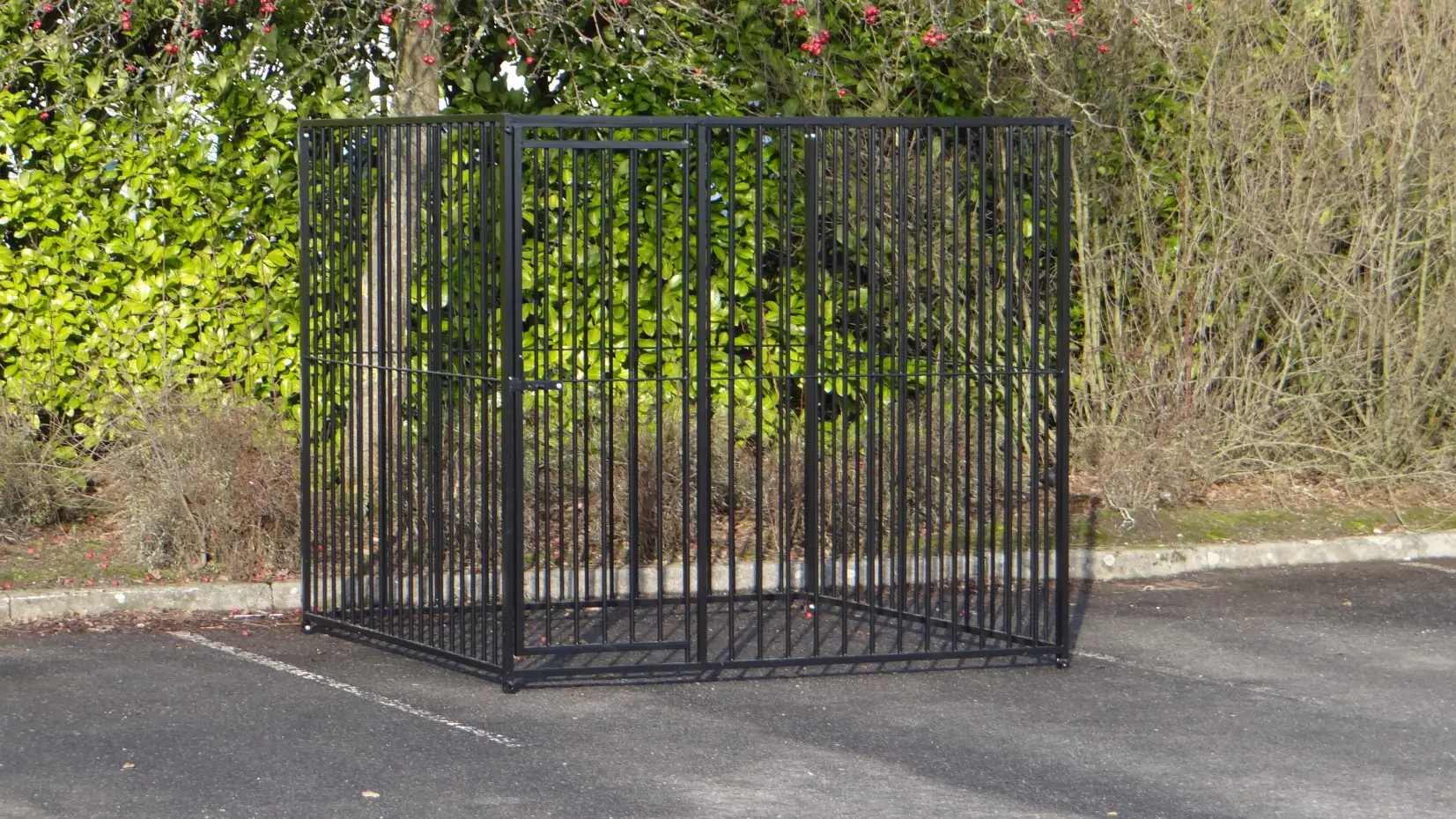 Le chenil pour chien FLINQ est fabriquée dans 4 panneaux des barreaux. La porte est dans la côte à gauche.