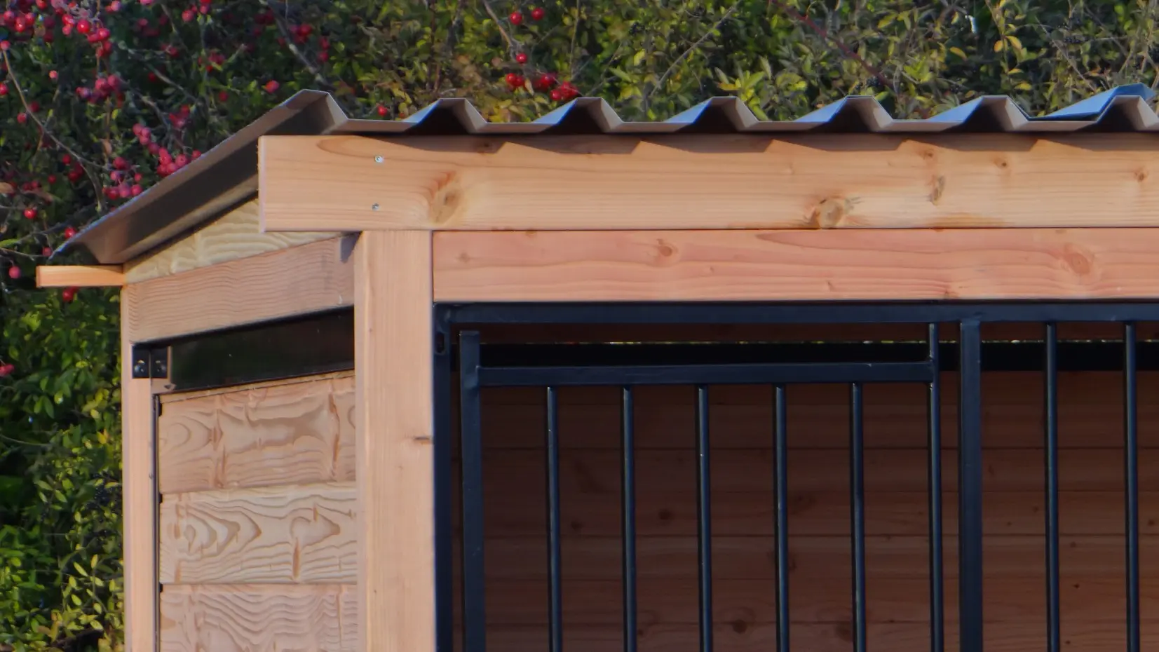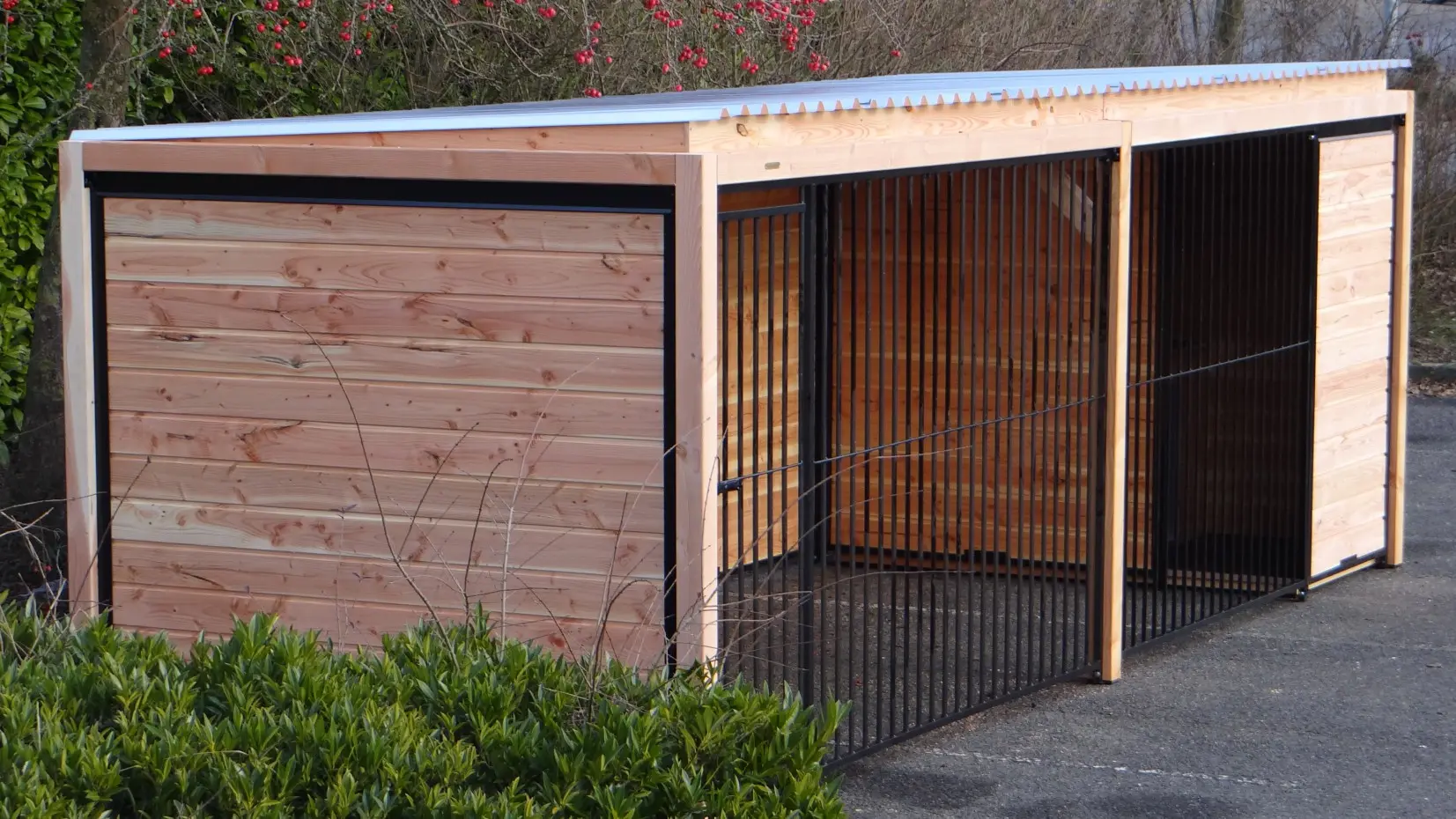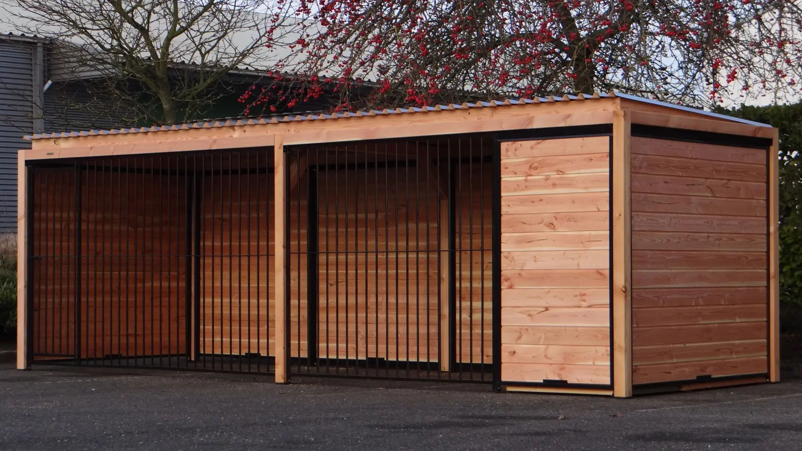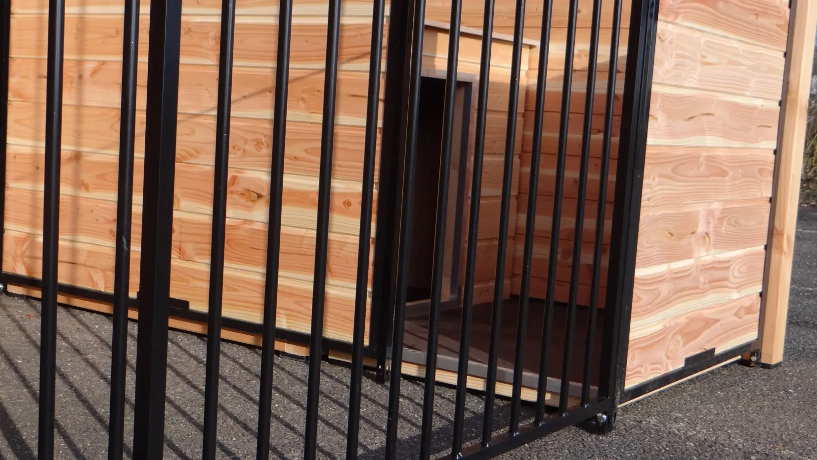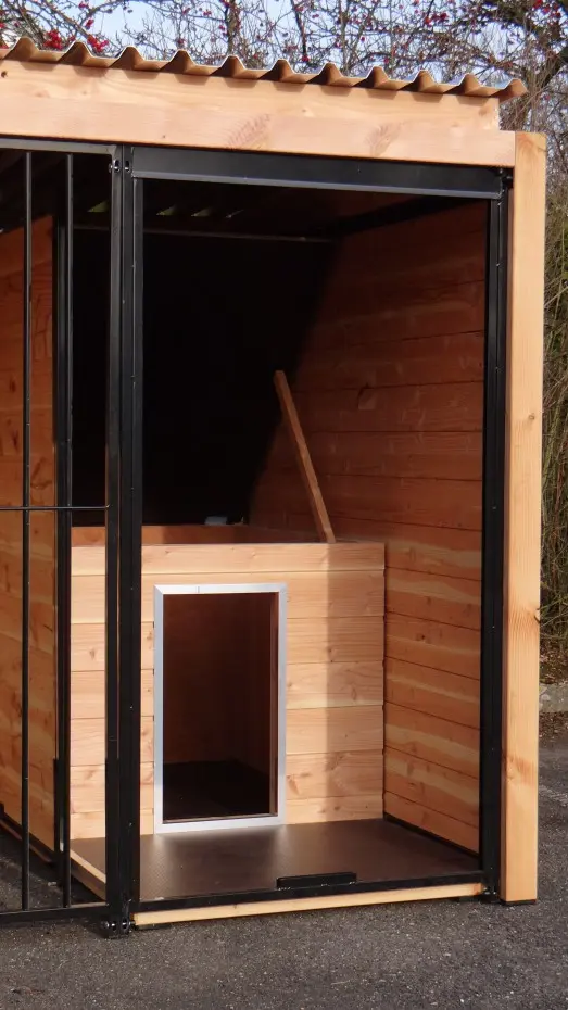 Les élégantes parois en bois de Douglas et les panneaux à barreaux noirs avec cadre en bois de Douglas forment ensemble un chenil magnifique. Le chenil est équipé de plaques de toiture en acier, garantissant une protection maximale contre les intempéries tout autour. Toutes les parois pleines sont constituées de cadres en acier remplis de bois de Douglas.