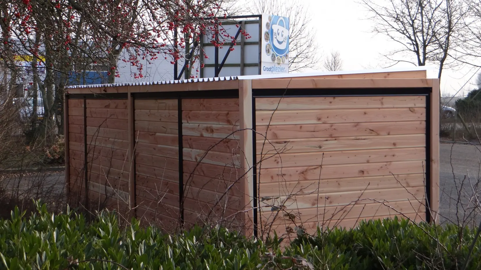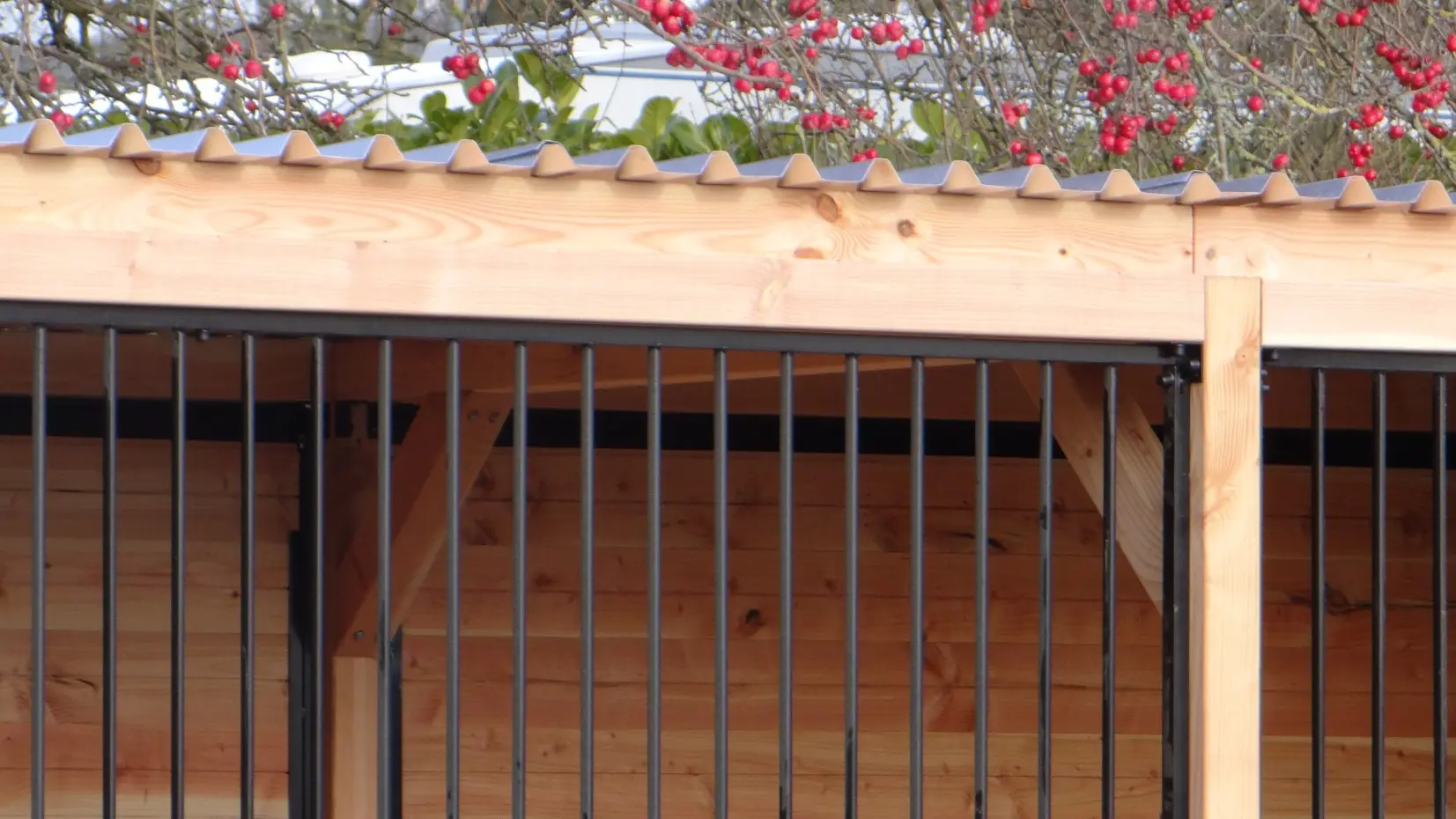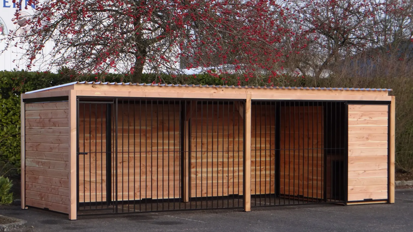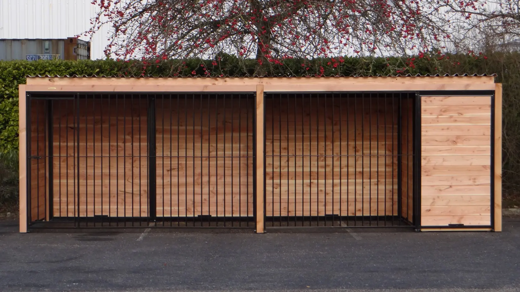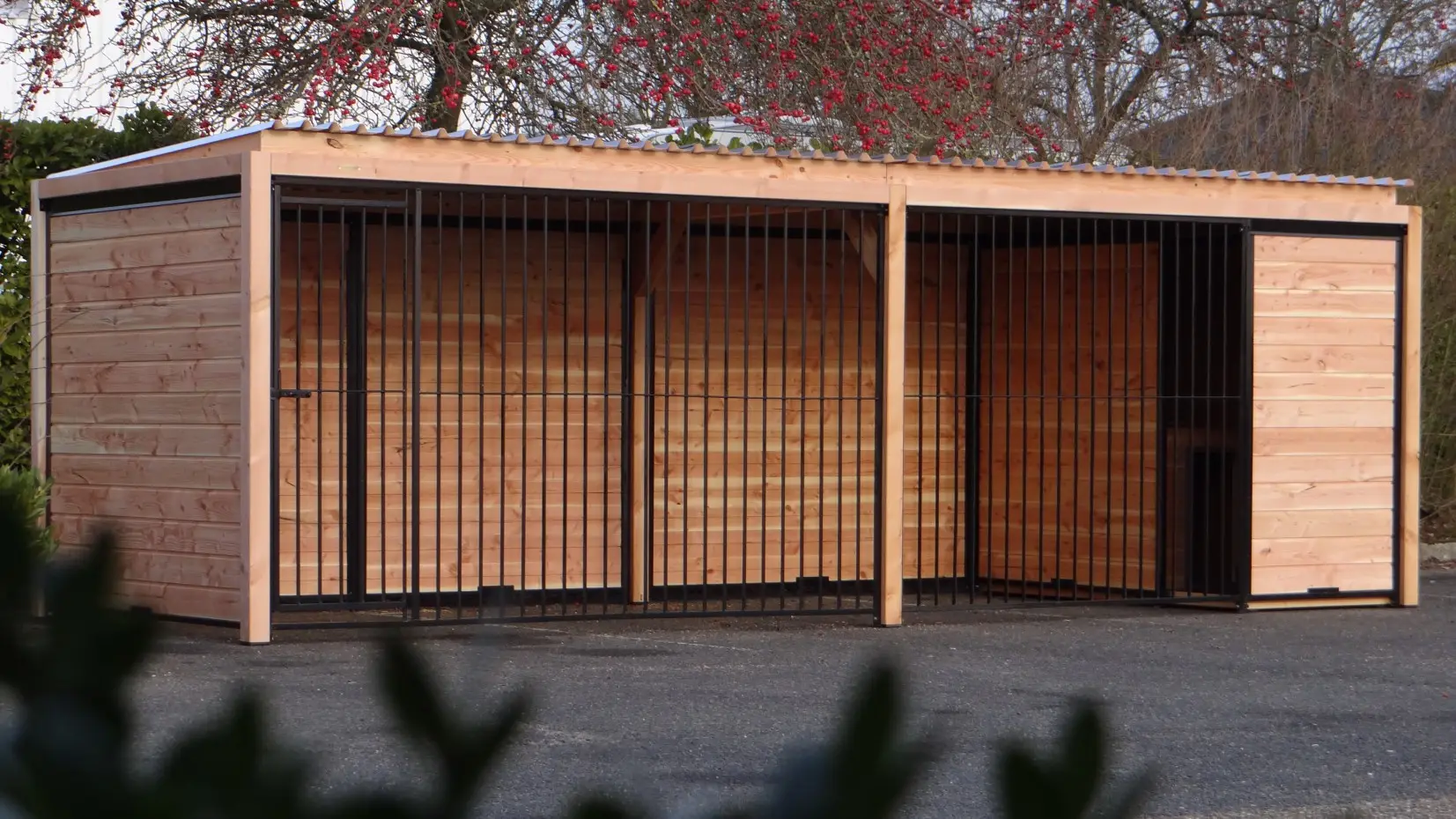 Les élégantes parois en bois de Douglas et les panneaux à barreaux noirs avec cadre en bois de Douglas forment ensemble un chenil magnifique. Le chenil est équipé de plaques de toiture en acier, garantissant une protection maximale contre les intempéries tout autour. Toutes les parois pleines sont constituées de cadres en acier remplis de bois de Douglas.