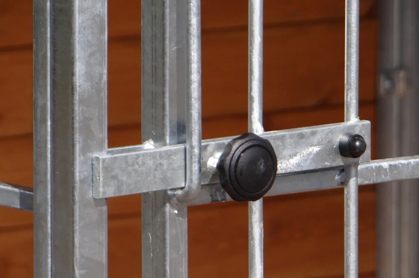 - La porte du chenil est standard sur le côté gauche, s'ouvre vers l'intérieur et peut être cadenassée