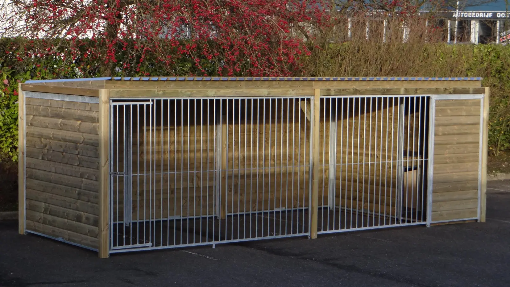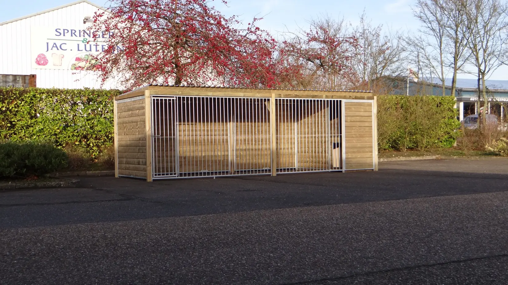 Chenil robuste de 6x2 mètres avec niche isolée et toit. Les cadres en bois imprégné assurent une construction solide et résistante. Le toit en acier est insonorisant grâce à une couche de feutre. Le chenil est également équipé de la niche Easy isolée, offrant une excellente protection contre les courants d’air et le froid. Cette niche est prolongée par une plateforme en multiplex béton, munie d’une bande anti-morsure sur le bord. En résumé, un chenil beau et robuste pour héberger votre/vos chien(s) toute l’année.