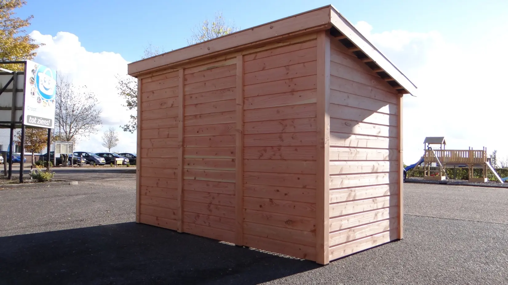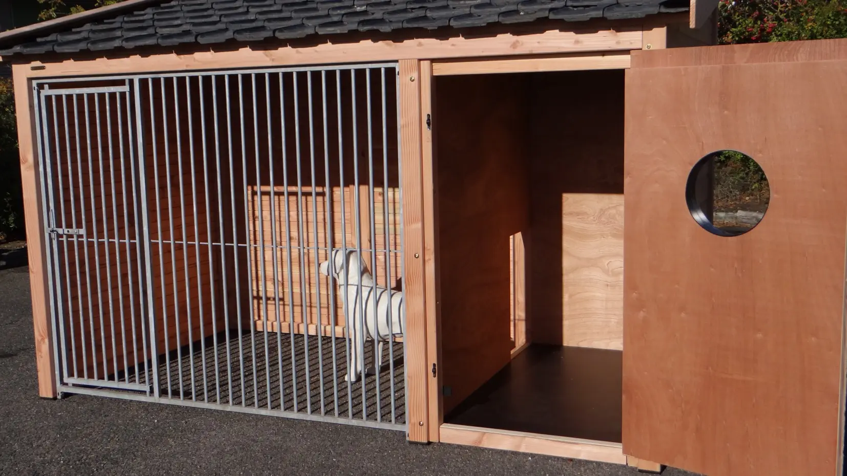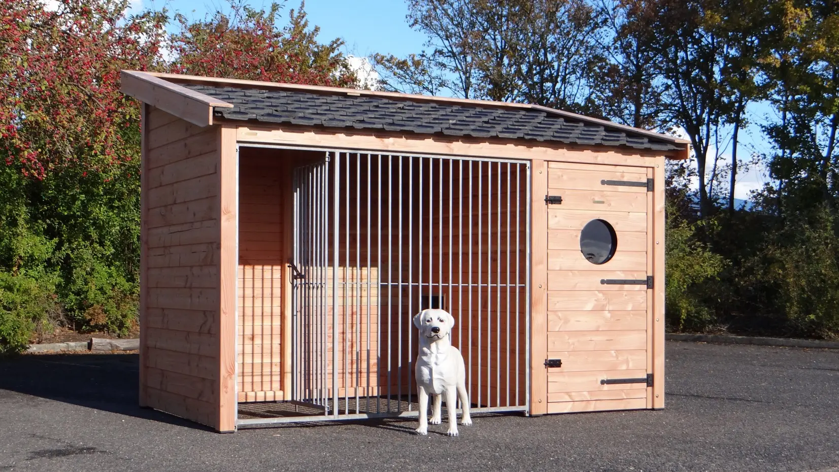 Chenil pour chien Max 1 est fabriquée en bois de Douglas et a une grande niche isolée. L'enclos et la nichoir ont grande portes. Le toit est équipée avec tuiles d'occassion. Le chenil offre un belle solution pour garder votre chien dehors toute de l'année. Les dimensions maximal ont 341x182x240cm.