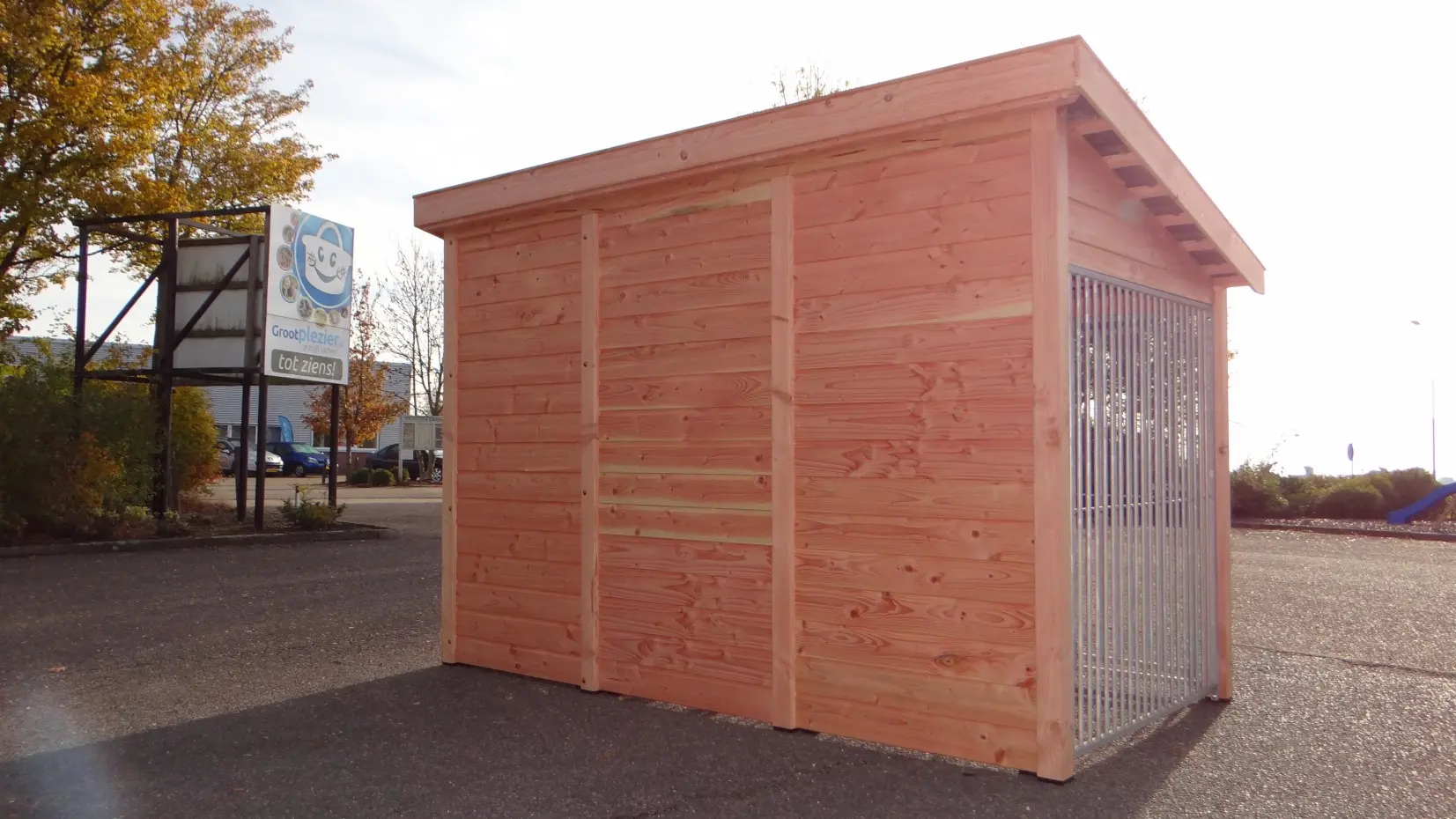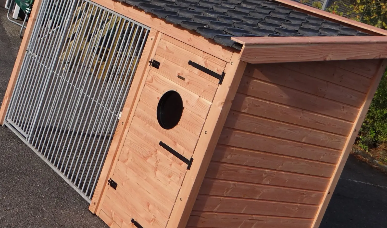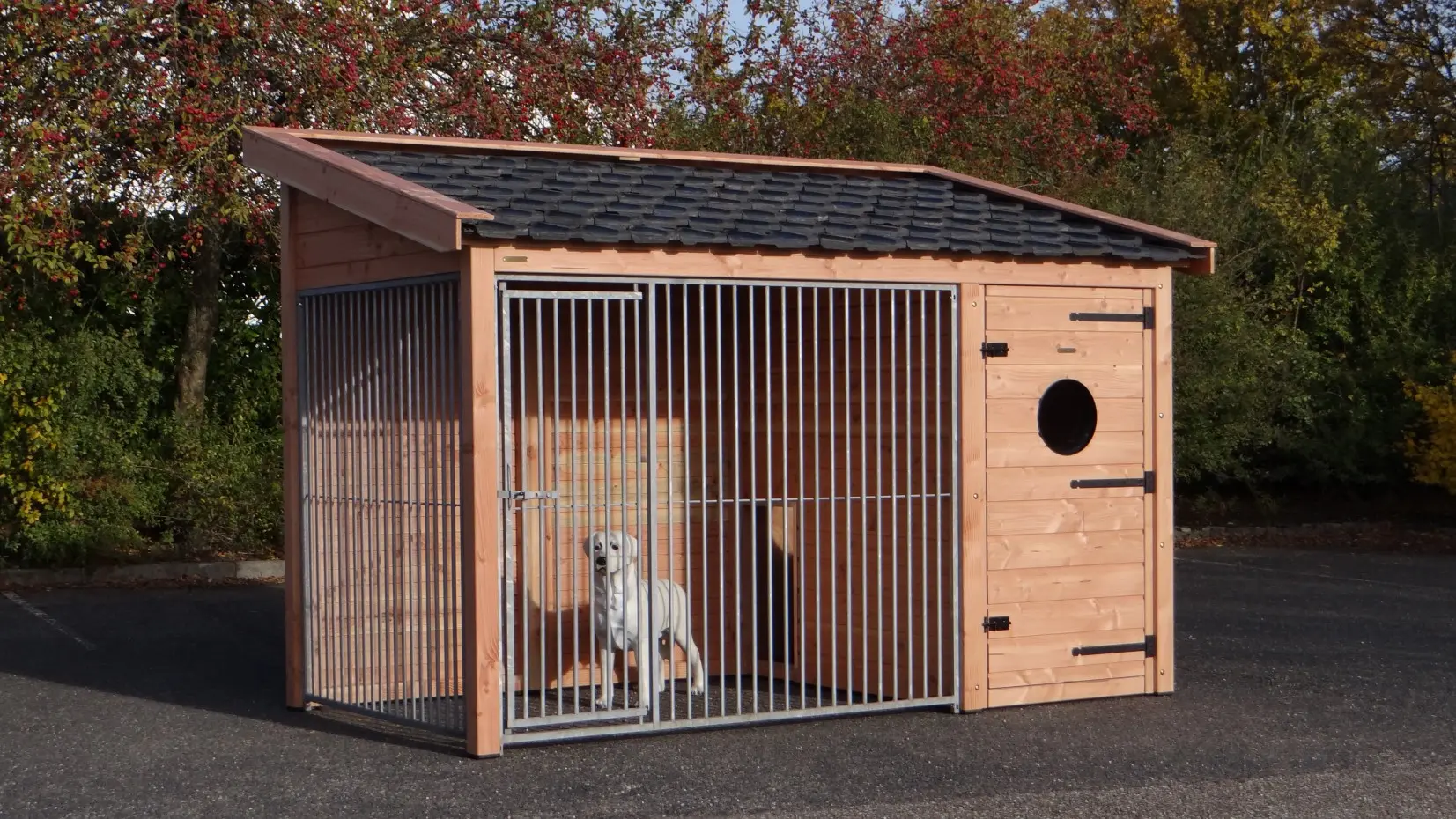Chenil pour chien Max 2 est fabriquée en bois de Douglas et a une grande niche isolée. L'enclos et la nichoir ont grande portes. Le toit est équipée avec tuiles d'occassion. Le chenil offre un belle solution pour garder votre chien dehors toute de l'année. Les dimensions maximal ont 341x182x240cm.