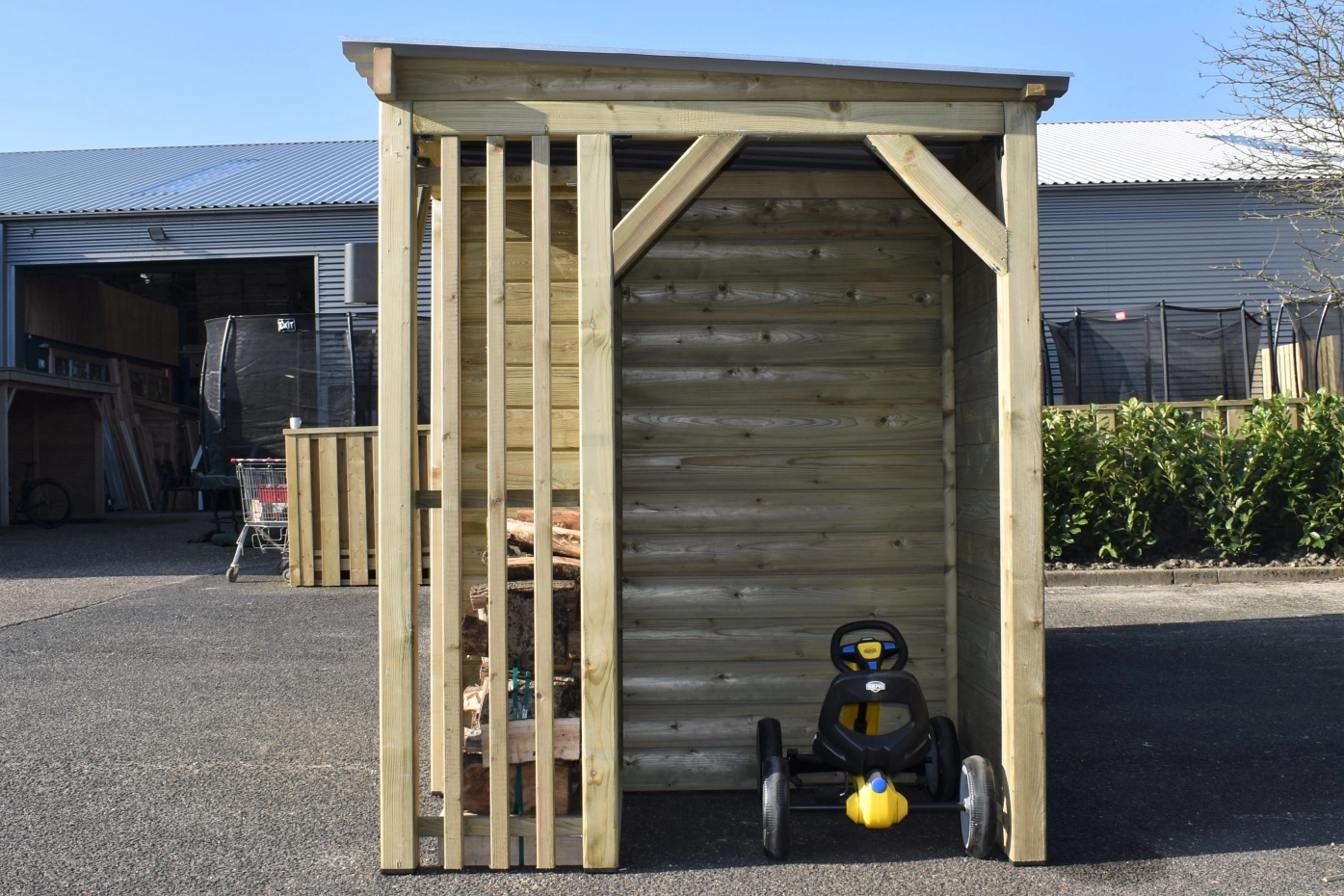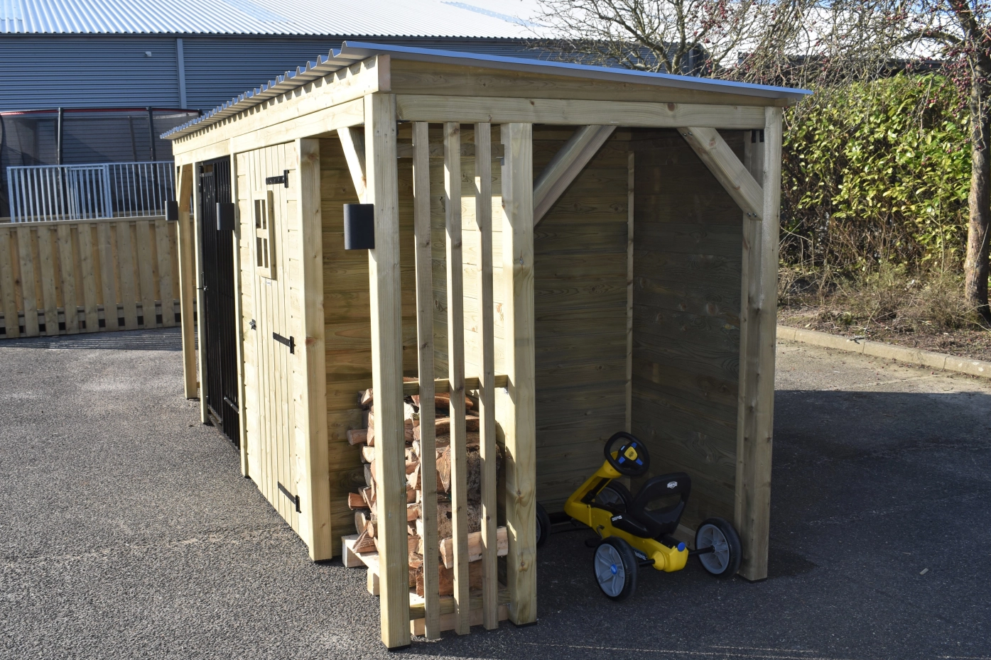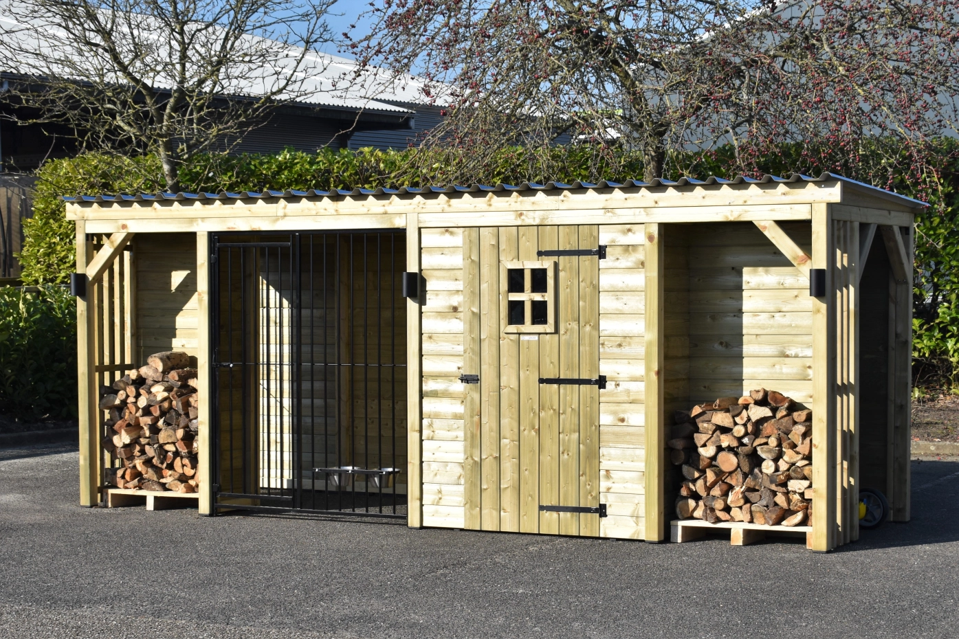 Chenil pour chien Modul COMBI avec espace de stockage, auvent et 2 espaces pour bois de chauffage