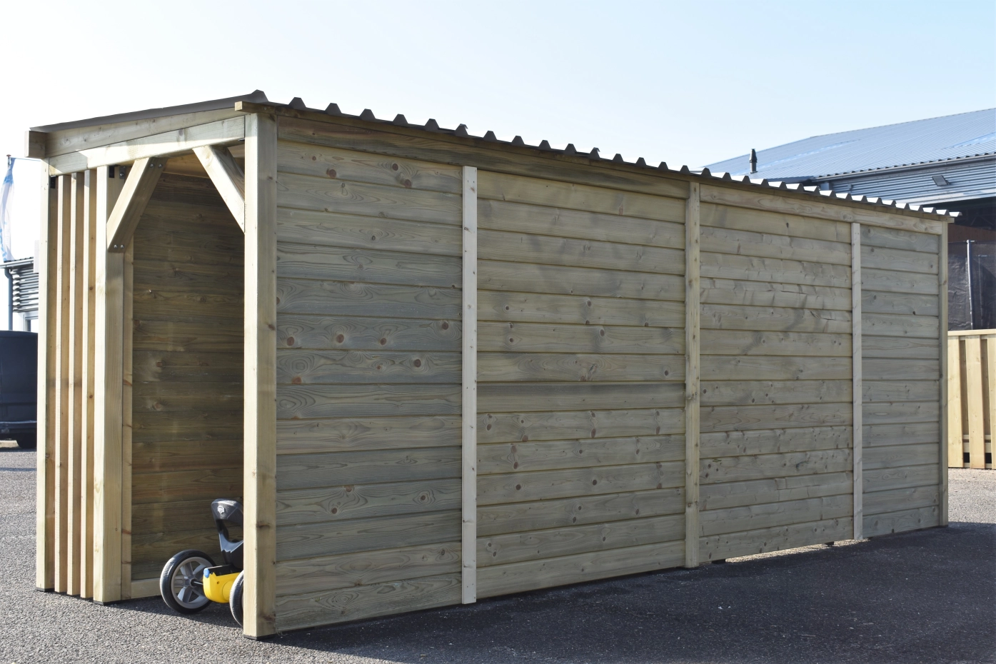 Chenil pour chien Modul COMBI a un auvent, 2 espaces pour bois du chauffage et un espace de stockage. Le clapier a 5 espaces différentes, sous 1 toit! Le clapier est fabriquée en bois d'épicéa impregné, ce qui assure la longévité du clapier. Cependant, le bois vieillit au bout d'un certain temps. Les tôles ondulées ont équipée avec feutre d'anti-condensation. Vous pouvez adaptée le chenil sur votre propre souhaits. Beau chenil pour un bon prix!