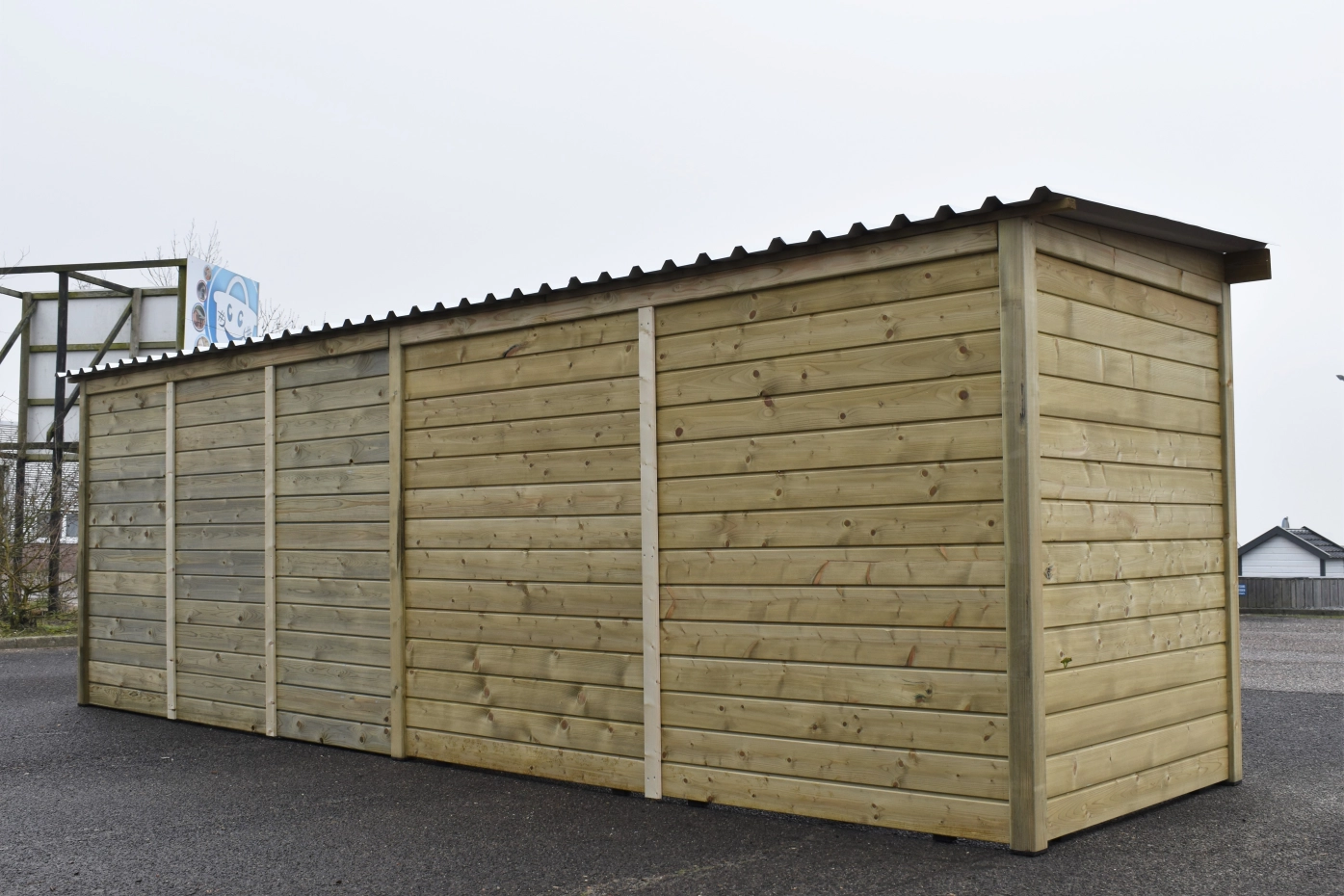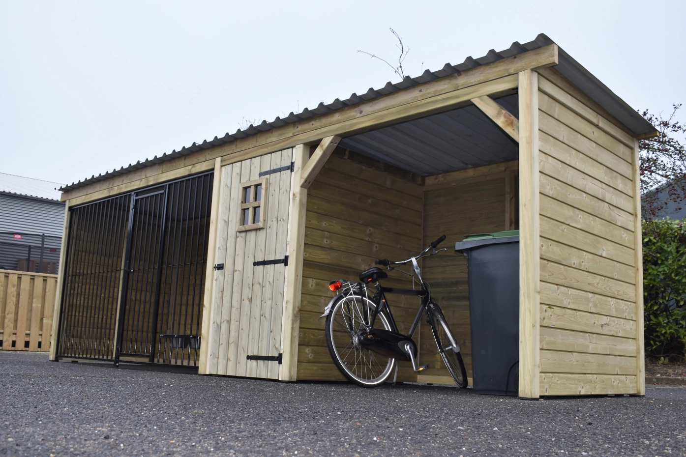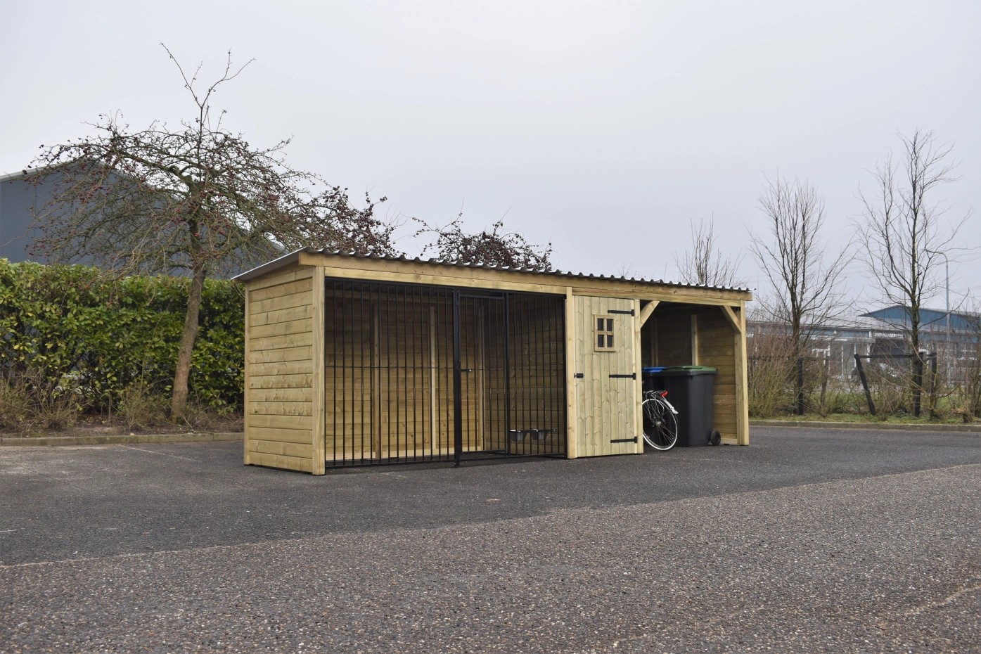 Niche en bois de pin imprégné avec un cadre en bois. Parc luxueux et spacieux de 1,5 x 3 mètres. En outre, un espace de rangement avec porte de luxe. Puis un abri, le tout sous un même toit ! Comme le chenil n'est pas très profond, il ne prend pas trop de place et peut facilement se tenir dans la longueur du jardin. Le bois est durable et durera au moins 10 à 15 ans. Les panneaux du chenil sont recouverts d'une couche de poudre noire, ce qui en fait un chenil solide à un prix intéressant ! Les panneaux du toit sont en acier et leur face inférieure est recouverte d'une couche de feutre qui empêche la condensation et amortit la pluie.