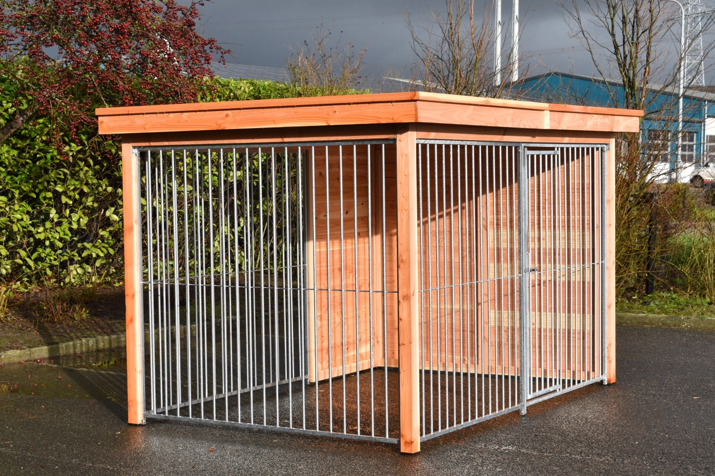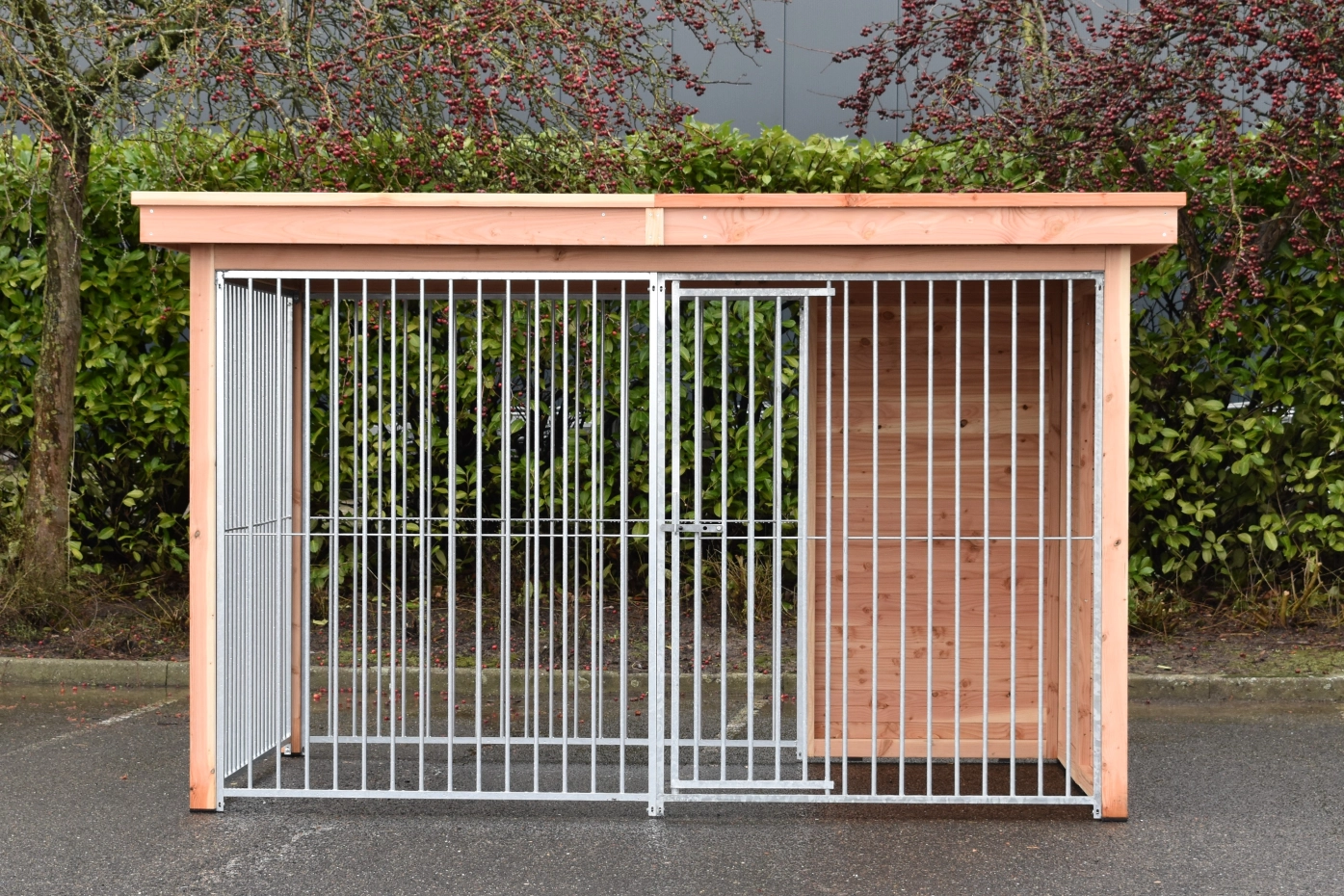 - La porte du chenil est standard sur le côté gauche, s'ouvre vers l'intérieur et peut être cadenassée
