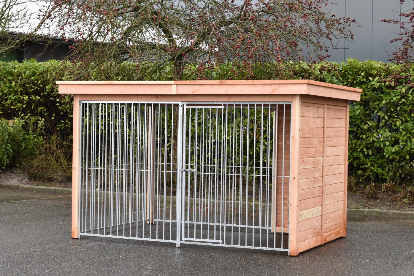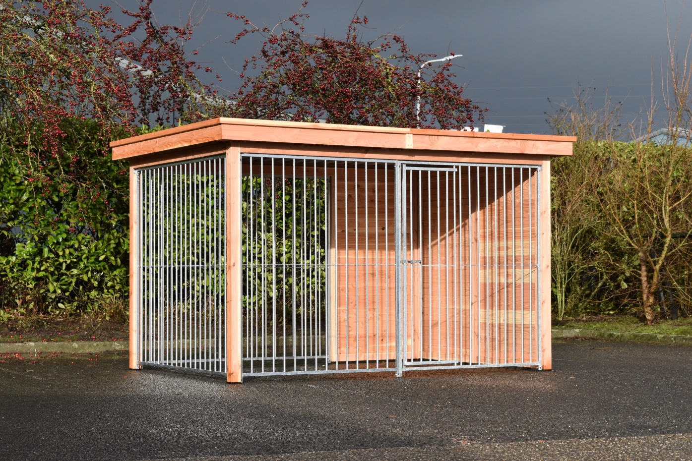 Chenil pour chien Modul FERM a un cadre en bois de Douglas et est équipée avec panneaux galvanisées. Sans traitement supplémentaire, le bois deviendra rapidement gris. Pour préserver la couleur du bois, vous pouvez le traiter avec de l'huile Douglas. Même sans traitement supplémentaire, le sapin de Douglas est très durable. Le chenil peut être adaptée à vos propre souhaits.