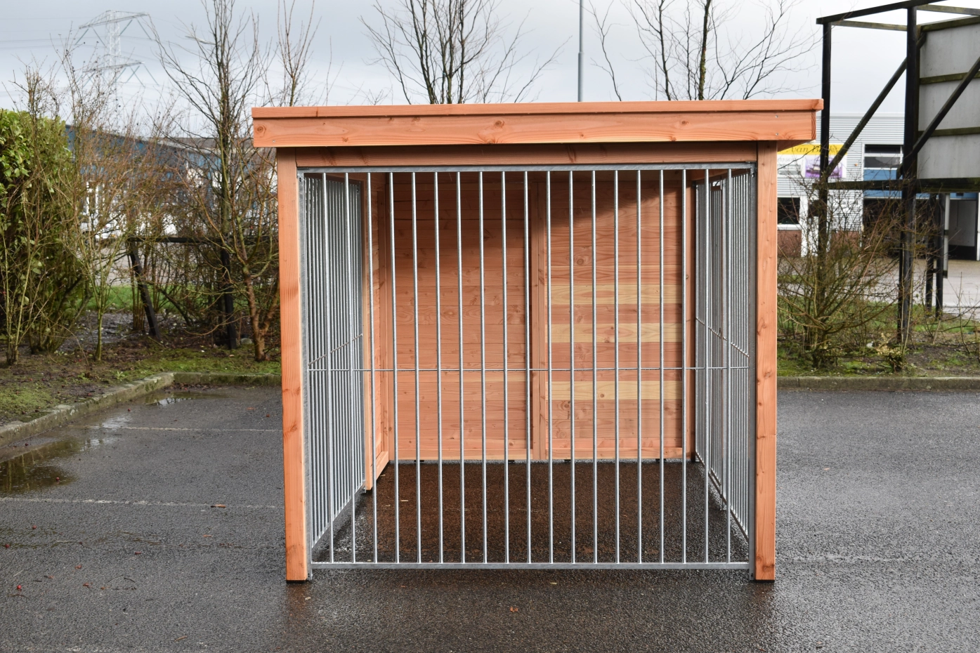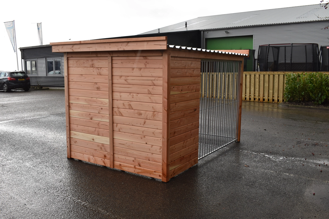 - Ce panneau de chenil en bois est équipé de bardage en douglas de 18 mm. Le bois a une classe de durabilité C et ne nécessite aucun traitement. Sans traitement, il grisonnera rapidement. Vous pouvez éviter cela en le traitant avec de l’huile de douglas.