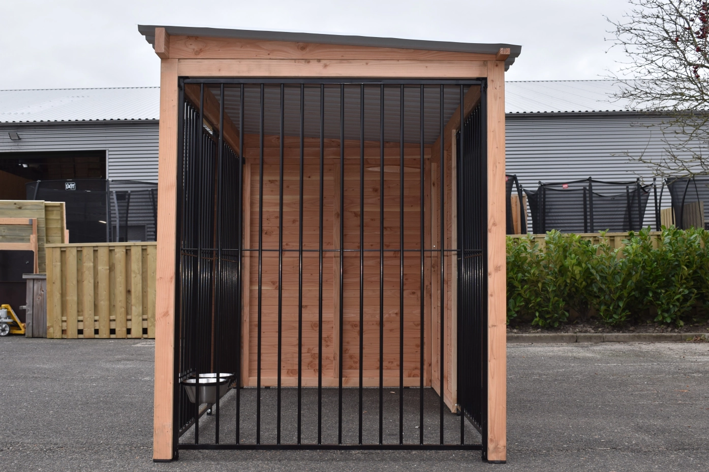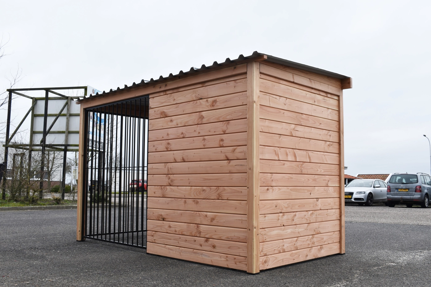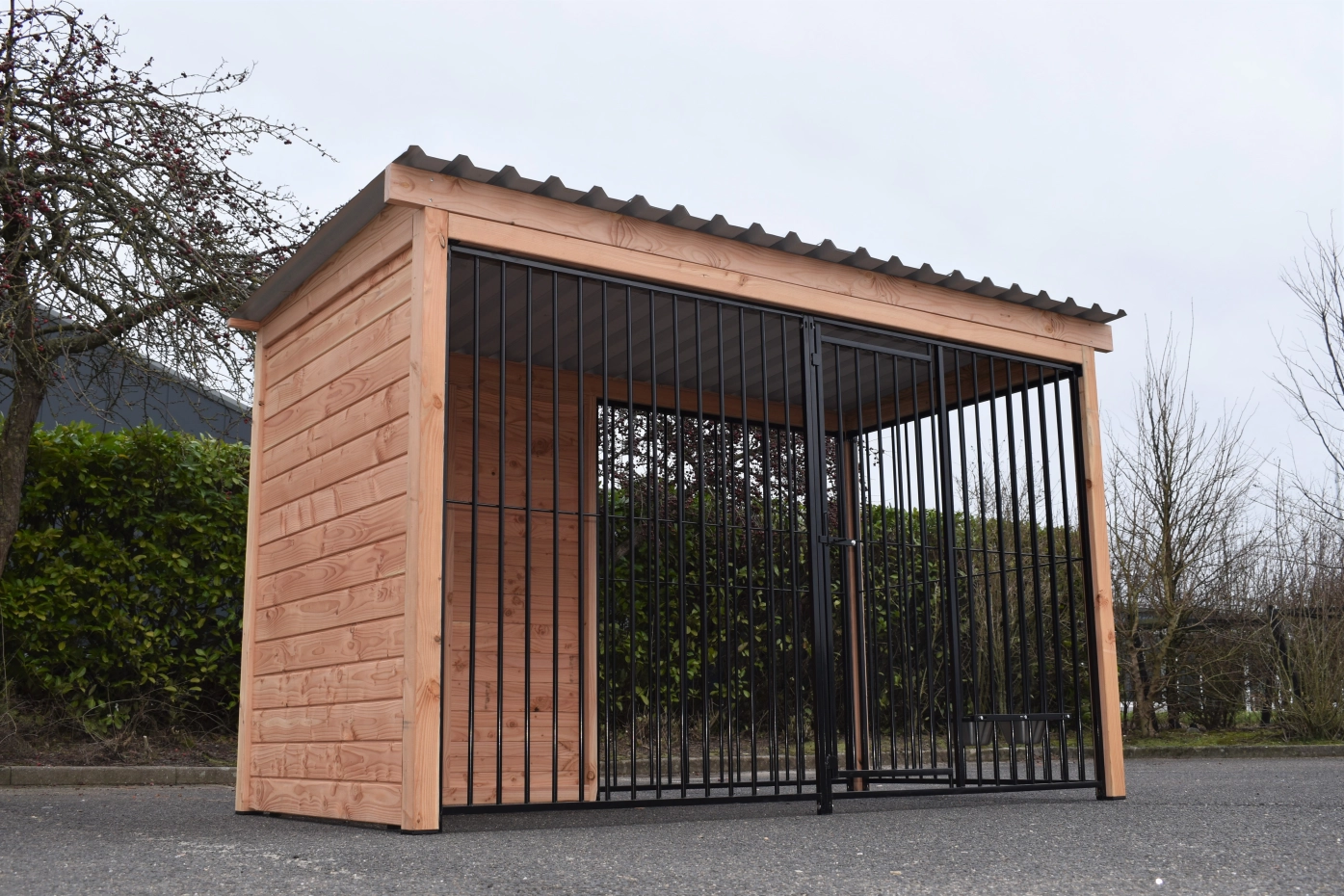 Magnifique combinaison de bois Douglas et de panneaux grillagés noirs ! Pour un prix relativement bas, un superbe chenil avec des parois joliment finies et des plaques de toiture haut de gamme. Le cadre en bois autour des panneaux donne un aspect robuste et assure une structure solide. Grâce à la grande porte d’accès, le chenil est pratique et facilement accessible. Le bois Douglas grisonnera avec le temps ; si vous souhaitez éviter cela, vous pouvez traiter les parties en bois et les poteaux avec de l’huile pour Douglas.