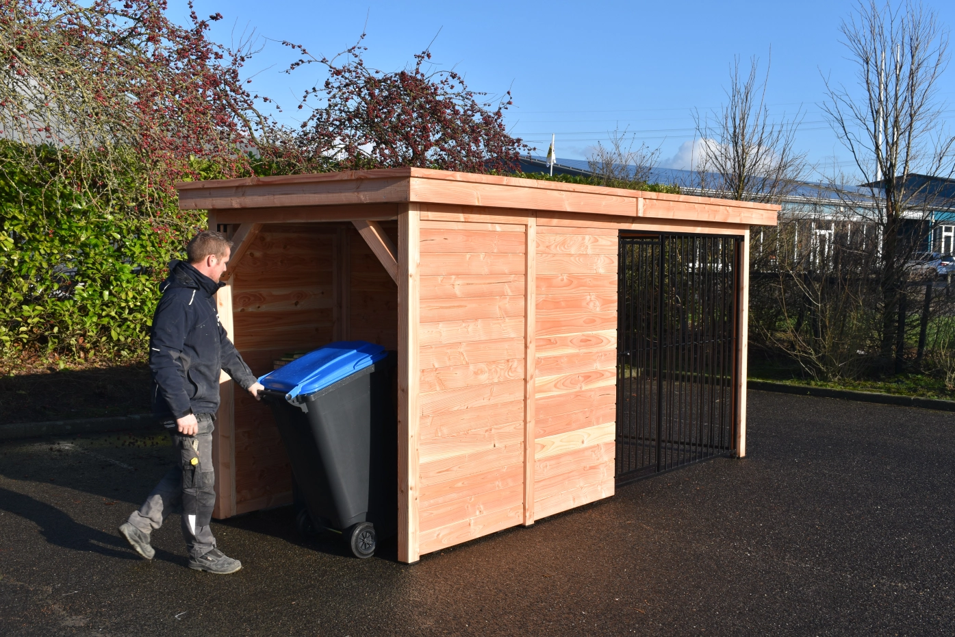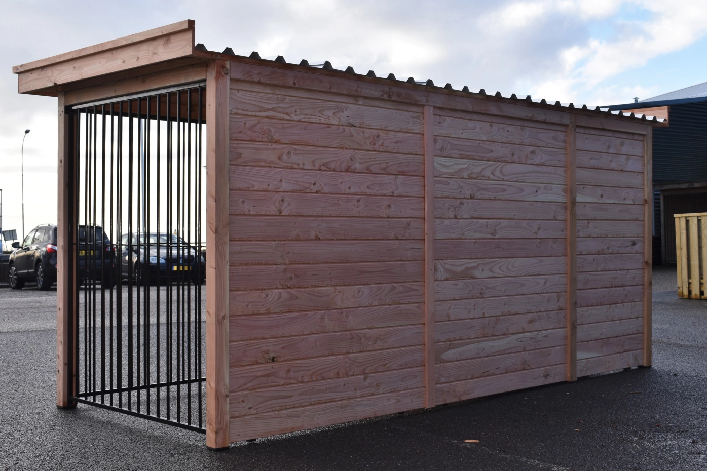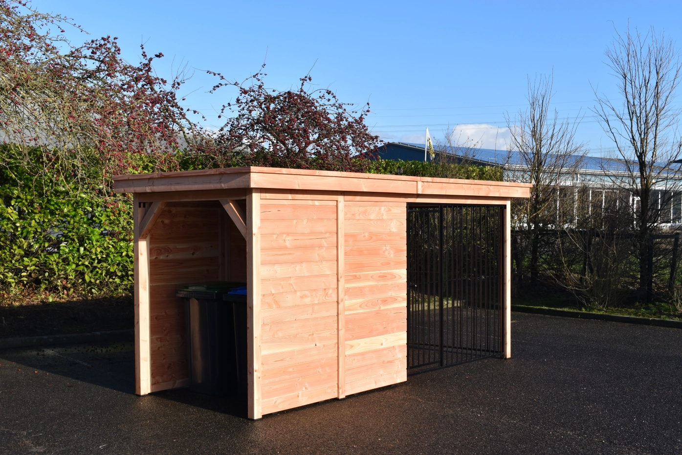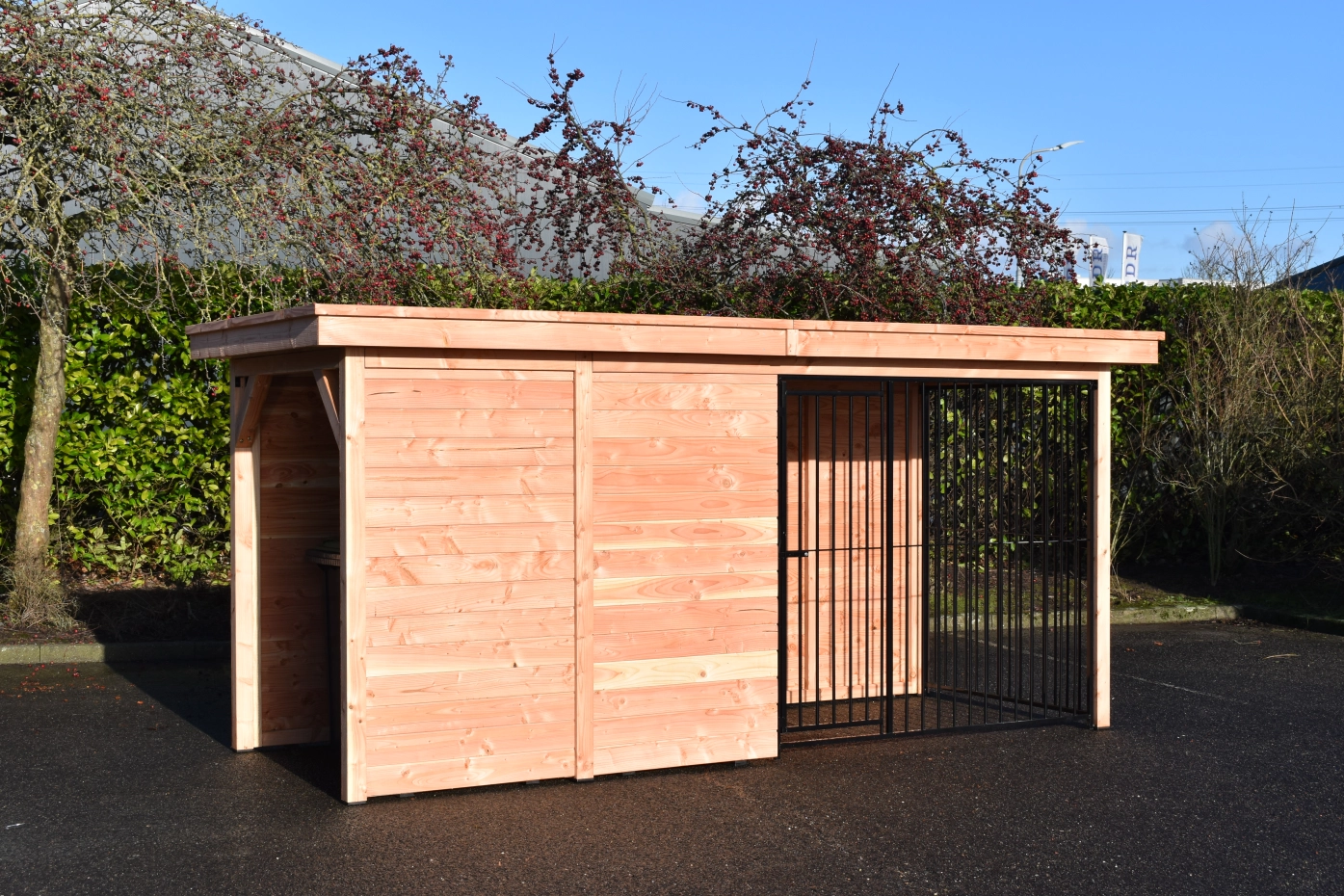 - Ce panneau de chenil en bois est équipé de bardage en douglas de 18 mm. Le bois a une classe de durabilité C et ne nécessite aucun traitement. Sans traitement, il grisonnera rapidement. Vous pouvez éviter cela en le traitant avec de l’huile de douglas.