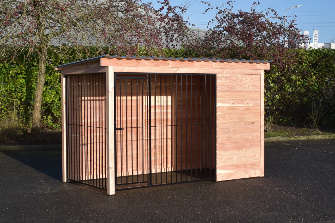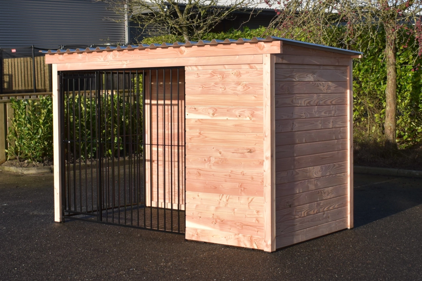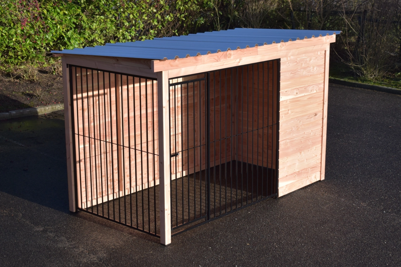 - Ce panneau de chenil en bois est équipé de bardage en douglas de 18 mm. Le bois a une classe de durabilité C et ne nécessite aucun traitement. Sans traitement, il grisonnera rapidement. Vous pouvez éviter cela en le traitant avec de l’huile de douglas.
