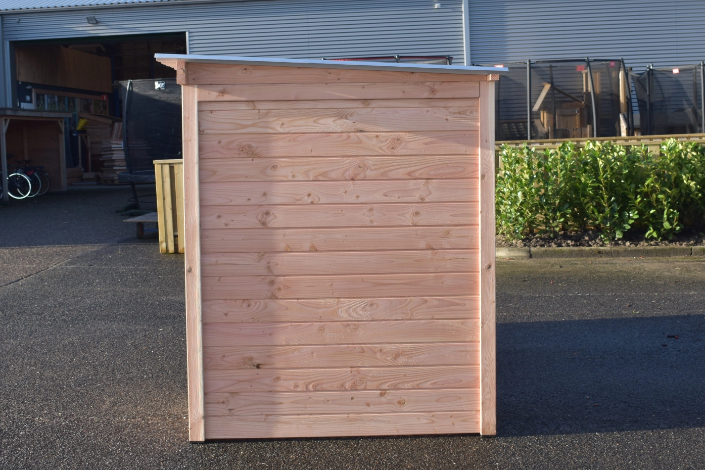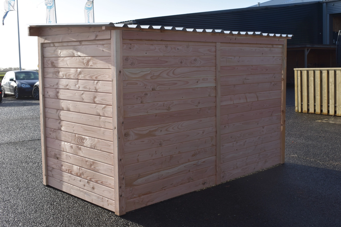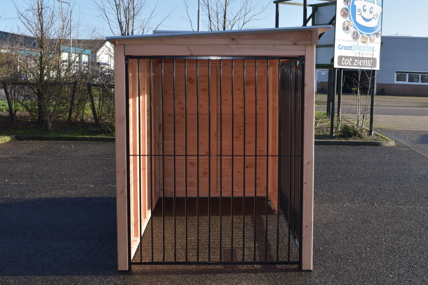 - Ce panneau de chenil en bois est équipé de bardage en douglas de 18 mm. Le bois a une classe de durabilité C et ne nécessite aucun traitement. Sans traitement, il grisonnera rapidement. Vous pouvez éviter cela en le traitant avec de l’huile de douglas.