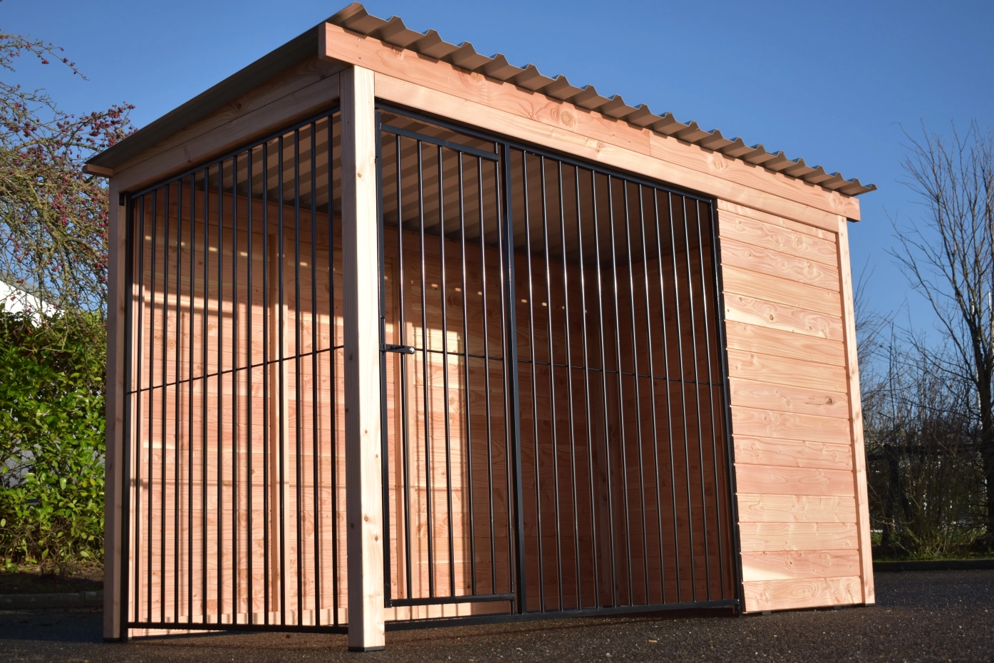 Le chenil pour chien Modul FORZ a un cadre en bois de Douglas. Avec les panneaux en bois de Douglas et les panneaux des barreaux noires, c'est un beau chenil. Pour préserver la couleur du bois, vous pouvez le traiter avec de l'huile Douglas. Même sans traitement supplémentaire, le sapin de Douglas est très durable.