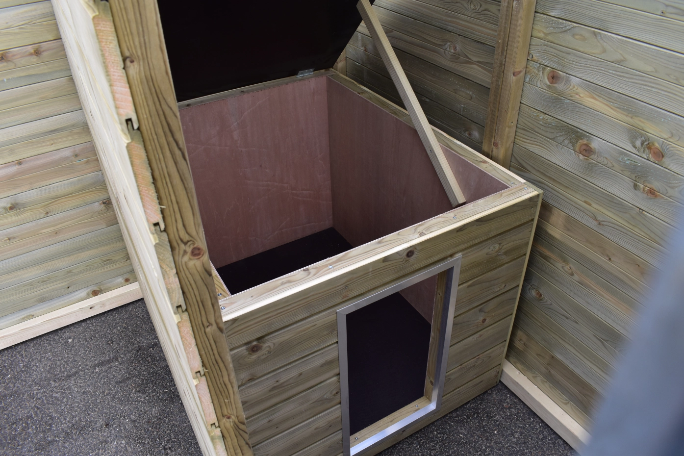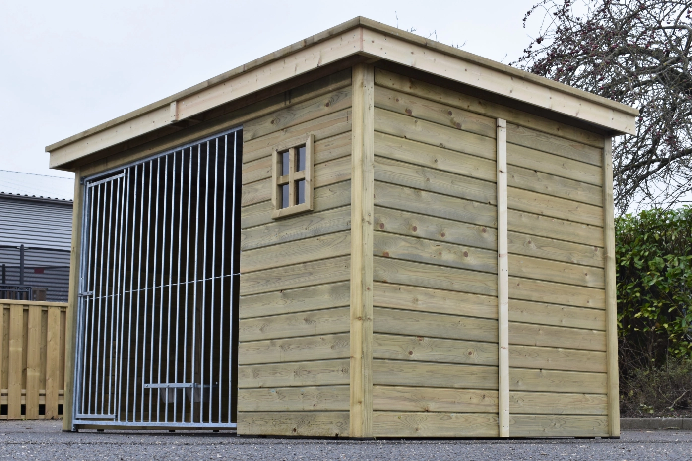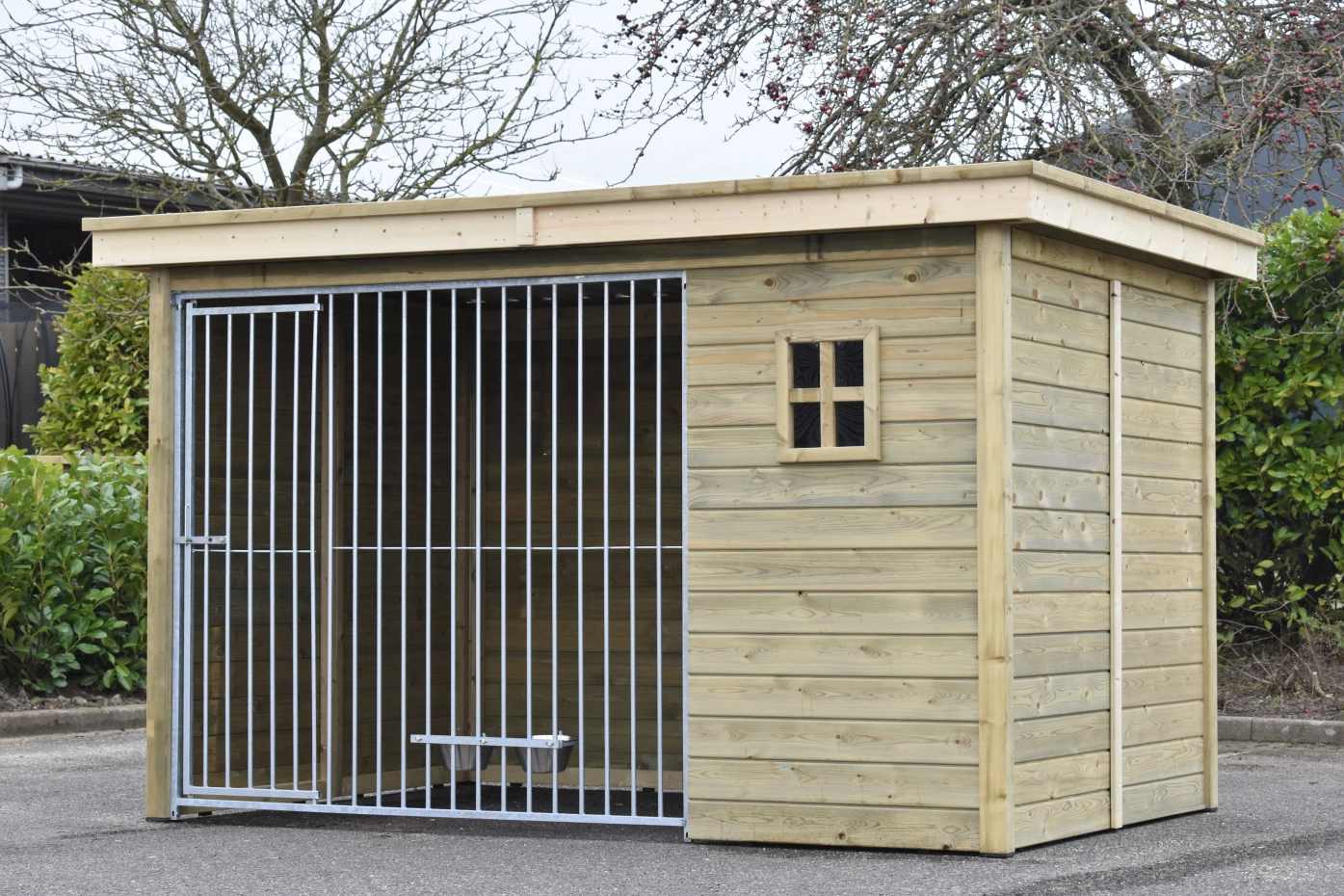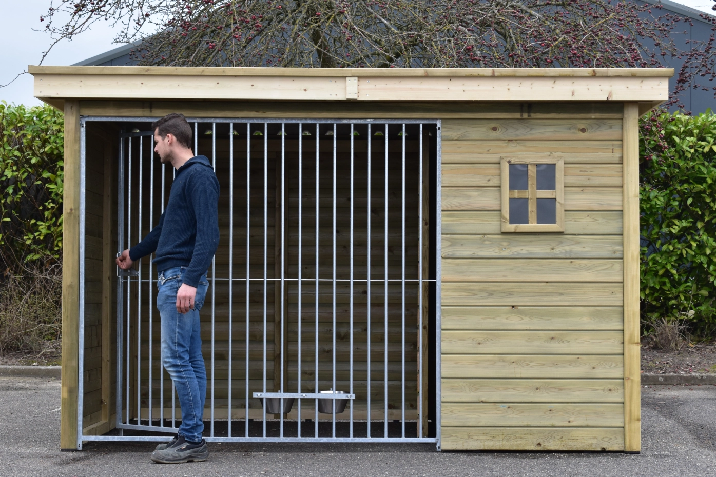 - La porte du chenil est standard sur le côté gauche, s'ouvre vers l'intérieur et peut être cadenassée