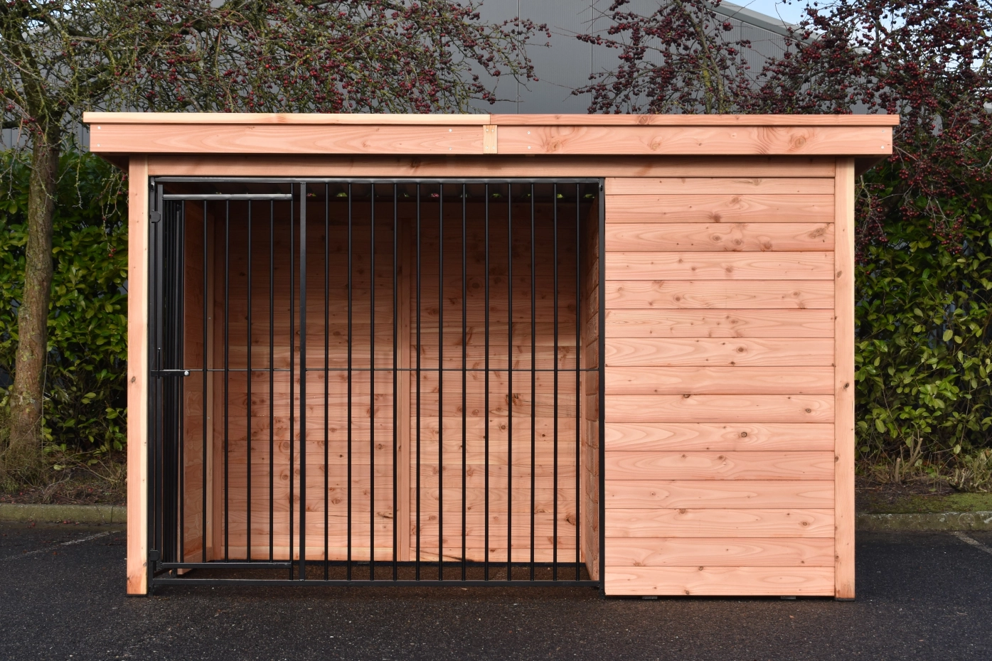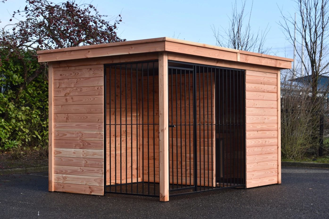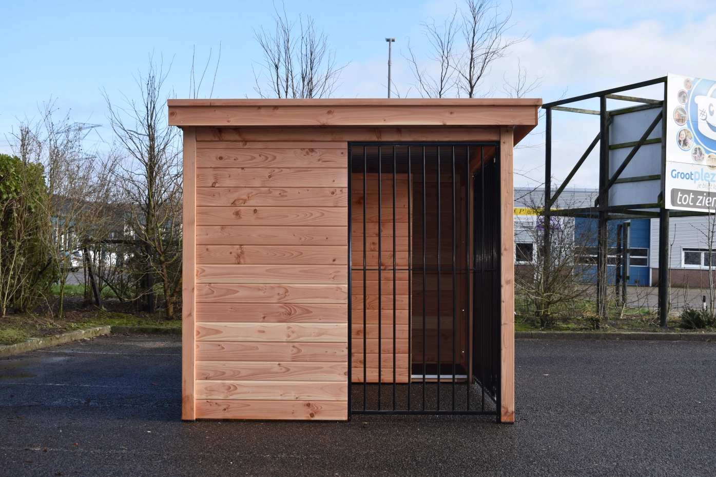 Ce chenil pour chien en Douglas Modul Forz est un choix luxueux et durable, combiné avec l'abri isolé Easy. Le chenil est construit avec des panneaux en bois de Douglas robustes et un cadre en bois solide. L'abri Easy, spacieux et isolé, est doté d’un toit basculant, facilitant ainsi l'entretien. Les parois du chenil sont constituées de cadres en bois avec des lames à emboîtement, garantissant une structure stable et bien fermée. La grille en acier noir s’associe élégamment au bois de Douglas. Le chenil pour chien est équipé de plaques de toit en acier avec une couche de feutre pour prévenir la condensation. Le bois de Douglas a une longue durée de vie et ne nécessite aucun traitement, mais il se grisonnera avec le temps; pour éviter cela, nous recommandons de lasurer le chenil.