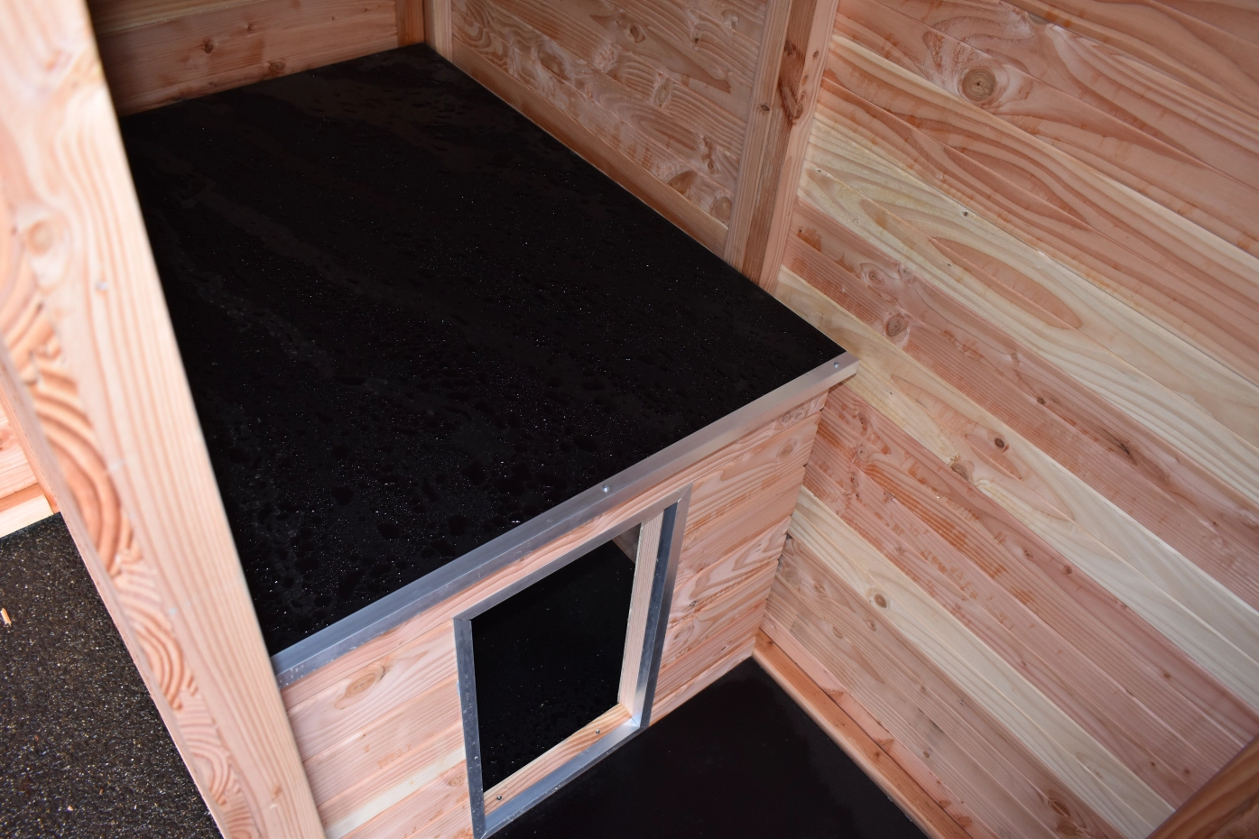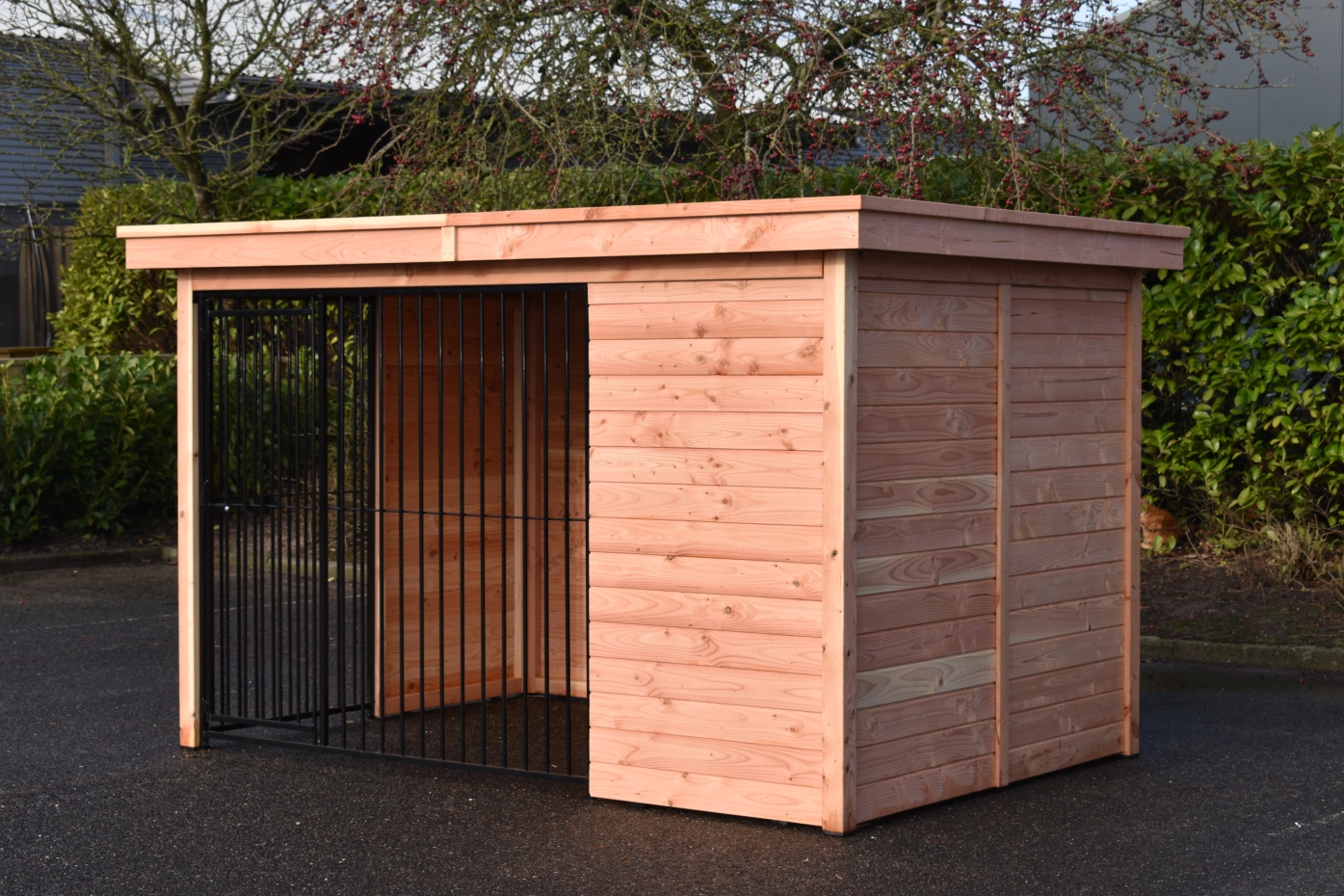 - Ce panneau de chenil en bois est équipé de bardage en douglas de 18 mm. Le bois a une classe de durabilité C et ne nécessite aucun traitement. Sans traitement, il grisonnera rapidement. Vous pouvez éviter cela en le traitant avec de l’huile de douglas.
