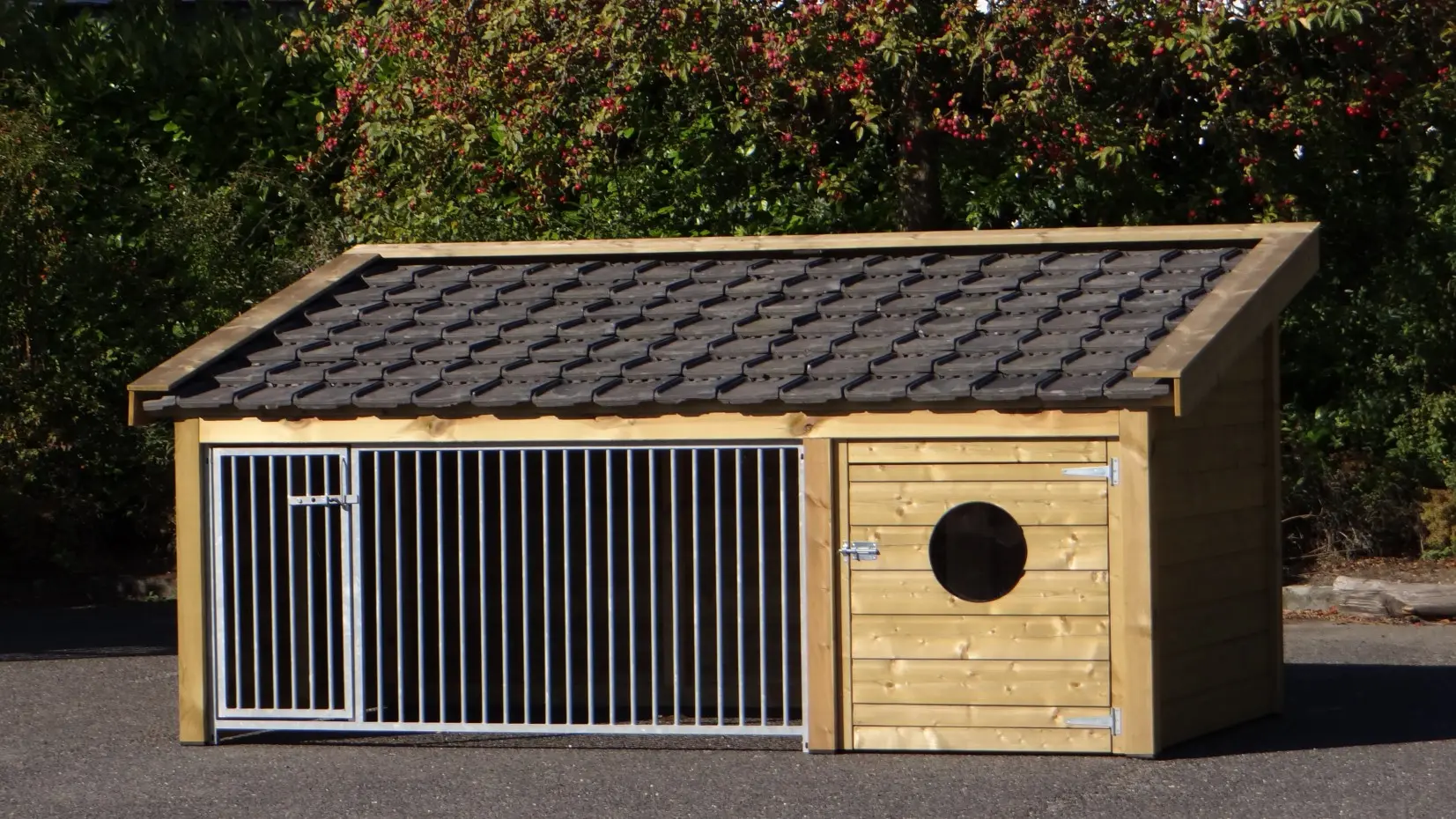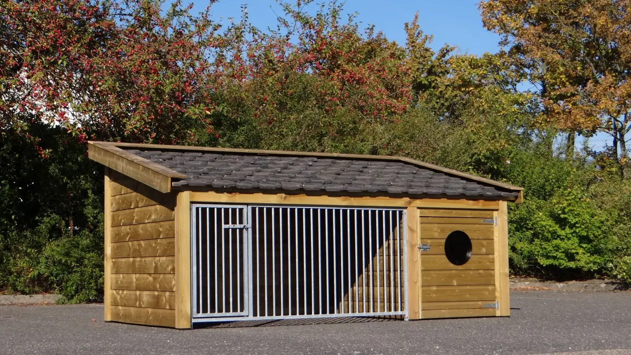 Niche pour chien Rex 1 est fabriquée en bois d'épicéa impregné et est équipée avec tuiles d'occassion. La nice fermée de cette niche mesure 150 x 90 cm. Le sol de la niche fermée est fabriqué en contreplaqué, offrant une base solide et durable. La niche pour chien est un panneau des barreaux galvanisée. Le chenil est approprié pour chiens de moyenne ou grande taille.