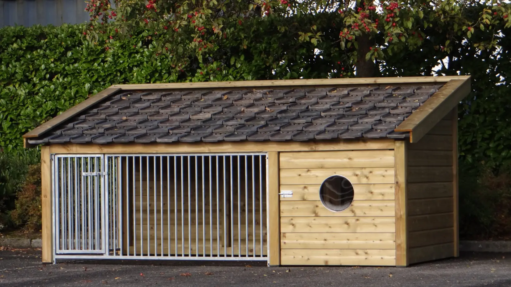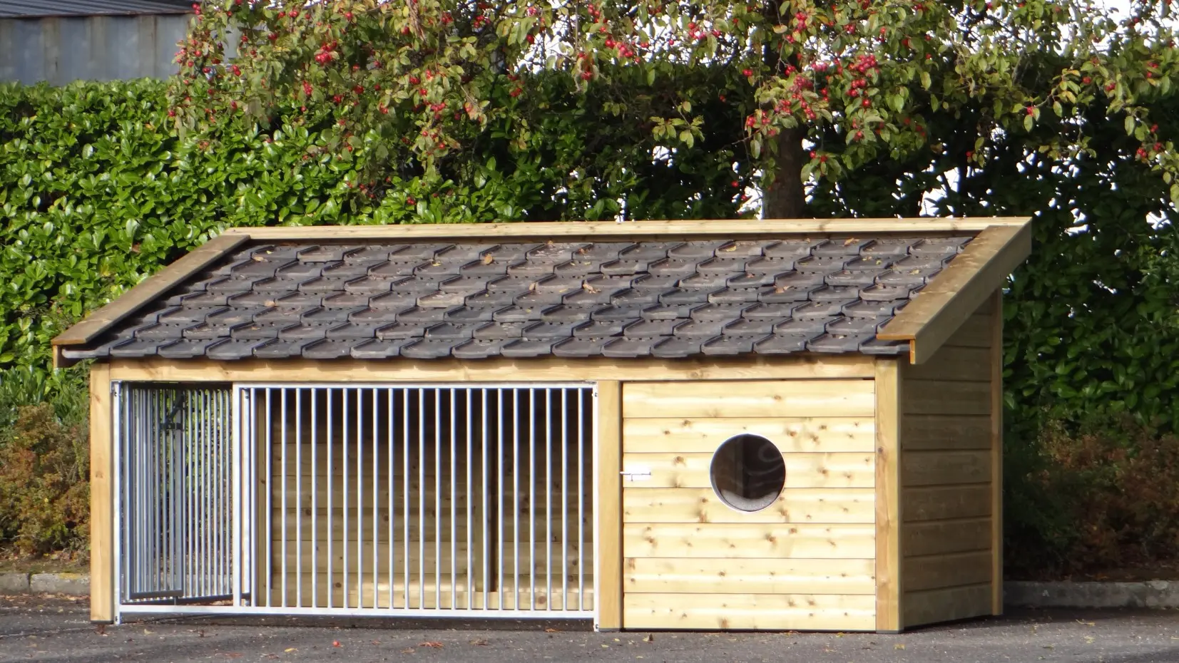 Le chenil pour chien Rex 2 est fabriquée en bois d'épicéa impregné et est équipée avec tuiles d'occassion. Le chenil a une grande nichoir avec un sol en contreplaquée. La niche est isolée, pour que votre chien puisse rester dehors toute l'année. Le chenil a 2 panneaux des barreaux galvanisées.