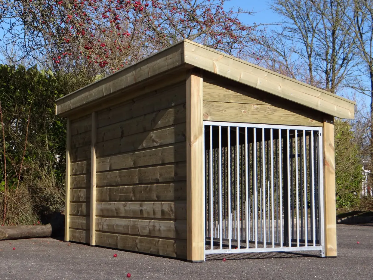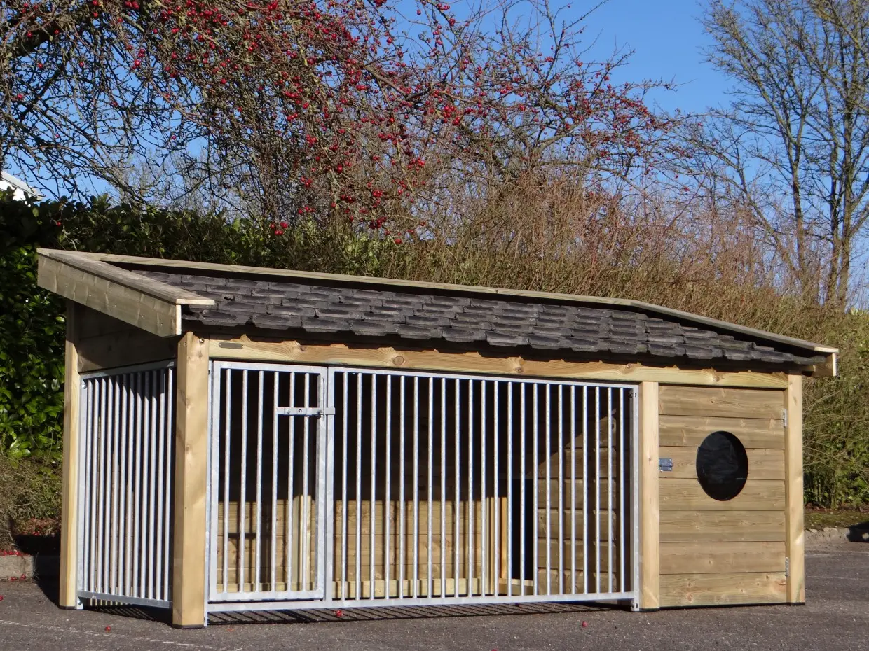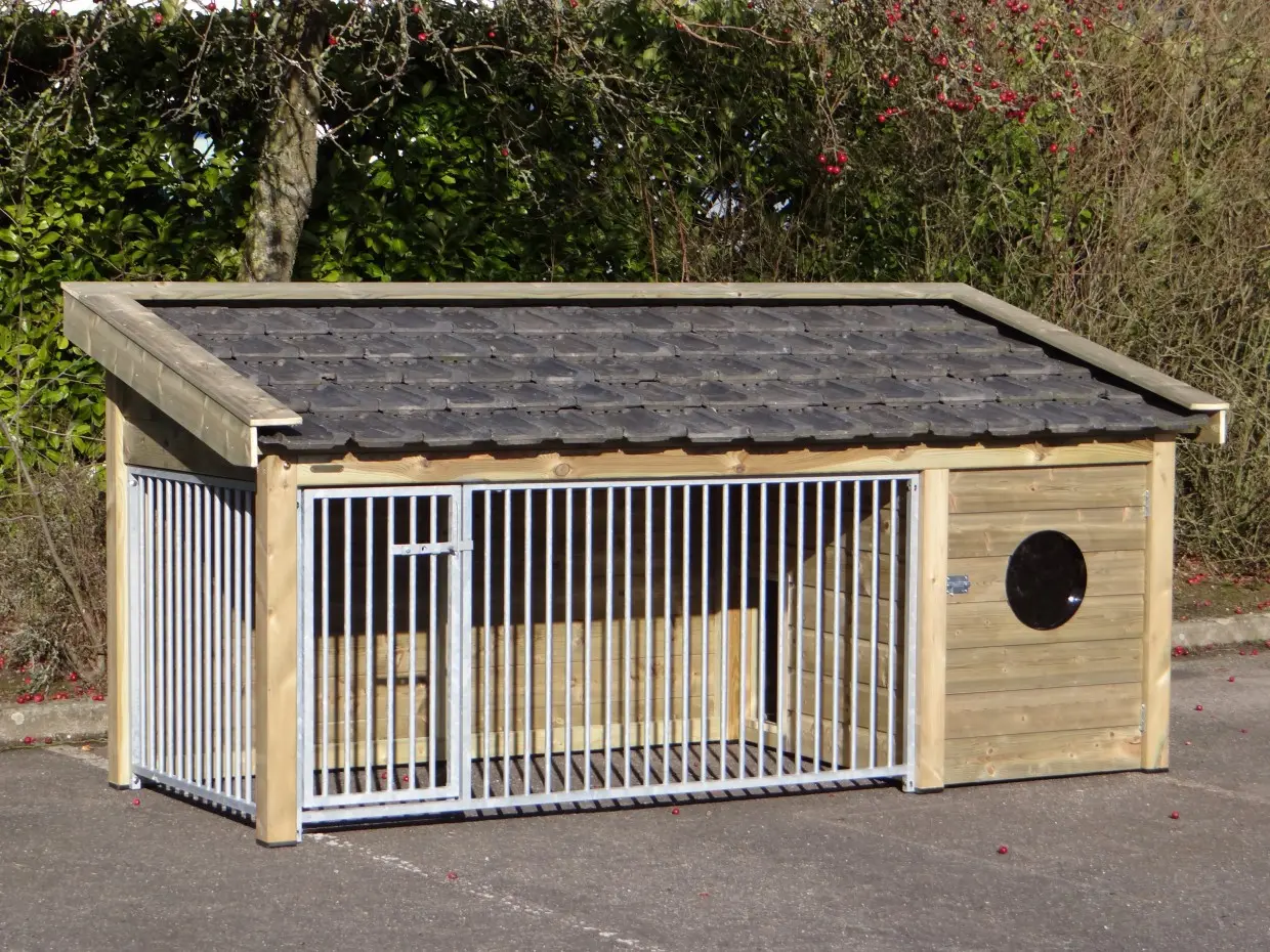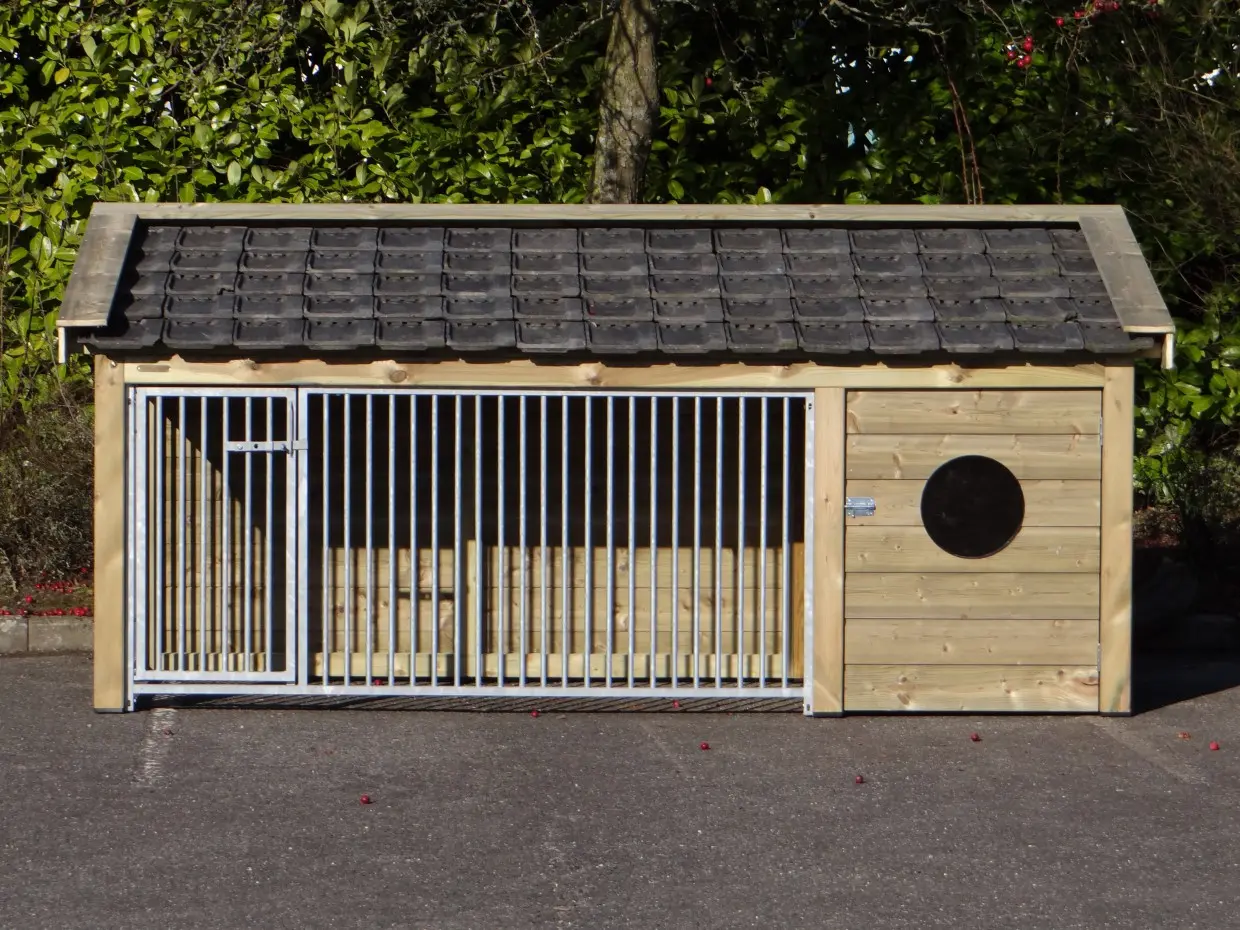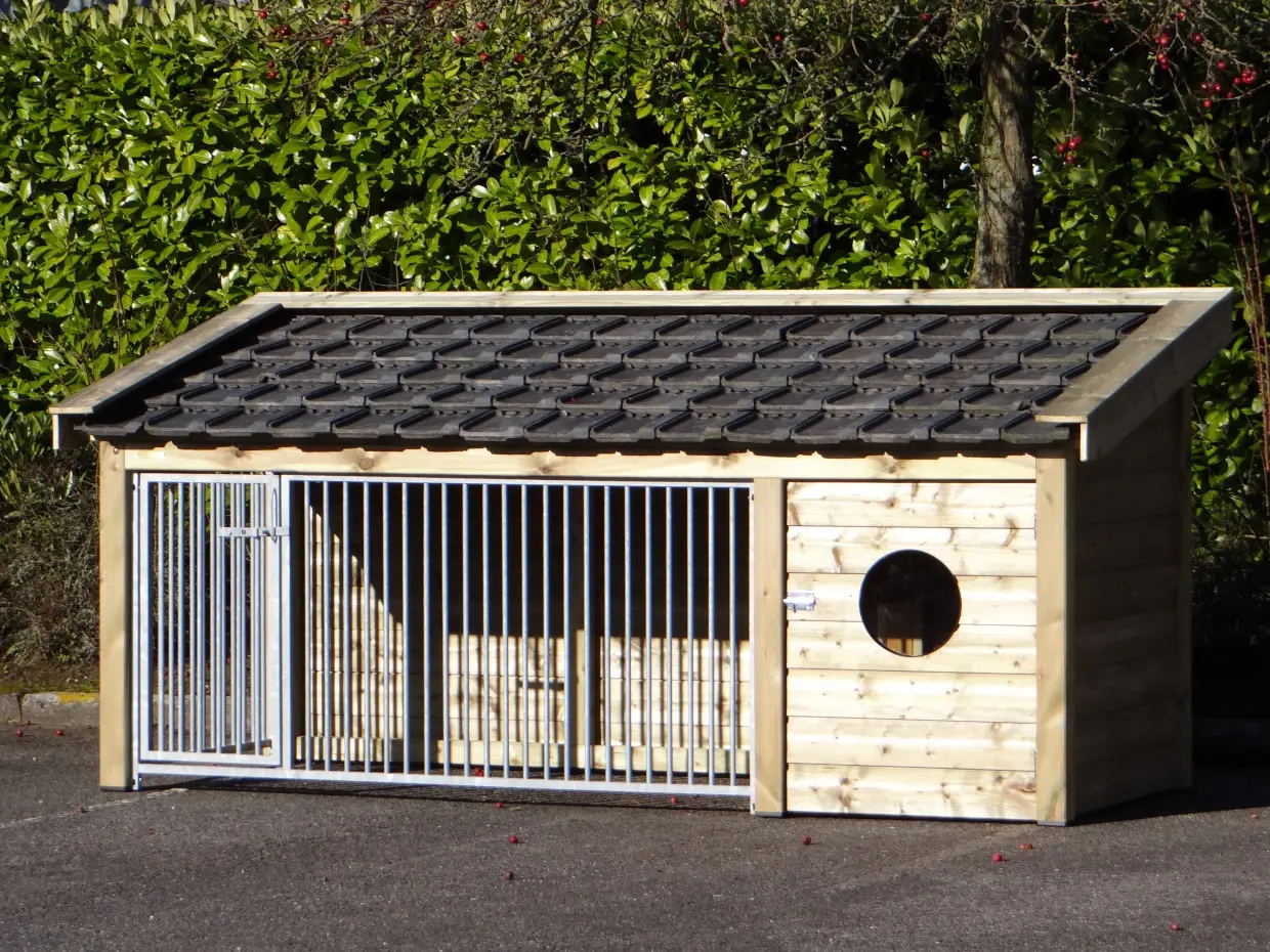 La niche Roxy 2, avec niche fermée intégrée et grand enclos, est une demeure extérieure d’exception pour votre chien. Le toit est recouvert de tuiles en céramique, les parois et débords sont en bois d’épicéa traité, et le plancher de l’abri est en contreplaqué béton. Une niche haut de gamme alliant confort et élégance.
