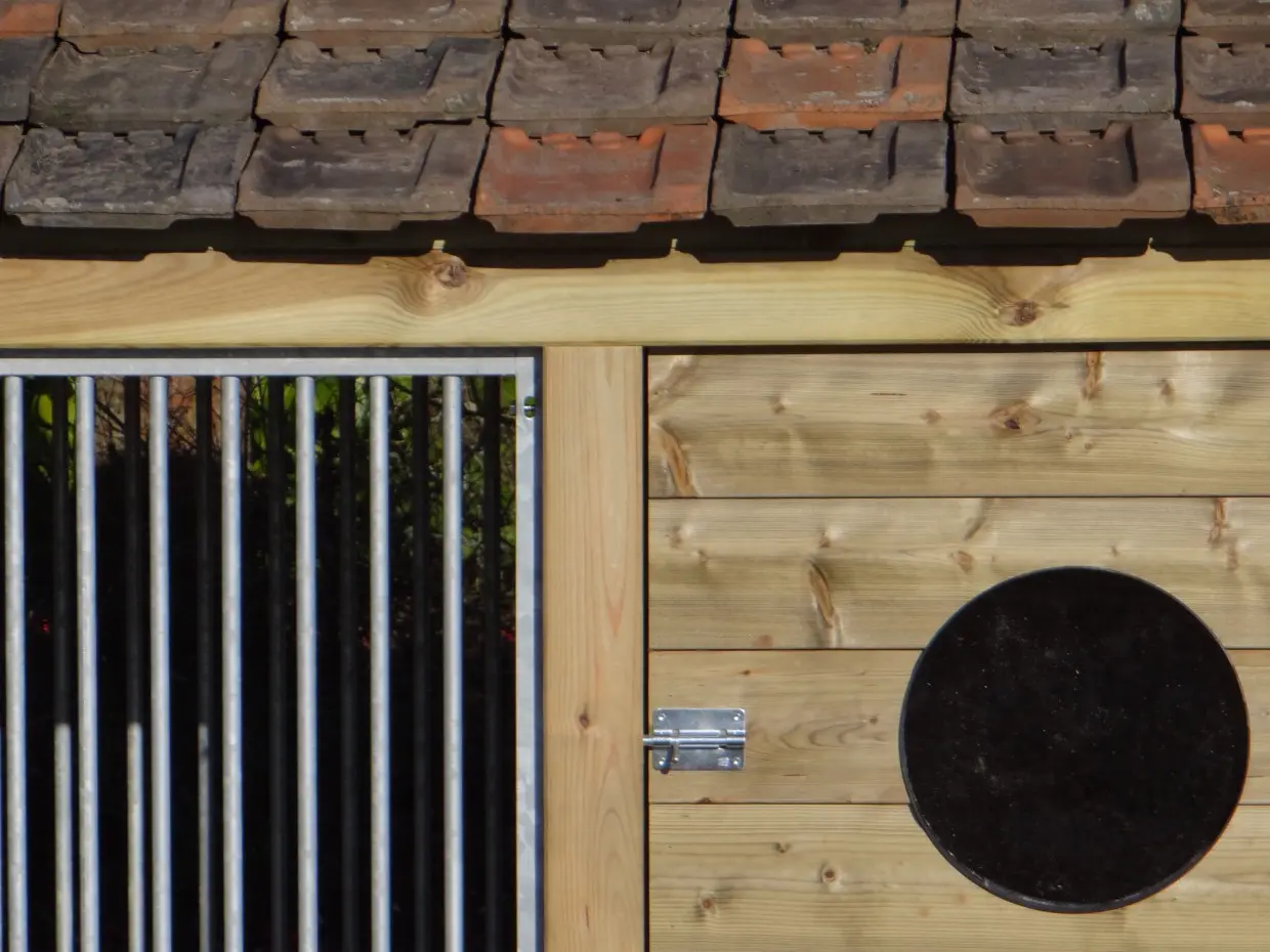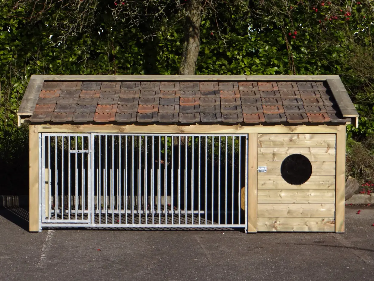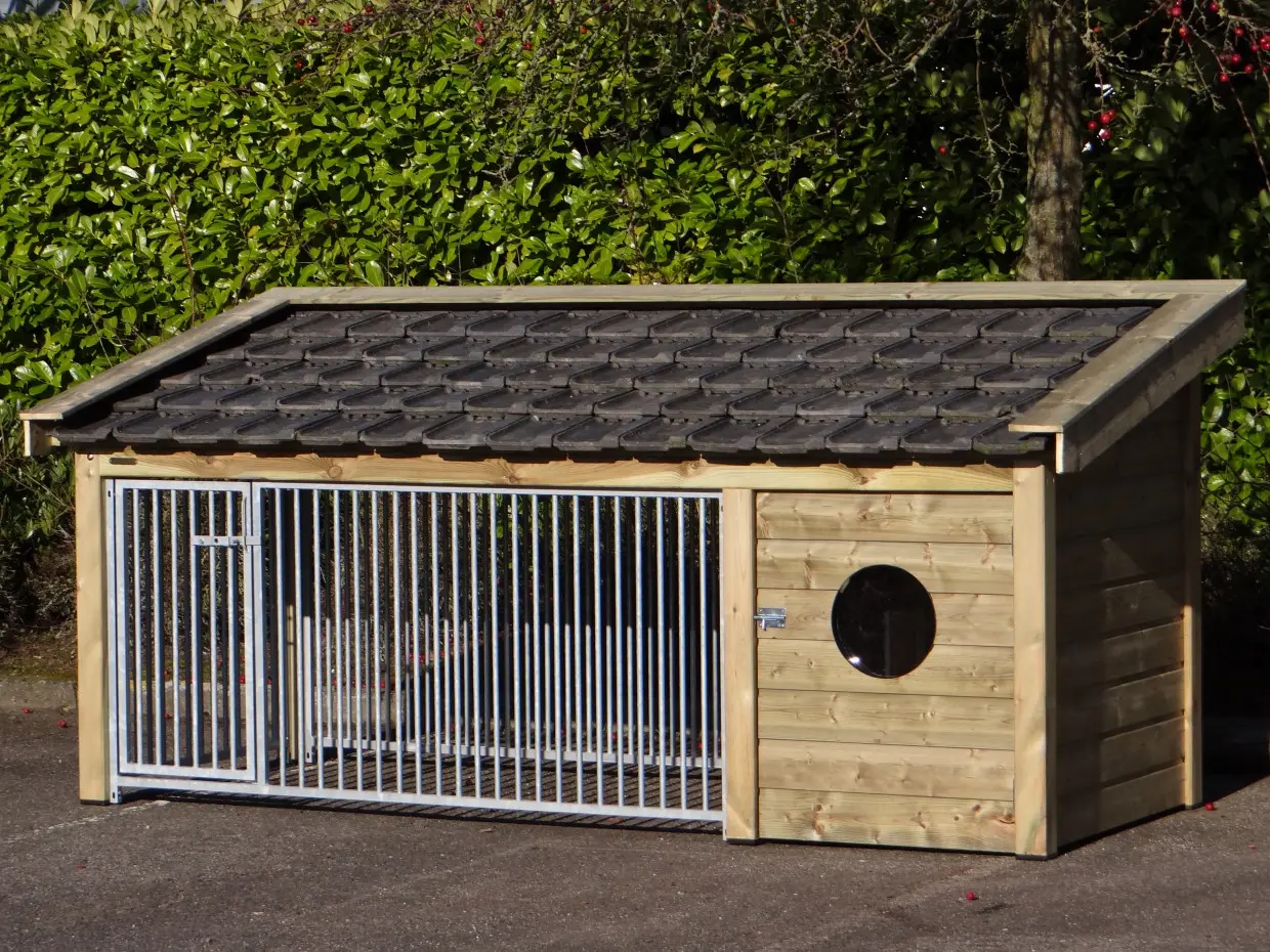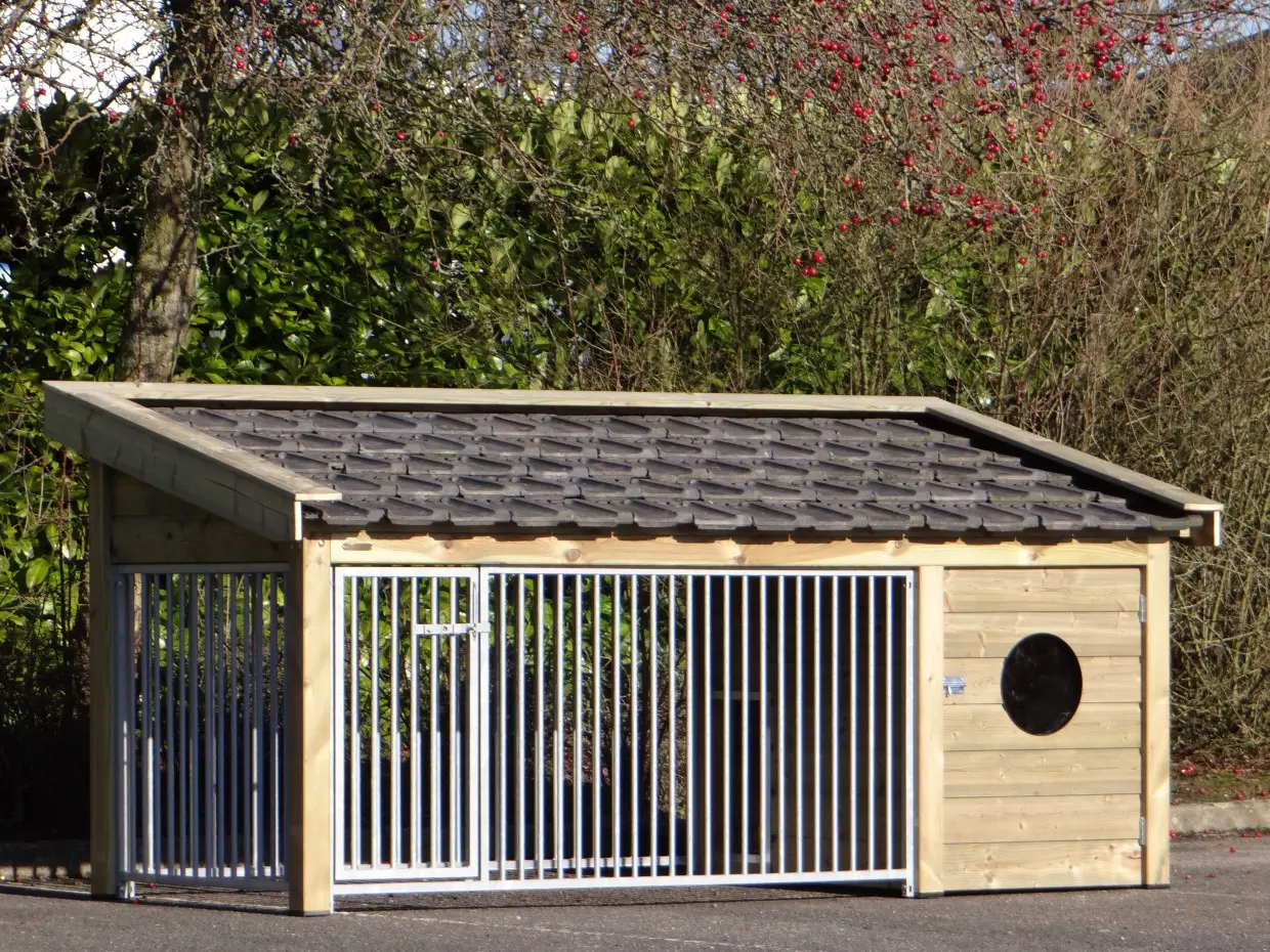 La niche Roxy 3 combine une niche fermée spacieux et un enclos ouvert sous un même toit. Le toit en tuiles céramiques est disponible en trois coloris. Le bois d’épicéa traité ne nécessite aucun entretien. Le plancher en contreplaqué béton avec surface antidérapante se nettoie facilement. Avec ses grilles sur trois côtés, la Roxy 3 offre à votre chien un espace extérieur haut de gamme et confortable.