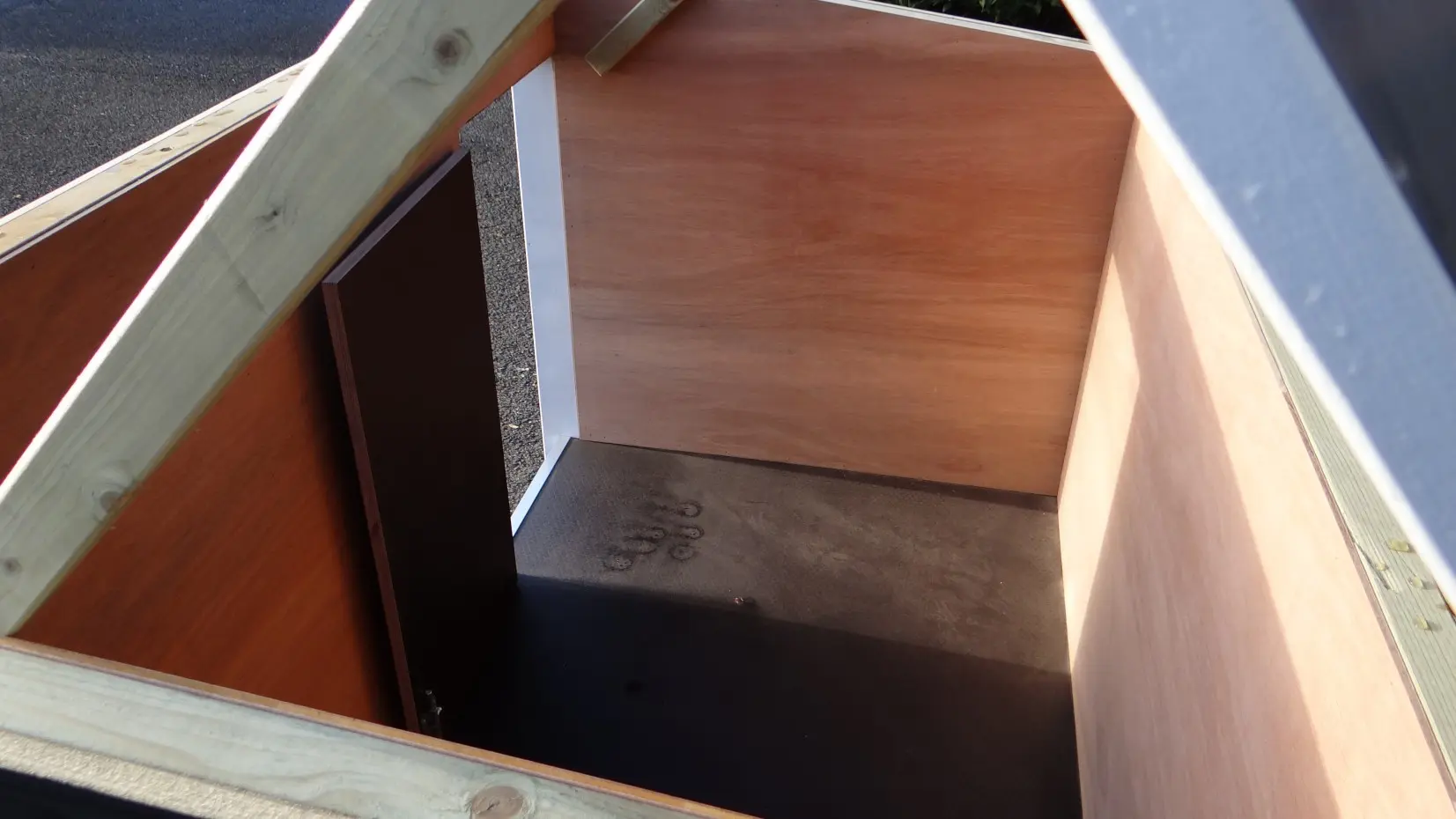 - L’intérieur est revêtu de contreplaqué dur.