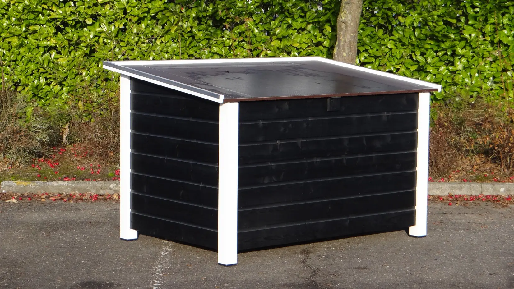Vous cherchez une grande niche ? La niche fermée Loebas est idéale pour les grands chiens tels que le Dogue allemand, le Leonberg, le Bouvier bernois ou le Saint-Bernard. Le toit plat en contreplaqué béton, bordé d’aluminium, peut s’ouvrir et permet au chien de s’y allonger. L’entrée est protégée par un encadrement en aluminium, et la niche dispose d’une cloison coupe-vent ainsi que d’un plancher antidérapant.