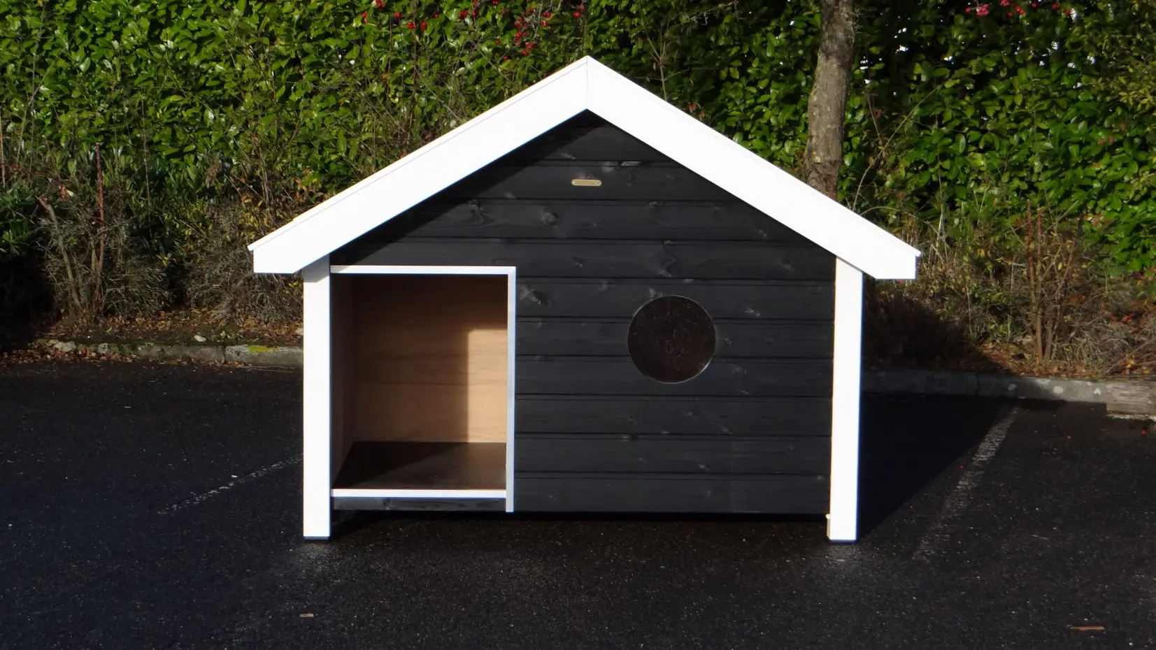 Niche pour cochon BINQ est une niche fermée de la meilleure qualité. Les panneaux sont renforcés par un poutre de construction, ainsi que c'est une niche qui peut encaisser des coups. La niche est fabriquée en bois d'épicéa impregné et le bois est peint en les couleurs noir et blanc.
