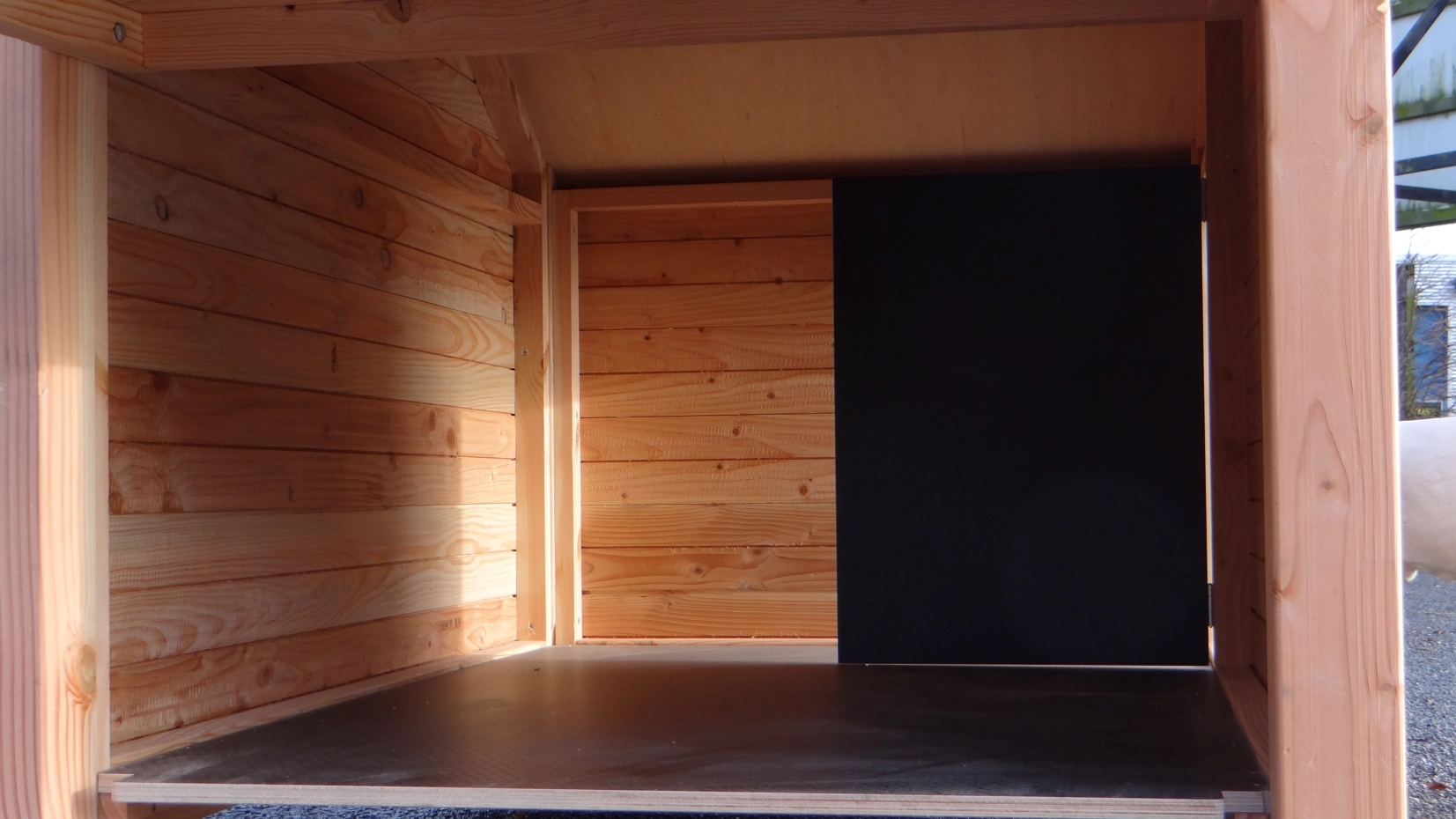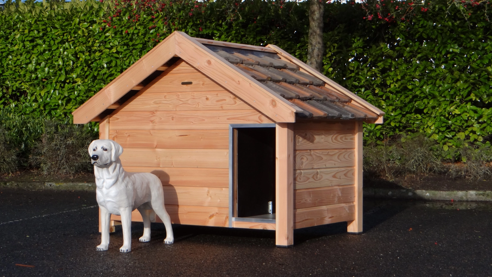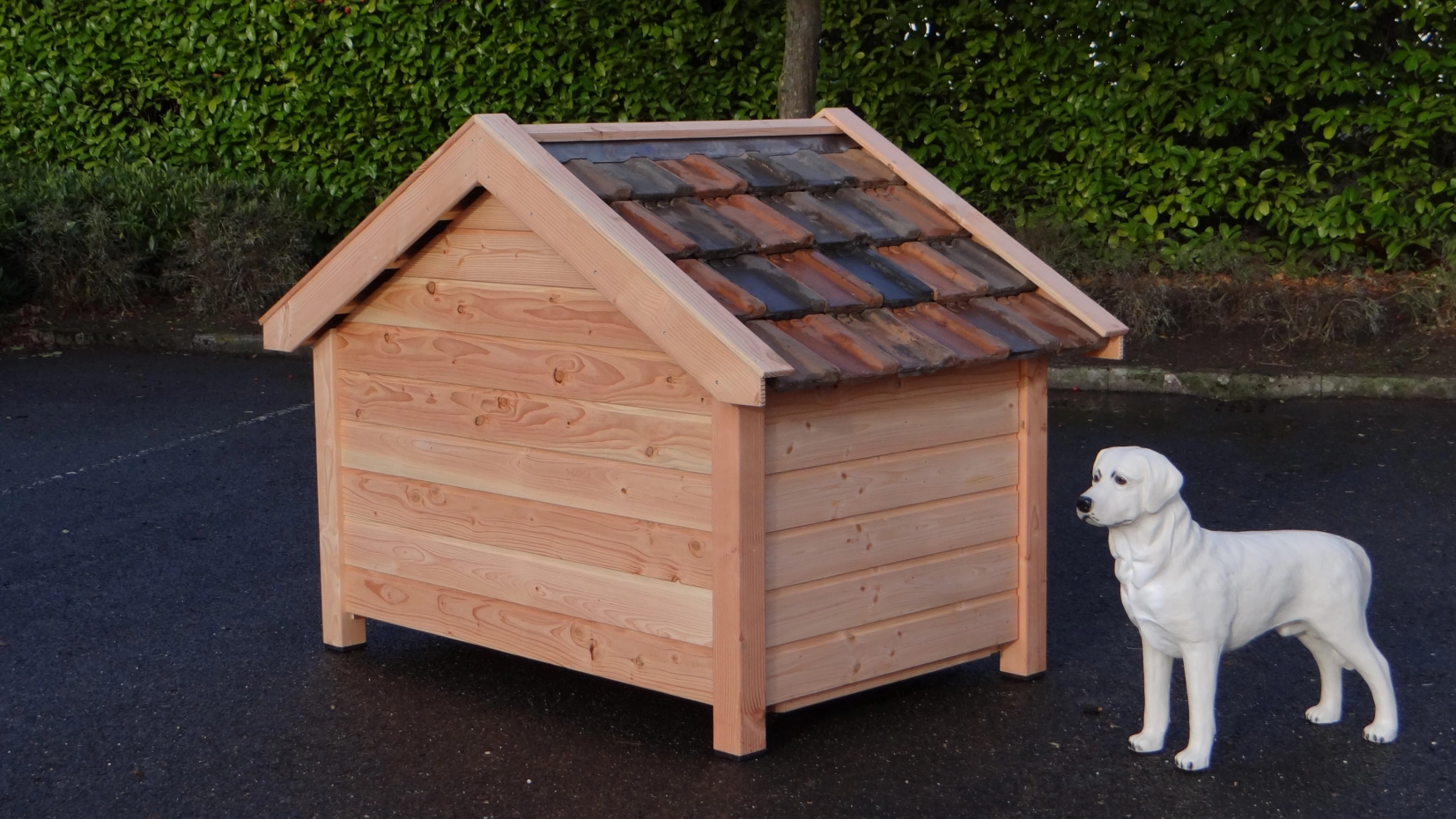 Niche Snuf est une grande niche de haute qualité et très robuste. Elle est fabriquée en bois de Douglas non traité, combiné avec du contreplaqué béton et de véritables tuiles. Cette niche convient aux grands chiens comme le Boxer, le Berger Allemand ou le Malinois. L’intérieur de la niche Snuf mesure 150x100 cm. Derrière le pare-vent articulé, il y a un espace de 110x100 cm.