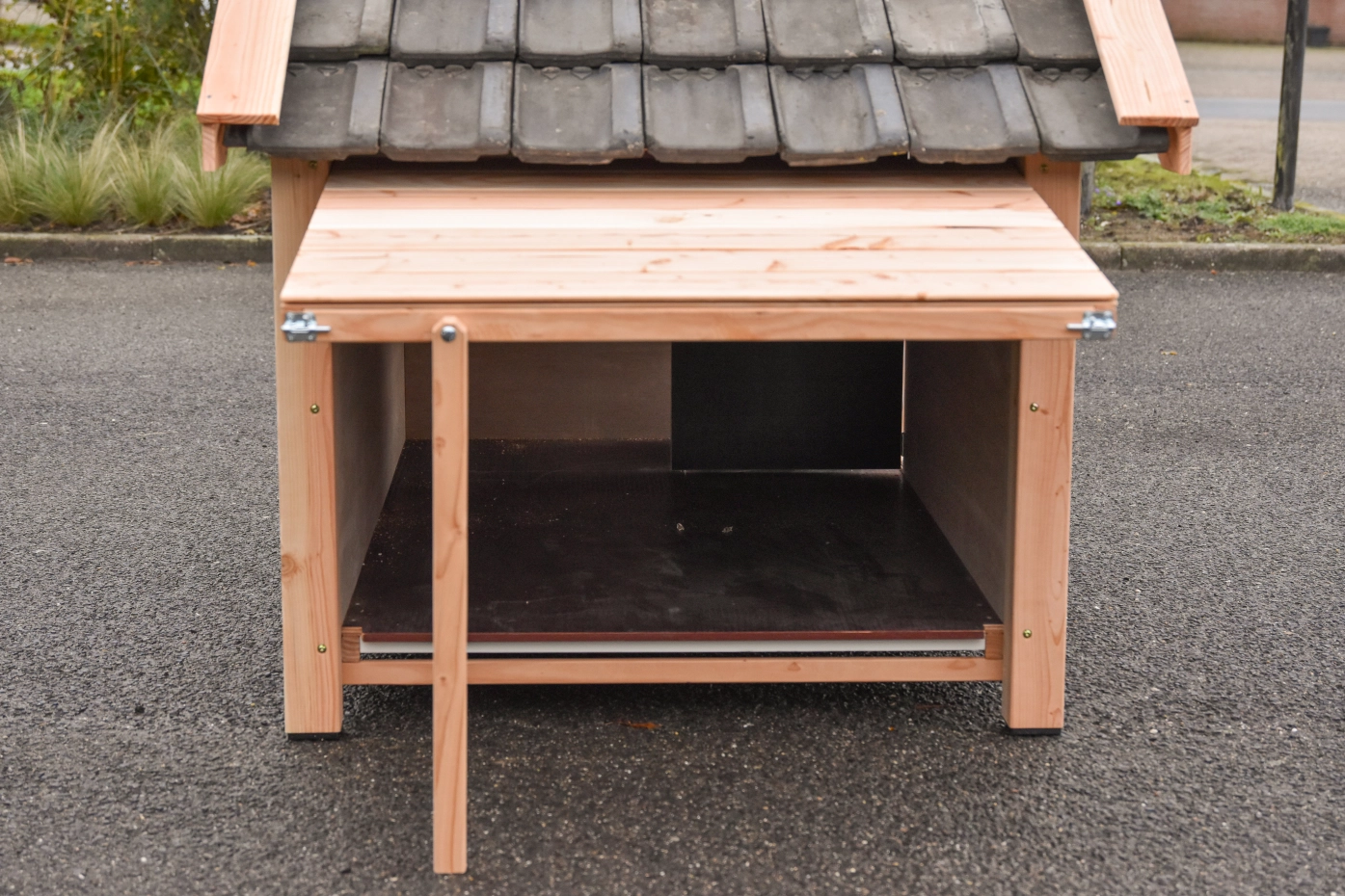 - La niche a des pieds en plastique noir, ce qui la rend plus facile à déplacer, et la niche sera mieux protégée contre l'humidité