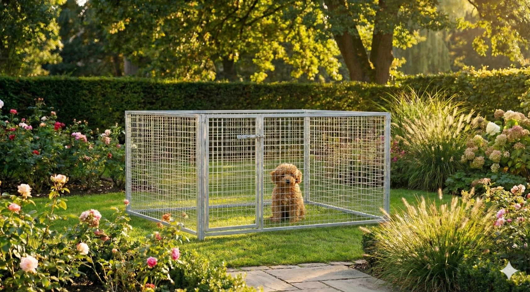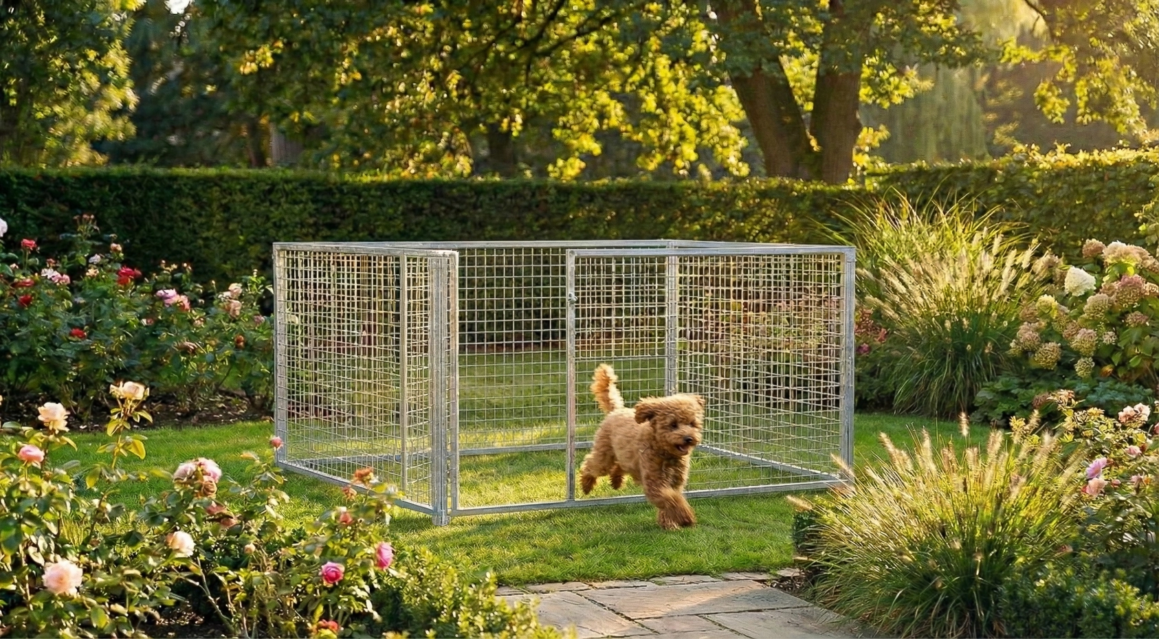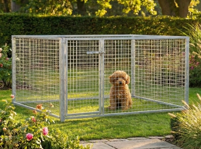 L'enclos pour chiot galvanisée de 2x1,5m est un bel espace extérieur! L'enclos consiste en 2 panneaux de 1,5m et 2 panneaux de 2m.