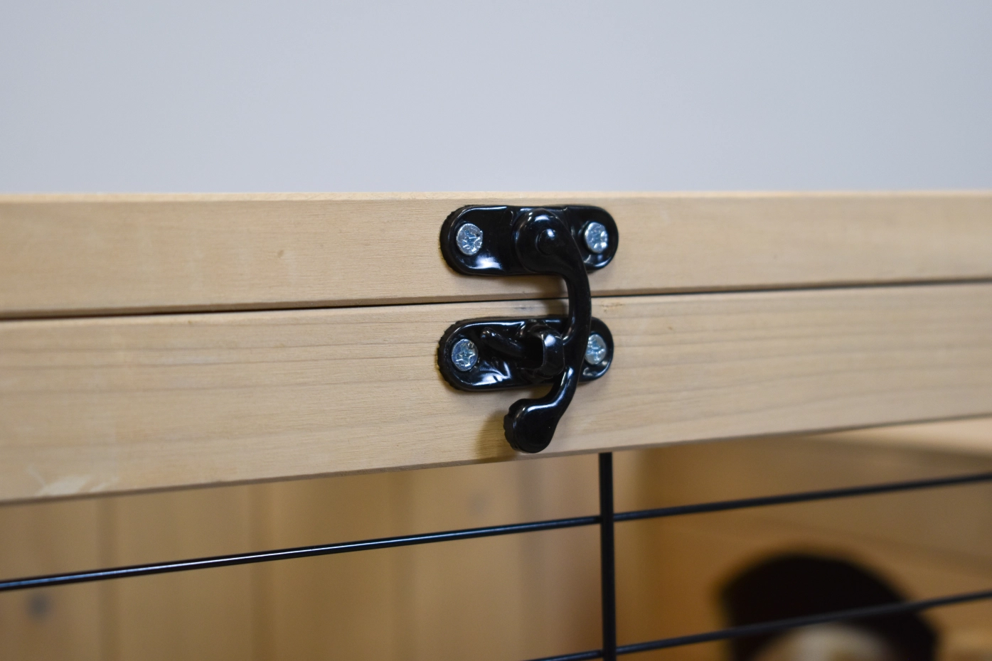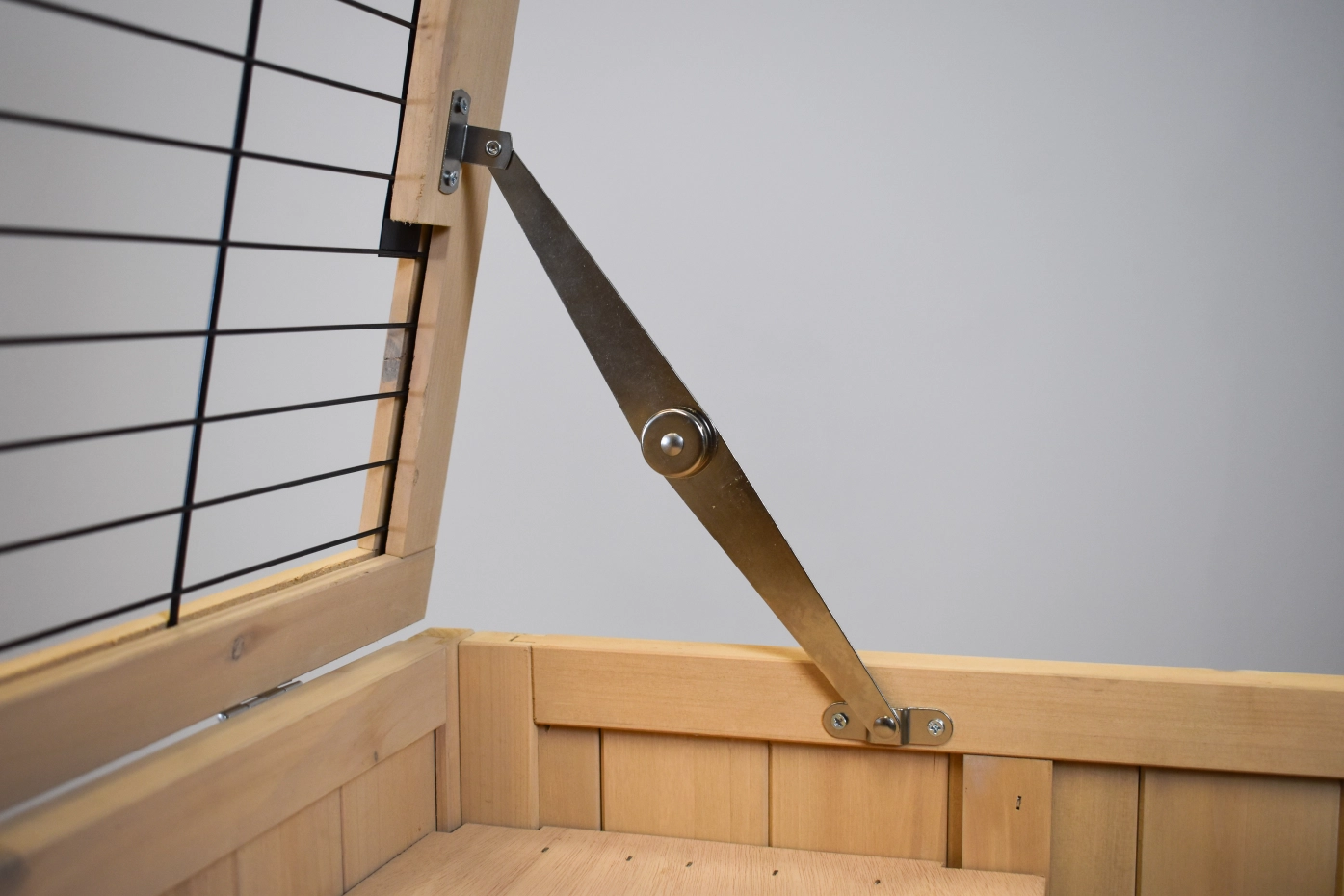 Il est conseillé de traiter périodiquement les charnières et les serrures avec un spray en silicone ou un spray pour serrures pour éviter la rouille et la corrosion. Si l'animal n'est pas dans un endroit abrité, nous vous conseillons d'ancrer l'enclos.