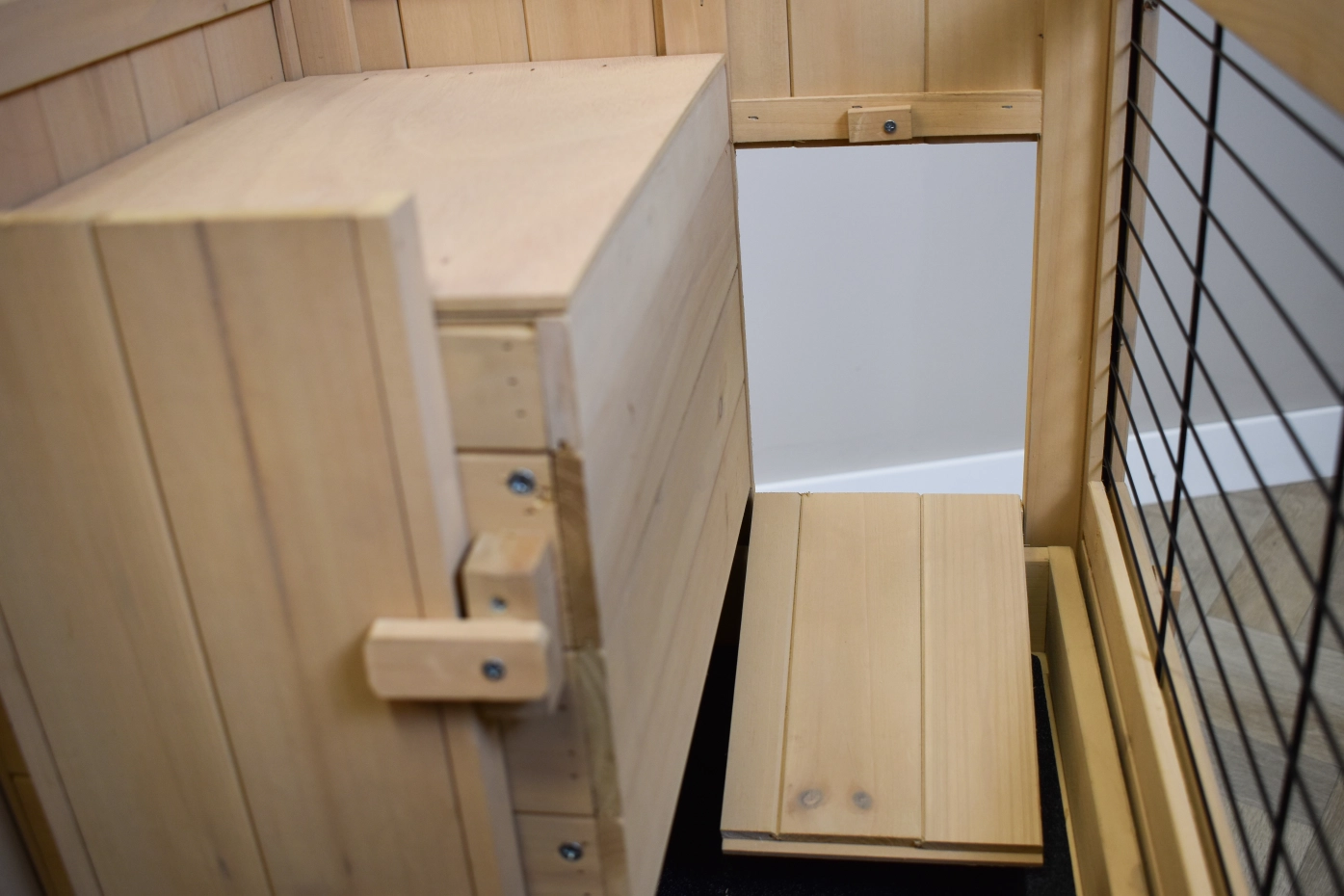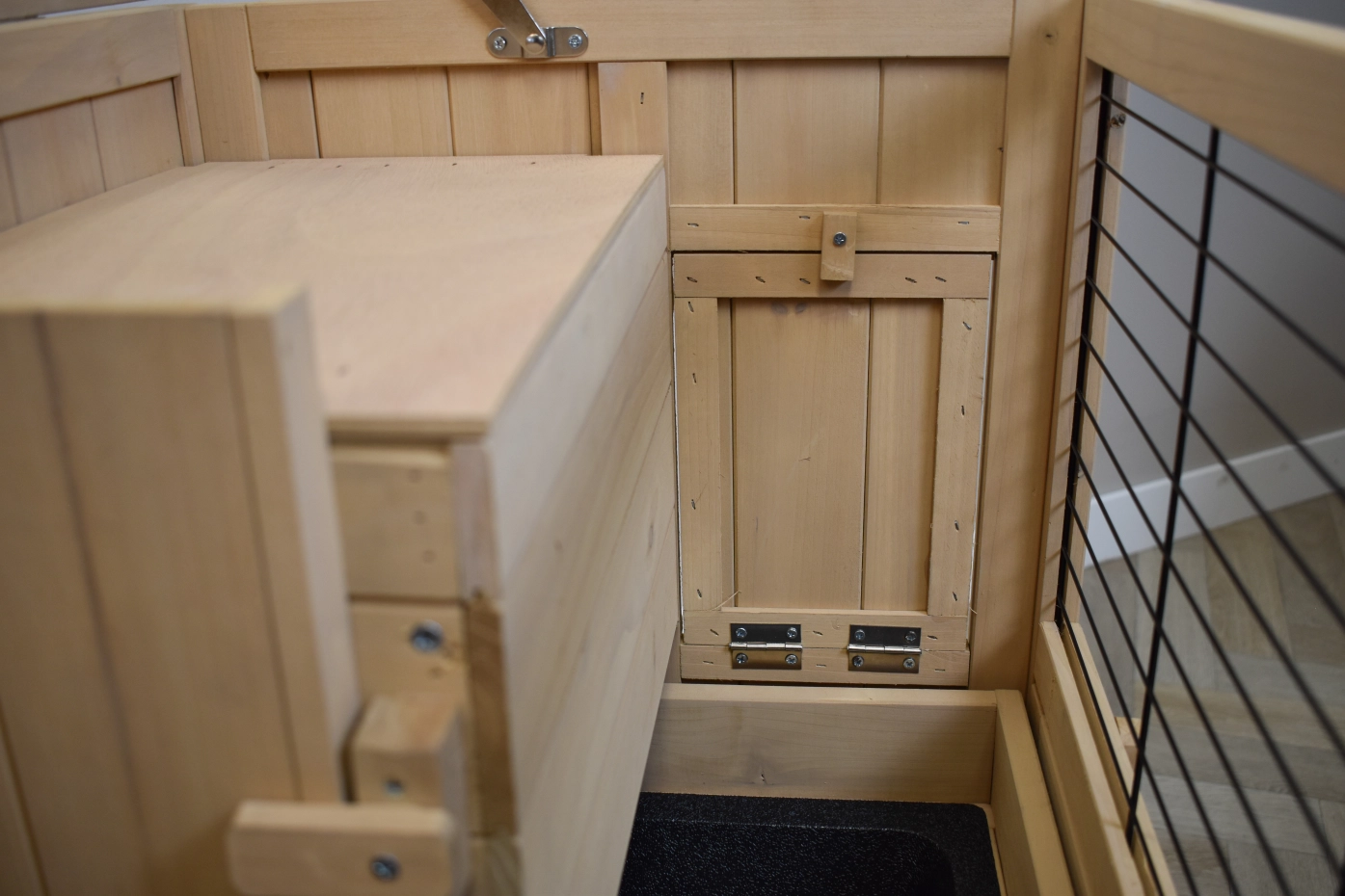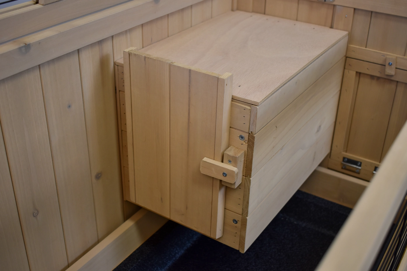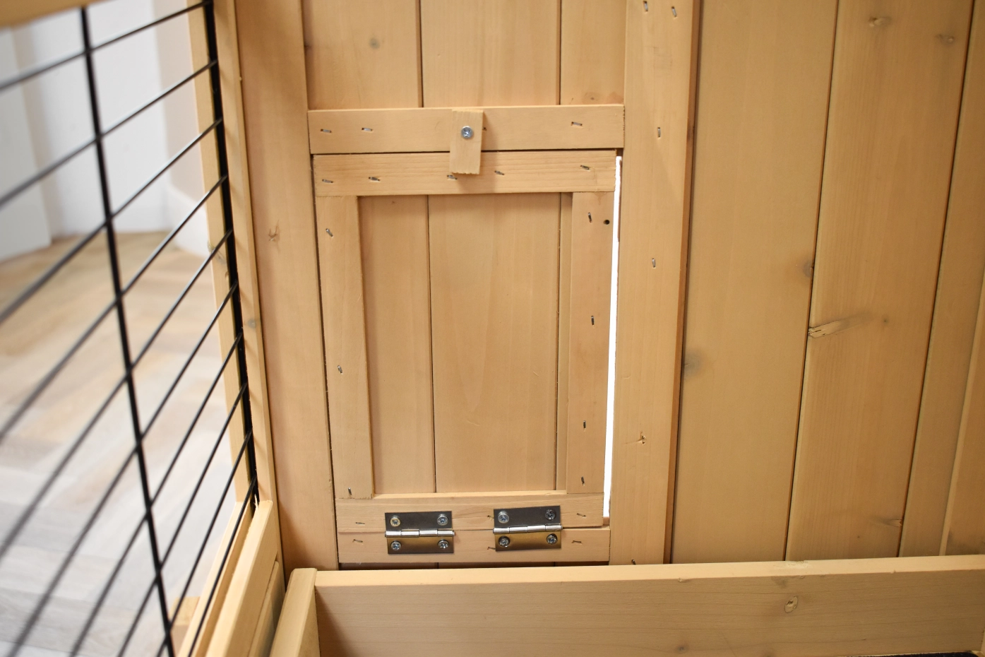 Cet enclos pour animaux est fabriqué à la main en bois de pin. Le bois de pin est un bois tendre particulièrement beau, apprécié depuis longtemps dans notre gamme des enclos d'animaux. En particulier, le grain du bois, le dessin à la flamme et les variations de couleur donnent à l'enclos de l'animal un aspect solide et chaleureux.