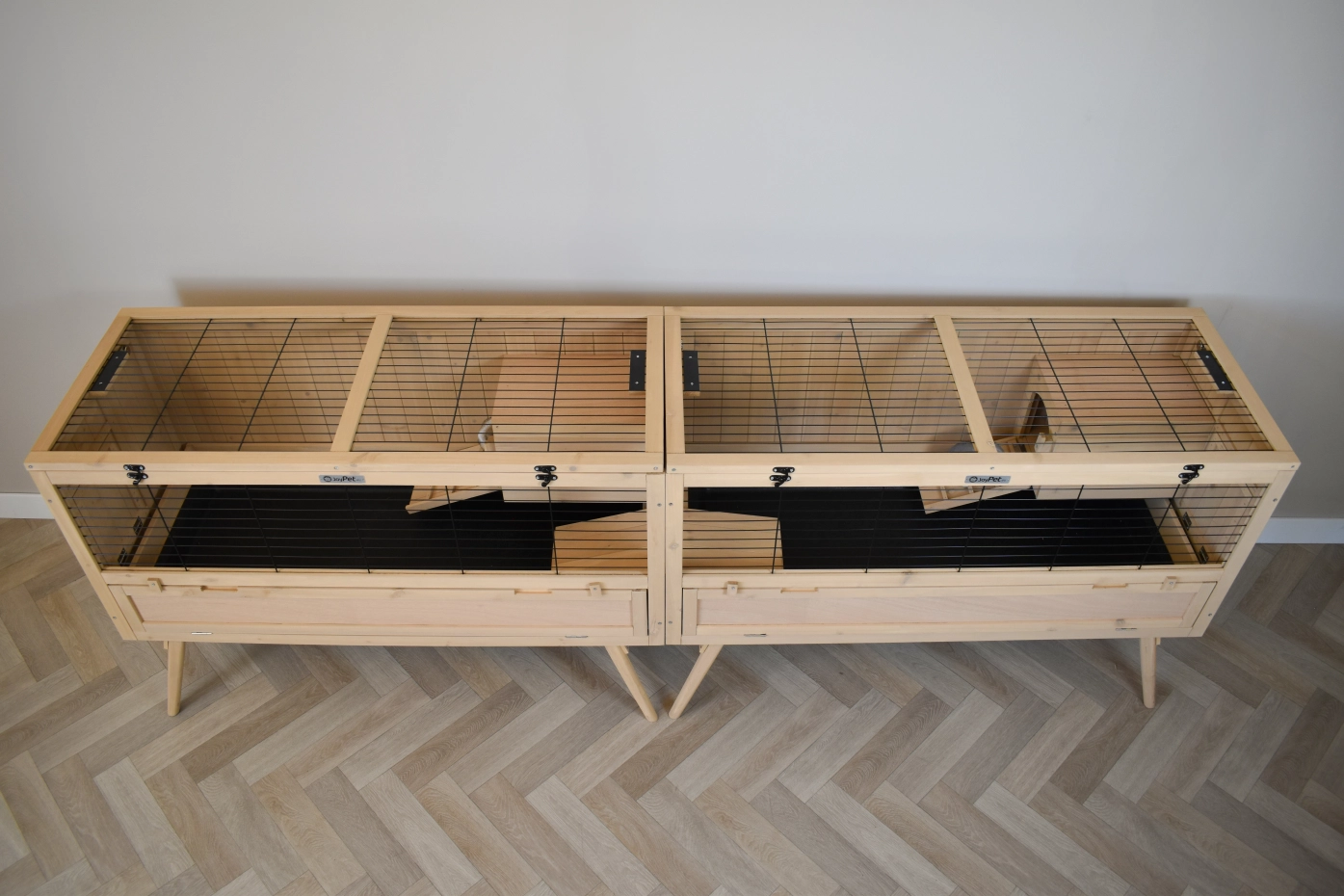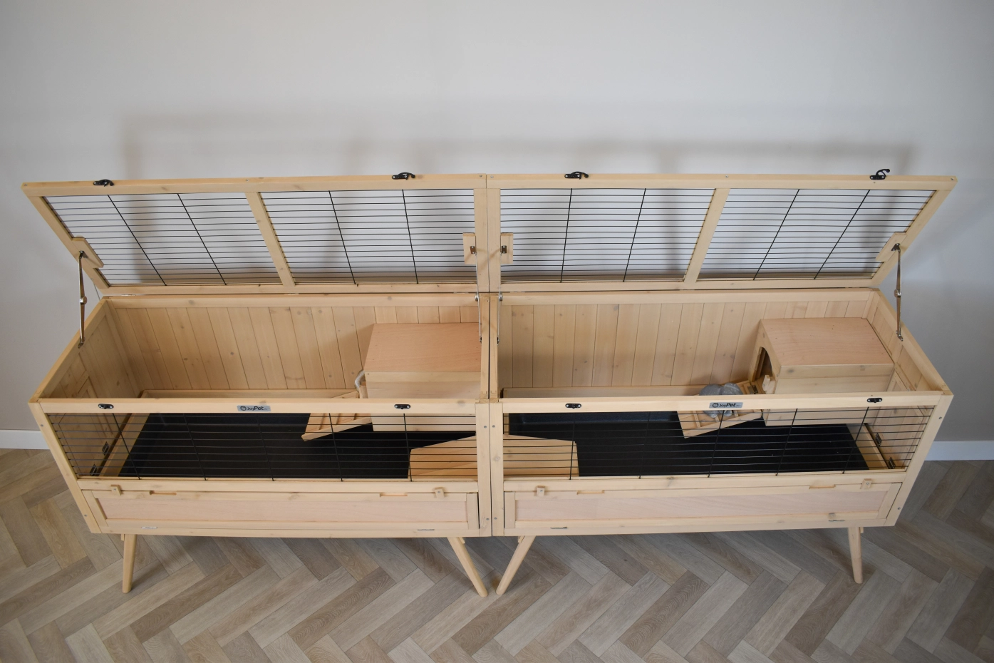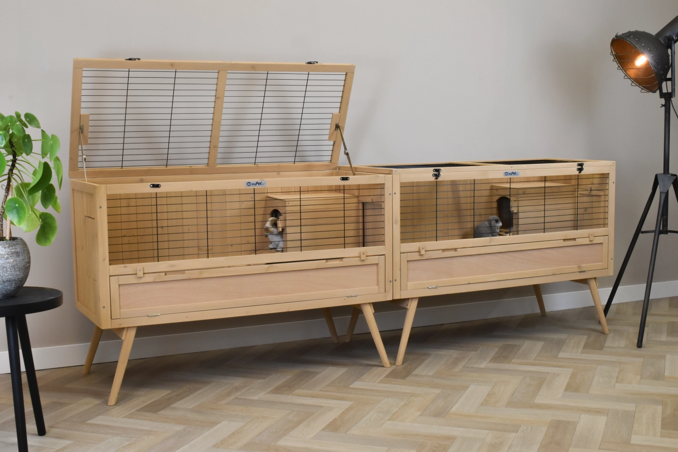 Ce clapier d'intérieur rétro se compose de deux clapiers distincts qui peuvent être facilement reliés. Ainsi, vous pouvez créer en un rien de temps un clapier plus spacieux pour vos cochons d'Inde ou petits lapins. Le clapier est doté de deux espaces de couchage, idéaux pour un confort et un repos supplémentaires. Un choix pratique et esthétique pour votre intérieur !
