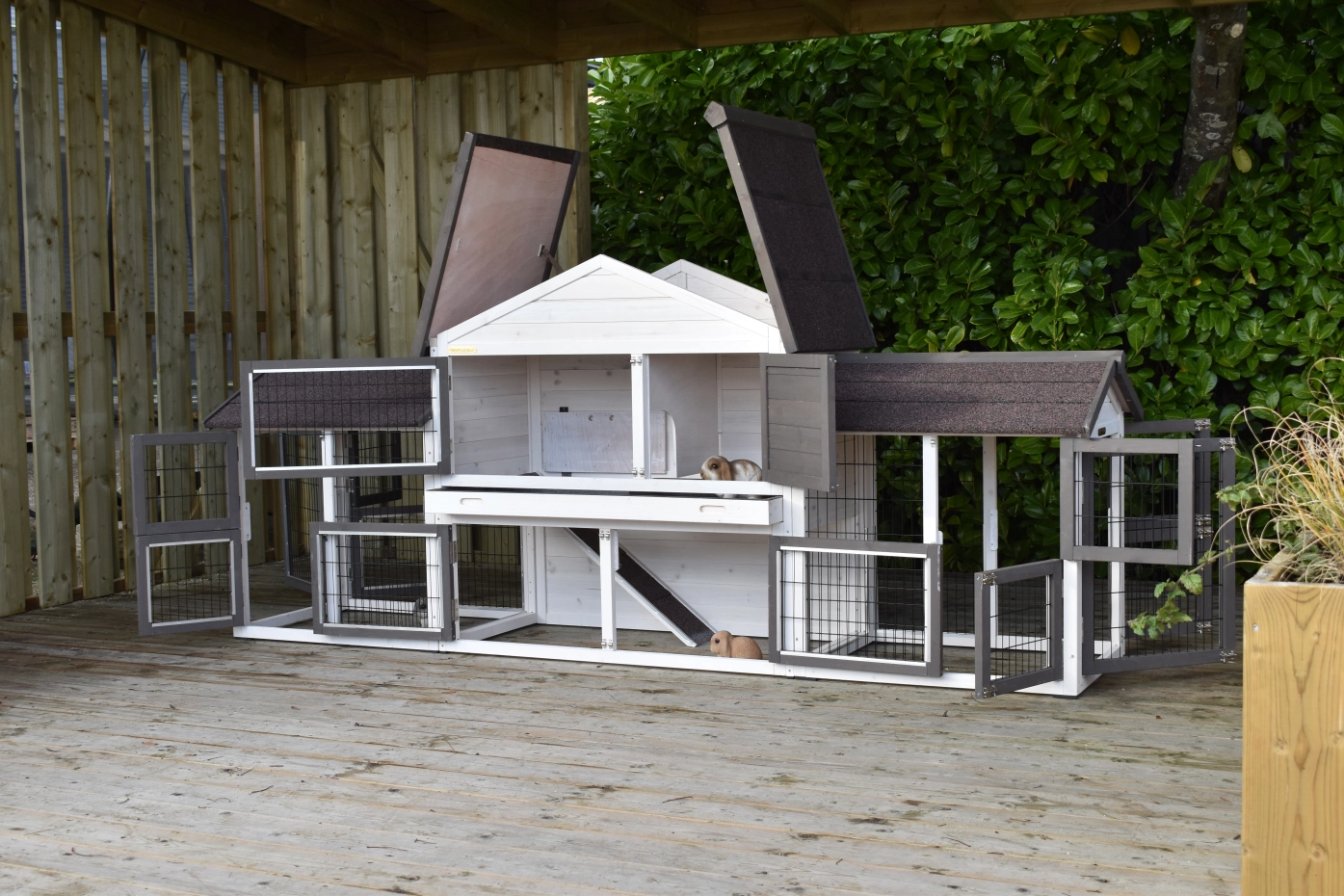 Le clapier pour lapin Regular Medium avec 2 enclos offre un espace de vie confortable pour vos lapins. Le clapier et les enclos sont partiellement équipés de bandes anti-rongeurs en aluminium. Les lapins peuvent se déplacer facilement de haut en bas grâce à la passerelle. Le plancher de l'étage est verrouillable pour plus de sécurité.