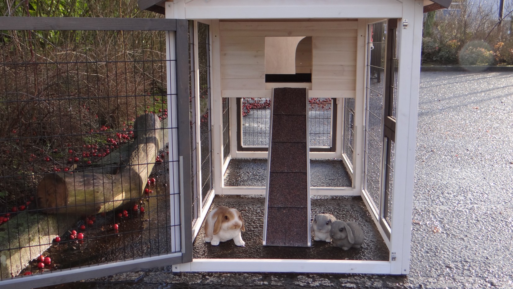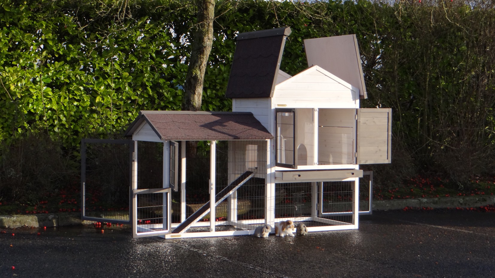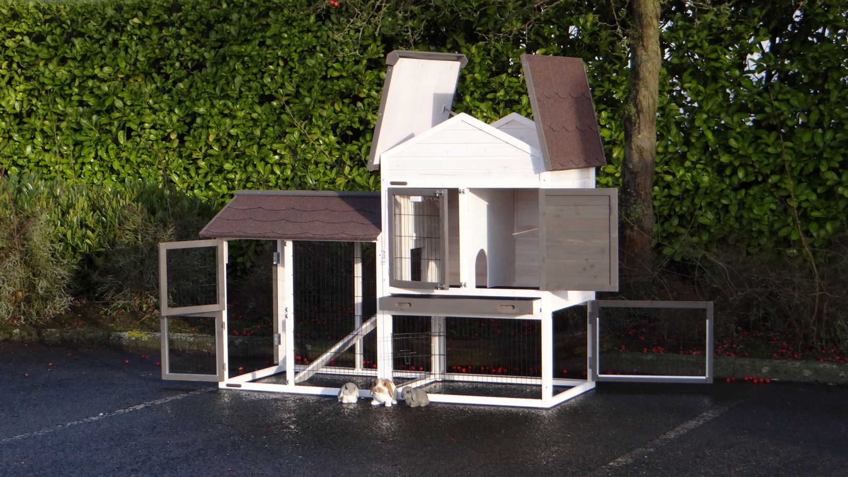 Il est conseillé de traiter périodiquement les charnières et les serrures avec un spray en silicone ou un spray pour serrures pour éviter la rouille et la corrosion. Si l'animal n'est pas dans un endroit abrité, nous vous conseillons d'ancrer l'enclos.