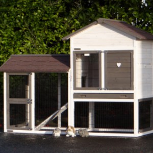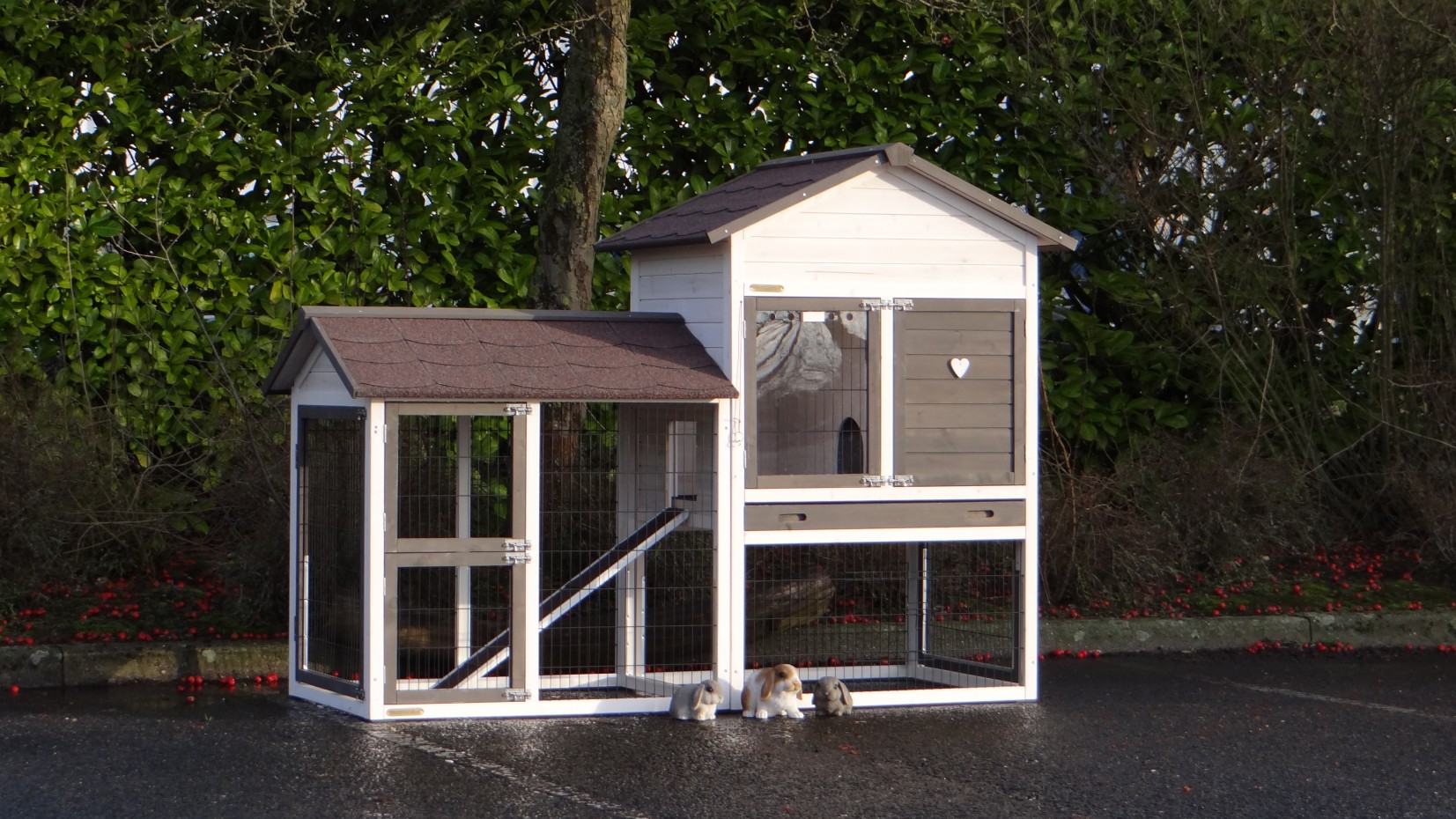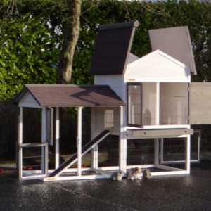 Le bois utilisé pour le loft est un produit naturel unique qu'a été produit dans le pays d'origine, après une sélection rigoureuse, dans une manière traditionelle. C'est caractéristique et unique à tous égards. Ce produit en bois a été un traitement manuel. Aucune pièce de bois ne possède la même forme, la même structure ou la même couleur, de sorte que les nuances de couleur sont inévitables, même dans un morceau de bois. Les fissures dues au vent, les craquelures, les imperfections et la présence de gros et de petits noeuds témoignent de leur origine et de leurs années de croissance. Les bosses sont généralement mises à jour manuellement avec du bois. Grâce à leur utilisation et à l’influence de la lumière, les nouveaux maisons pour animaux auront une couleur plus chaude au fil du temps. Les différences de couleur au modèle d'exposition sont donc possibles. L'enclos pour animaux est munie d'un fini antitache dans les couleurs comme sur la photo. Vous devez encore décaper le bois pour éviter les moisissures et la pourriture. Vous pouvez facilement commander des taches directement.