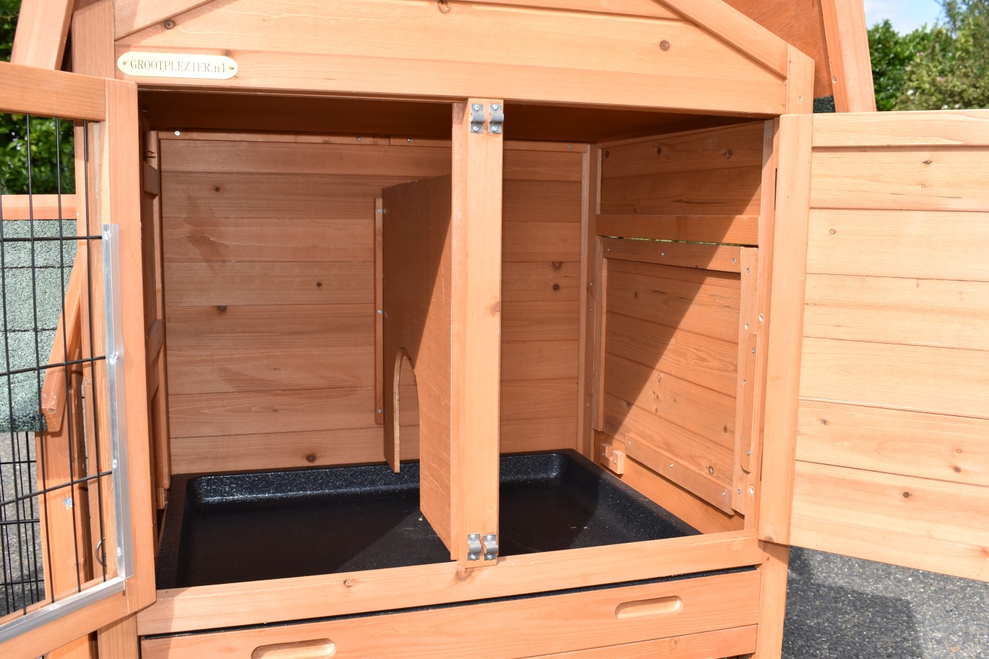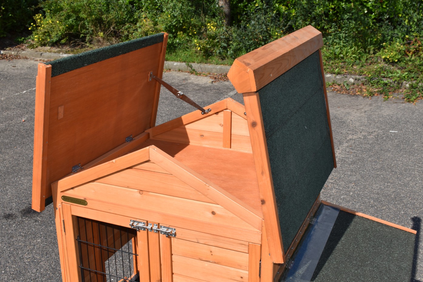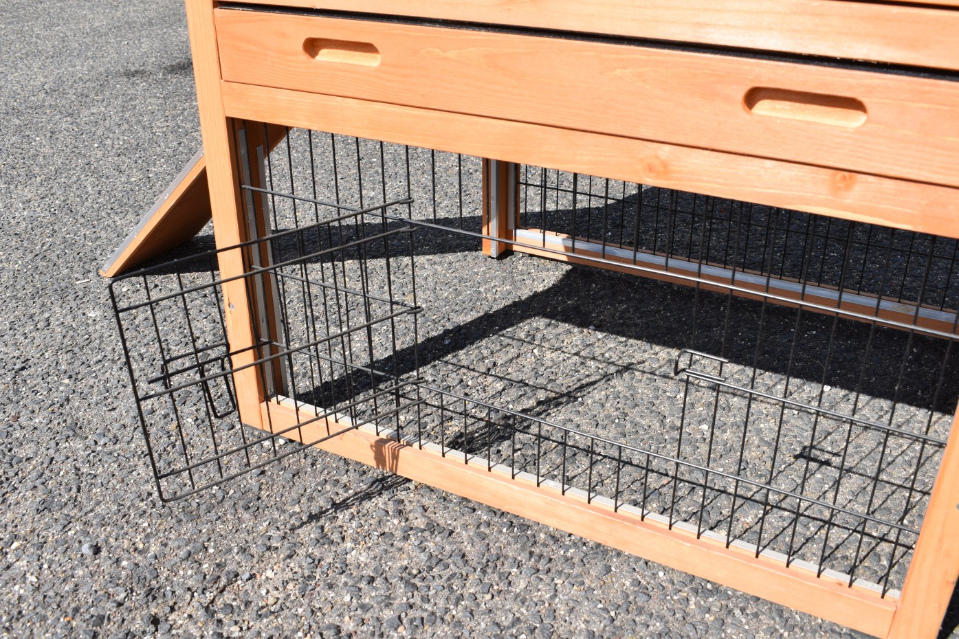 Le clapier Prestige Small avec enclos offre à vos lapins un abri sûr et confortable. Grâce à ses grandes portes et à son tiroir amovible en plastique, l’entretien est simple. Les bords anti-ronge et les pieds en caoutchouc assurent une grande solidité. Dimensions : 162 × 72 × 122 cm.