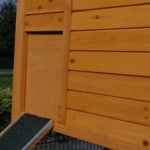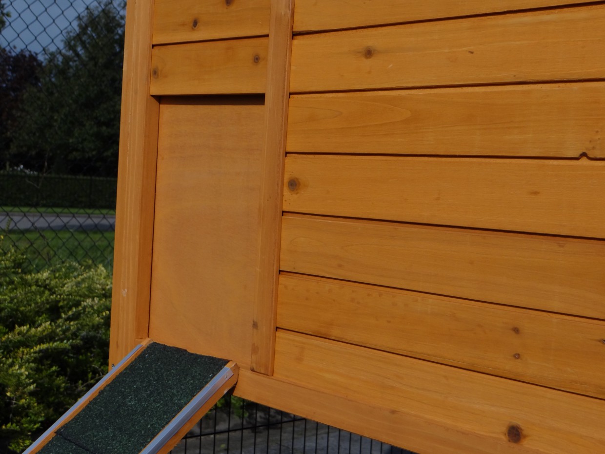 Le bois utilisé pour le loft est un produit naturel unique qu'a été produit dans le pays d'origine, après une sélection rigoureuse, dans une manière traditionelle. C'est caractéristique et unique à tous égards. Ce produit en bois a été un traitement manuel. Aucune pièce de bois ne possède la même forme, la même structure ou la même couleur, de sorte que les nuances de couleur sont inévitables, même dans un morceau de bois. Les fissures dues au vent, les craquelures, les imperfections et la présence de gros et de petits noeuds témoignent de leur origine et de leurs années de croissance. Les bosses sont généralement mises à jour manuellement avec du bois. Grâce à leur utilisation et à l’influence de la lumière, les nouveaux maisons pour animaux auront une couleur plus chaude au fil du temps. Les différences de couleur au modèle d'exposition sont donc possibles. L'enclos pour animaux est munie d'un fini antitache dans les couleurs comme sur la photo. Vous devez encore décaper le bois pour éviter les moisissures et la pourriture. Vous pouvez facilement commander des taches directement.
