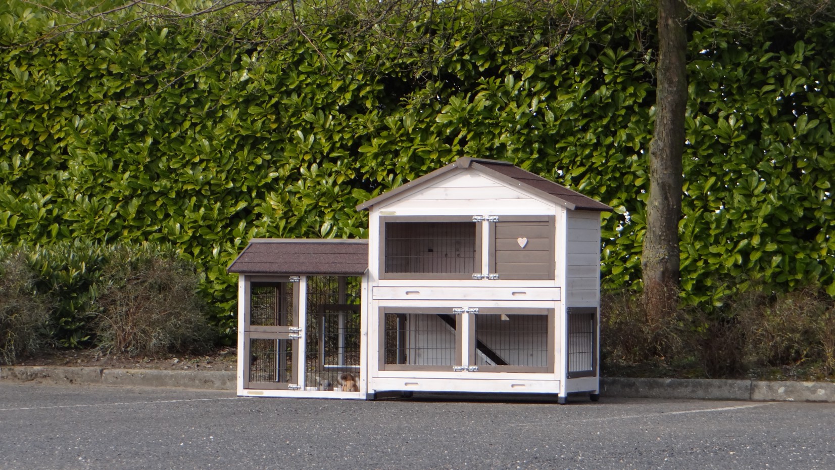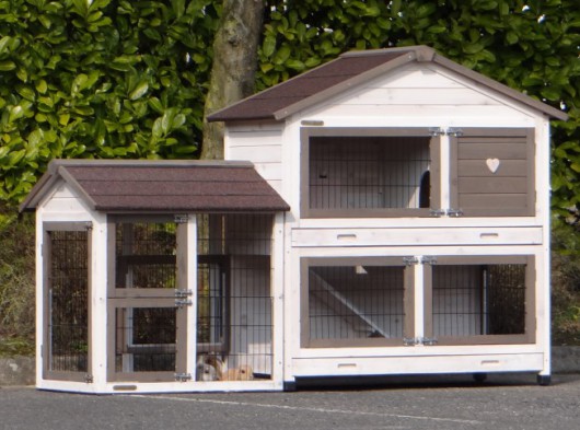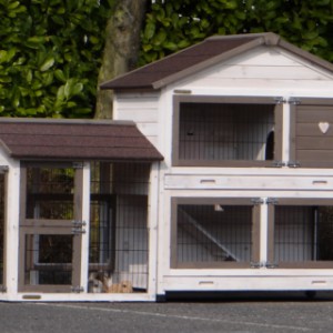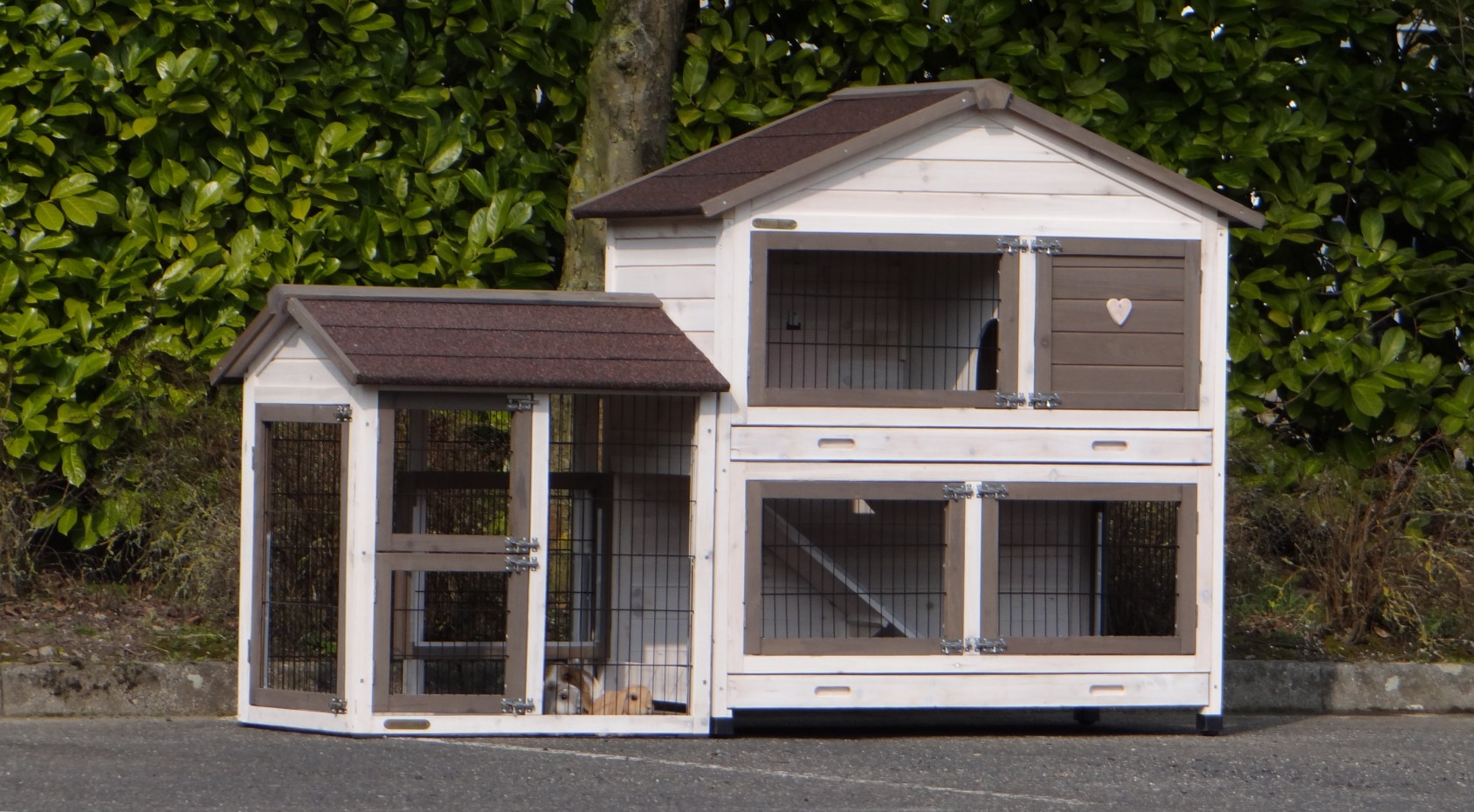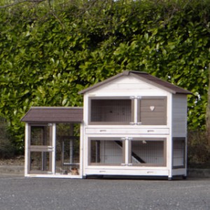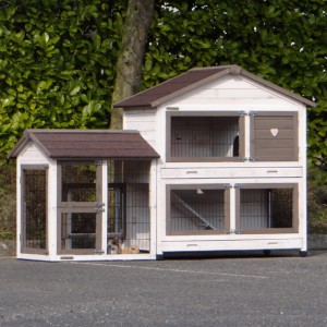 Le bois utilisé pour le loft est un produit naturel unique qu'a été produit dans le pays d'origine, après une sélection rigoureuse, dans une manière traditionelle. C'est caractéristique et unique à tous égards. Ce produit en bois a été un traitement manuel. Aucune pièce de bois ne possède la même forme, la même structure ou la même couleur, de sorte que les nuances de couleur sont inévitables, même dans un morceau de bois. Les fissures dues au vent, les craquelures, les imperfections et la présence de gros et de petits noeuds témoignent de leur origine et de leurs années de croissance. Les bosses sont généralement mises à jour manuellement avec du bois. Grâce à leur utilisation et à l’influence de la lumière, les nouveaux maisons pour animaux auront une couleur plus chaude au fil du temps. Les différences de couleur au modèle d'exposition sont donc possibles. L'enclos pour animaux est munie d'un fini antitache dans les couleurs comme sur la photo. Vous devez encore décaper le bois pour éviter les moisissures et la pourriture. Vous pouvez facilement commander des taches directement.