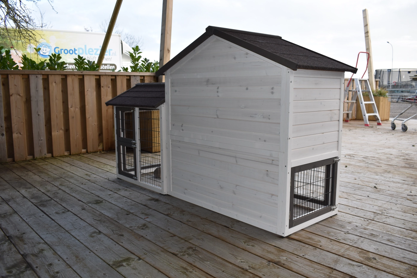 - Pour combiner enclos et poulailler, un panneau de treillis et / ou une porte doit être enlevé