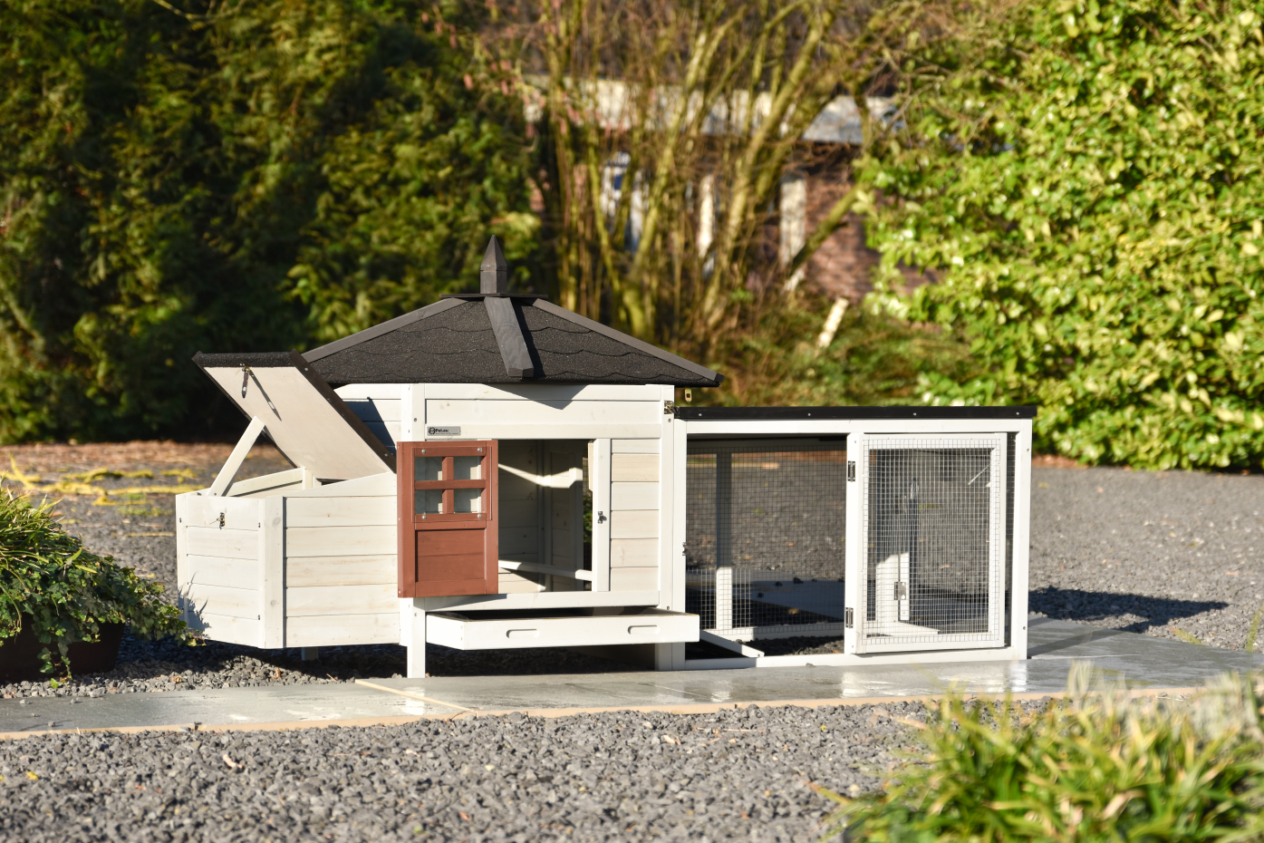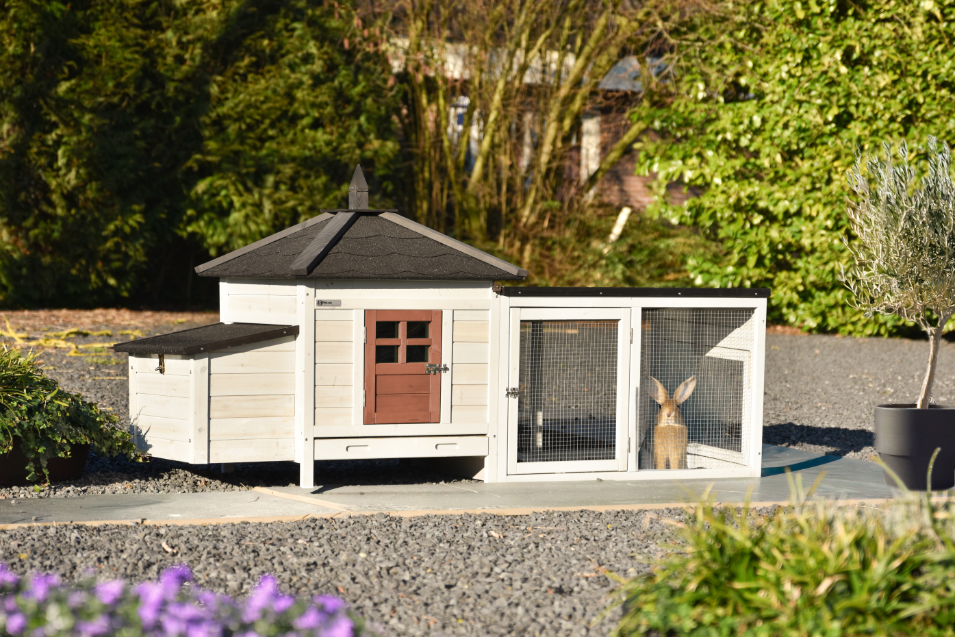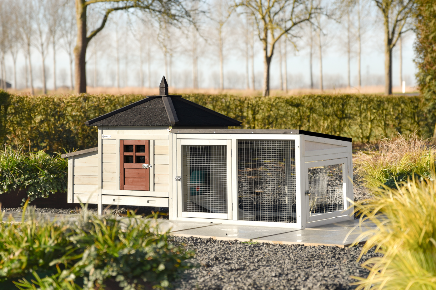 Clapier Ambiance Small avec enclos est un véritable point de mire dans le jardin et combine une belle apparence avec un usage pratique. Le clapier est équipé d’un tiroir coulissant en plastique pour un nettoyage facile, d’un toit entièrement amovible pour un accès supplémentaire et d’une porte latérale qui sert aussi de rampe. L’enclos est doté d’un toit avec feutre de toiture afin que les lapins puissent rester dehors à l’abri même lorsqu’il pleut