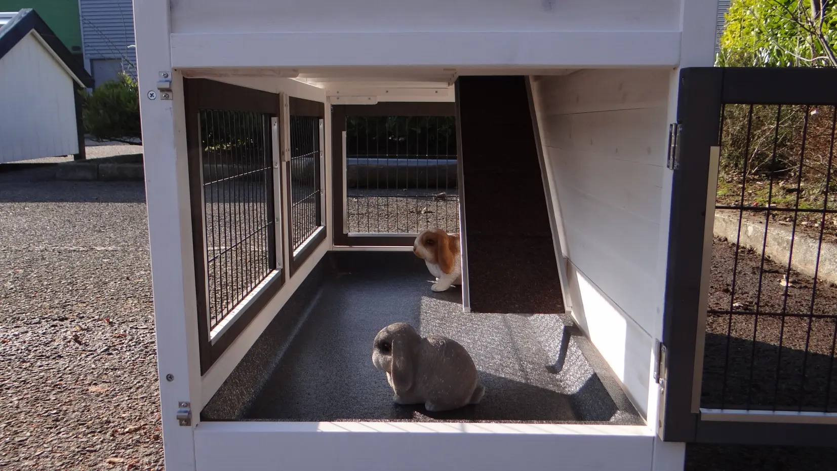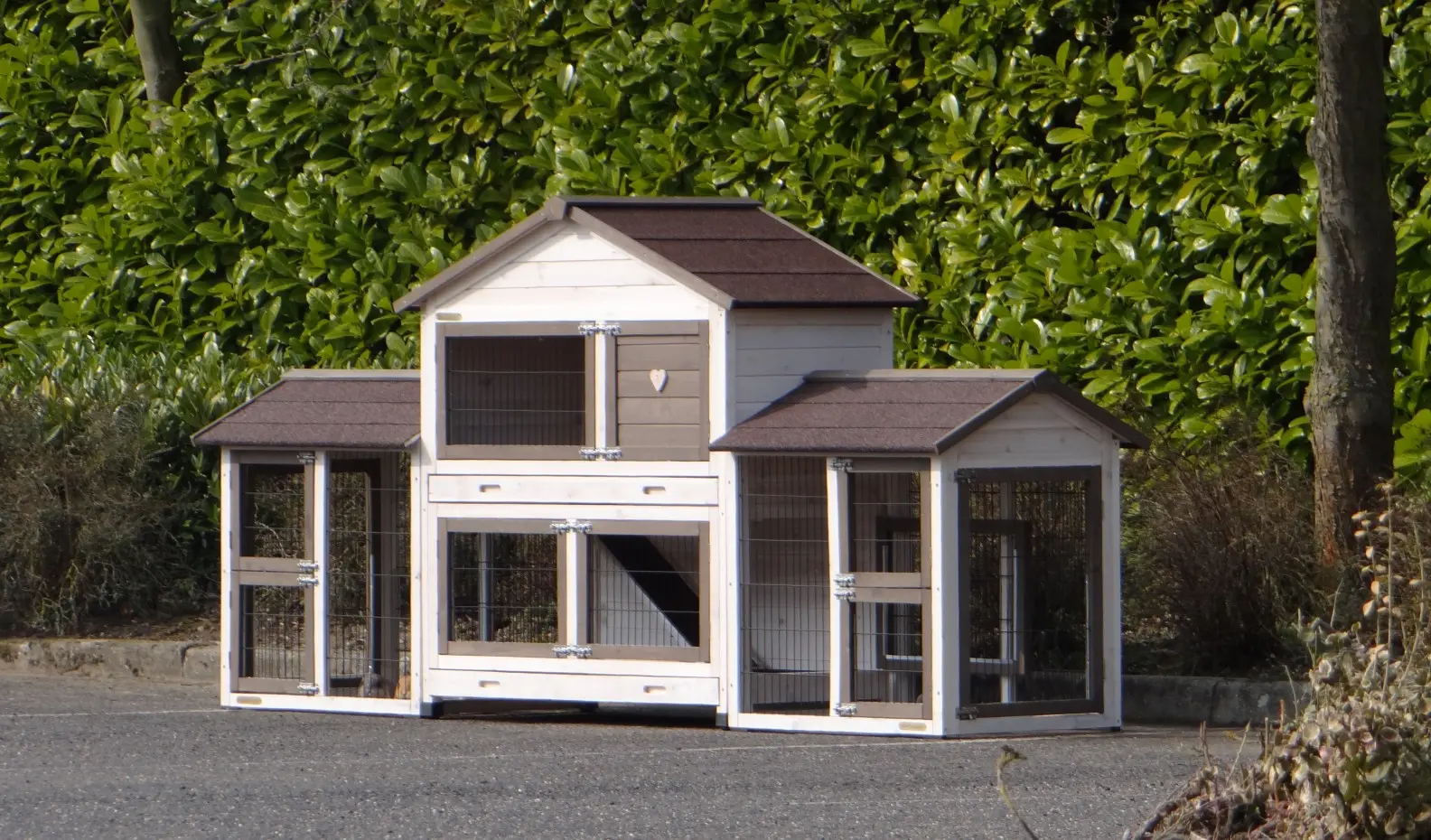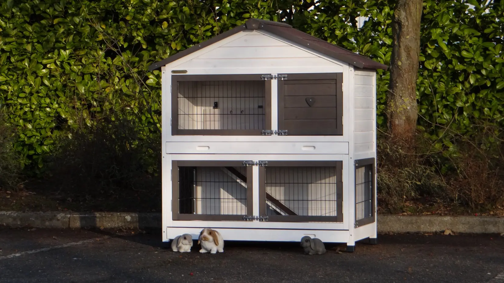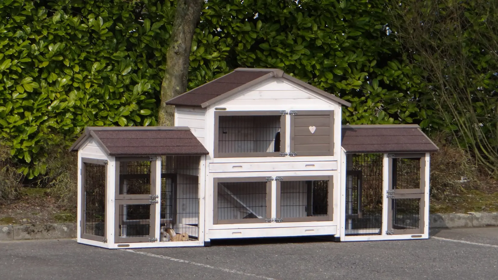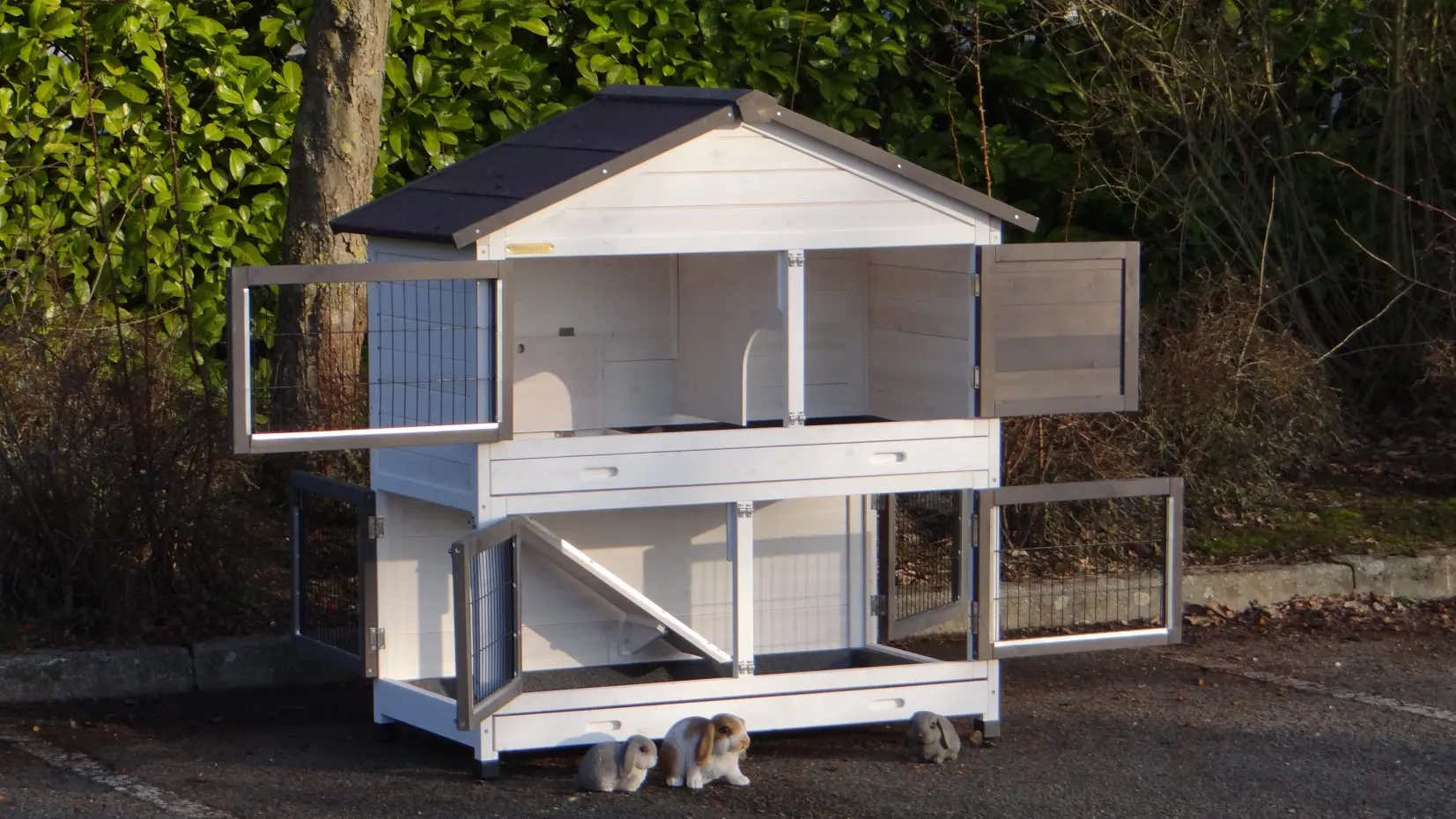 Le Clapier Excellent Medium en élégant blanc lavé avec des accents brun-gris offre un confort optimal pour vos lapins et une convivialité pour vous. Avec deux tiroirs extra-profonds et un grenier pratique. Les portes spacieuses permettent d'ajouter facilement des enclos supplémentaires. Les bandes anti-mâchonnement en aluminium protègent le bois des rongeurs.